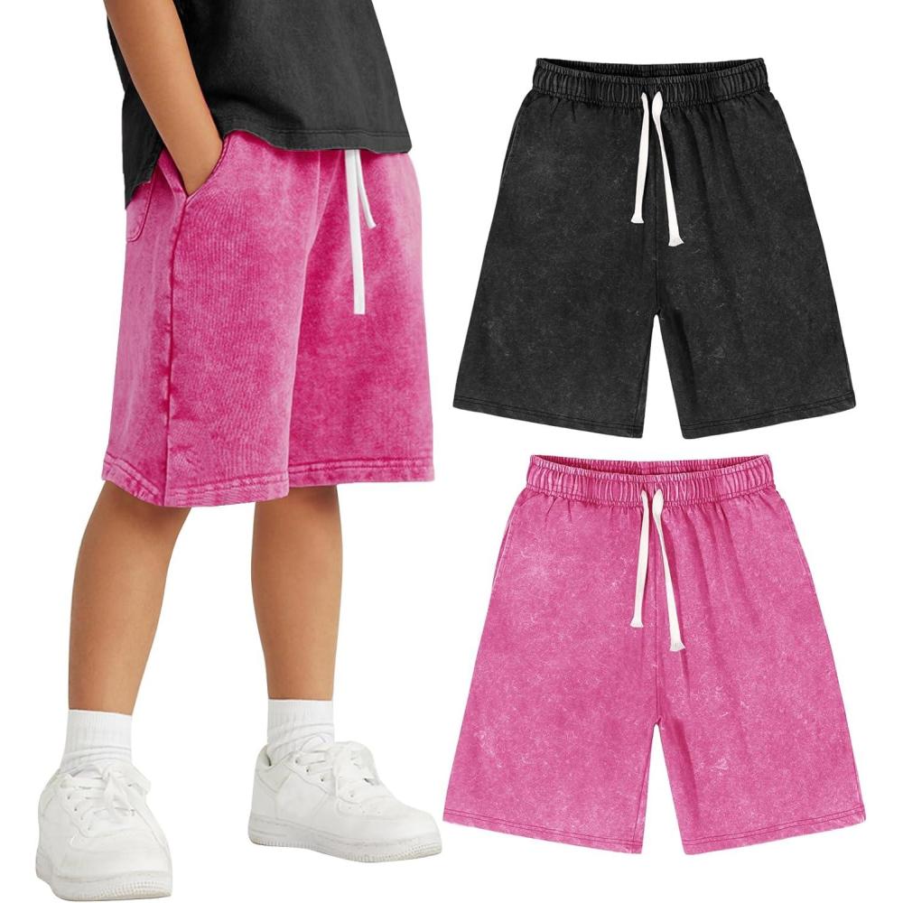 Flygo 2 Pack Boys Girls Cotton Shorts Acid Washed Active Pull On Jogger Shorts Kids Casual Athletic Loose Fit 5-14Y(Black+Rose-XLarge)