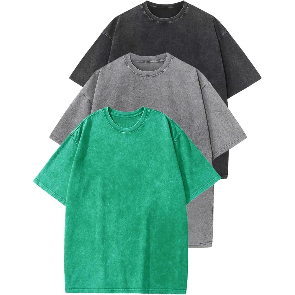 Flygo 3 Pack Men Oversized T Shirts Acid Washed Unisex Tee Loose Fit Short Sleeve Casual Streetwear Baggy Basic Tops(Black+grey+green)