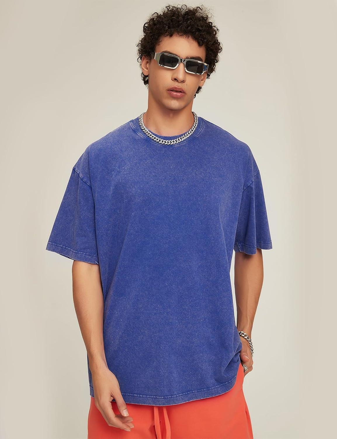 Flygo 3 Pack Men Oversized T Shirts Acid Washed Unisex Tee Loose Fit Short Sleeve Casual Streetwear Baggy Basic Tops(Blue)