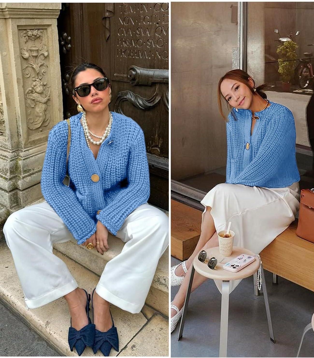 Flygo Cropped Cardigan Sweaters for Women Long Sleeve Cable Knit Cardigan Open Front Chunky Cardigan Sweaters with Pockets(Blue)