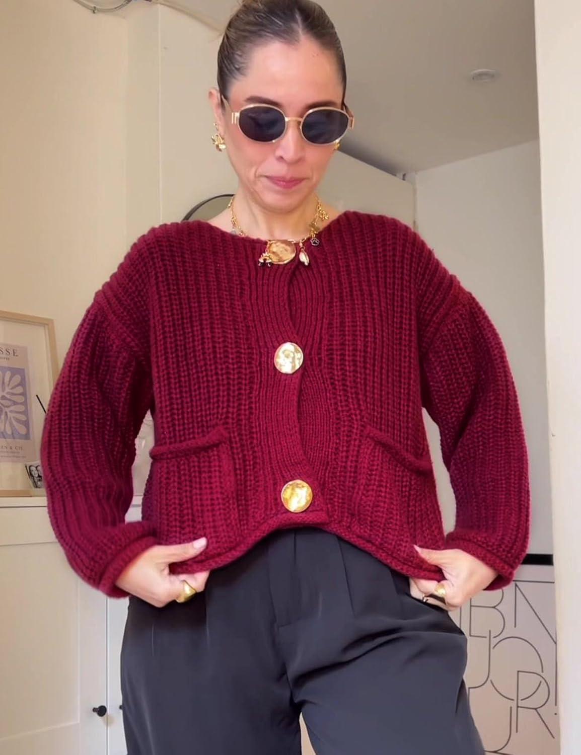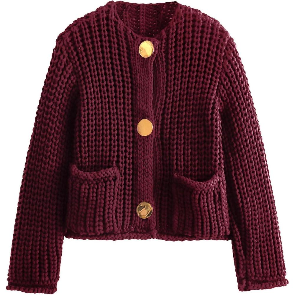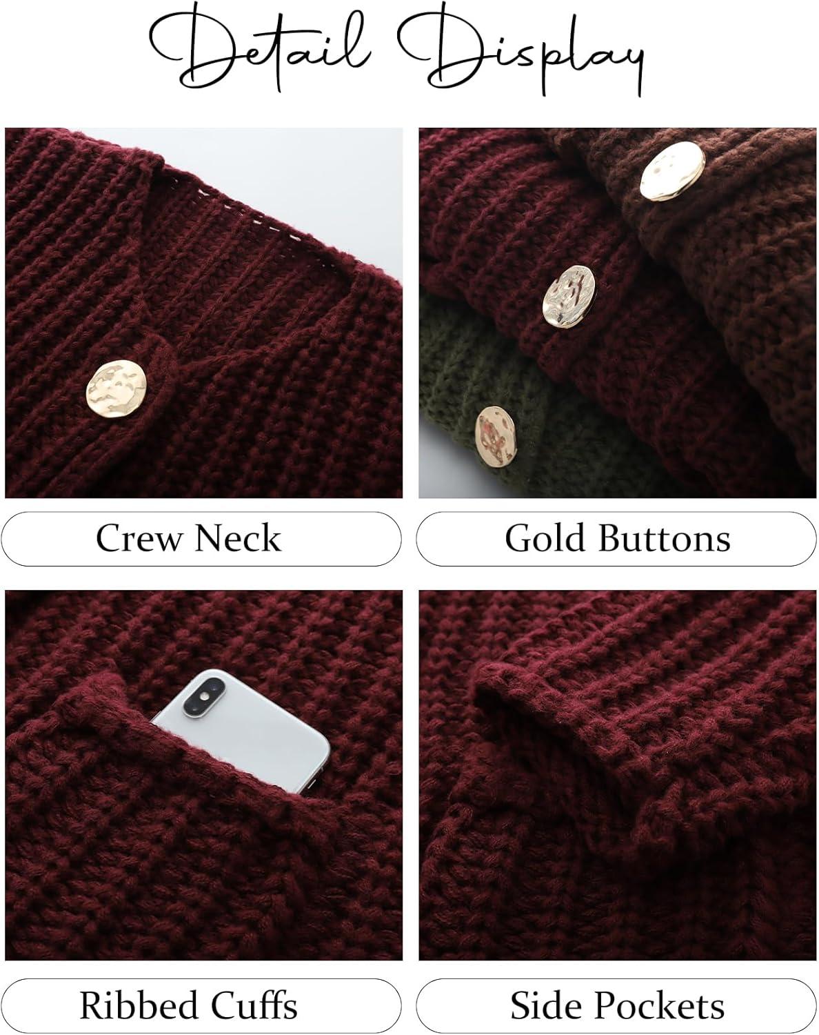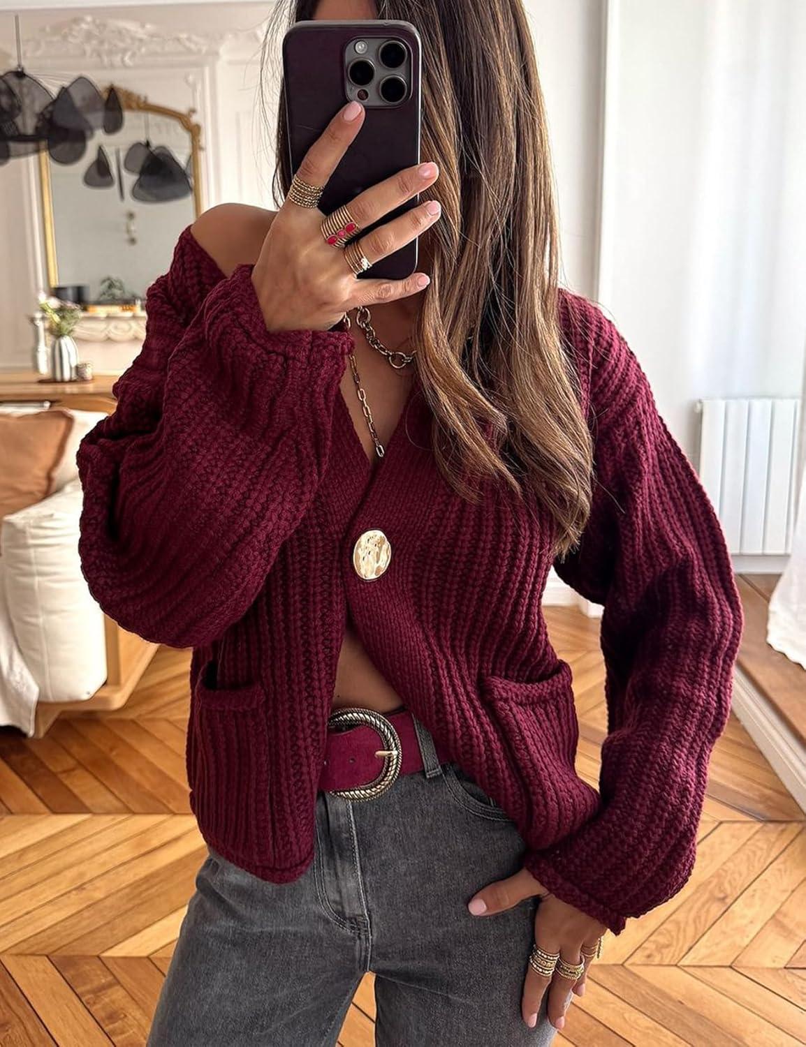 Flygo Cropped Cardigan Sweaters for Women Long Sleeve Cable Knit Cardigan Open Front Chunky Cardigan Sweaters with Pockets(Dark Red)