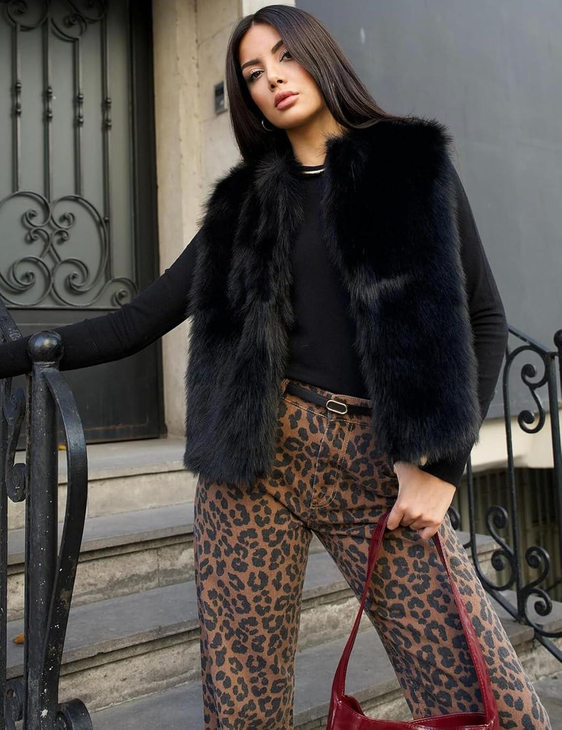 Flygo Faux Fur Vest Women Sleeveless Faux Fur Jacket Furry Open Front Cardigan Top Fluffy Winter Vest Outerwear(Black)