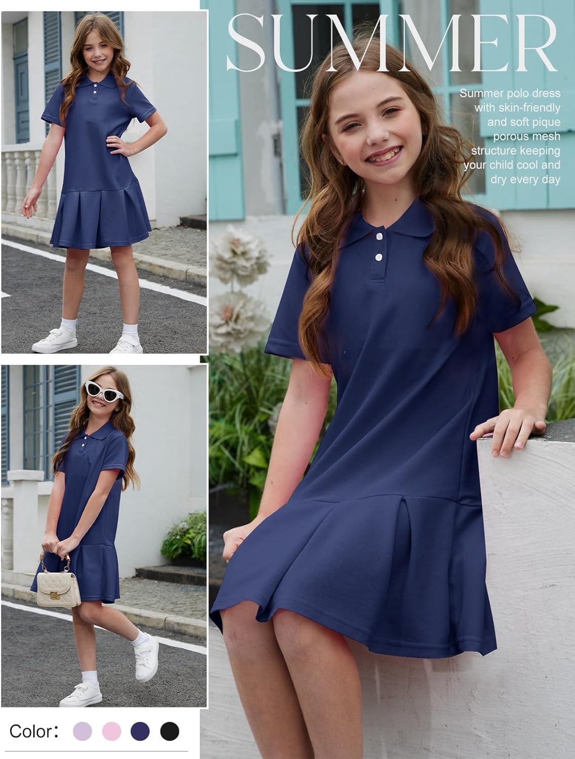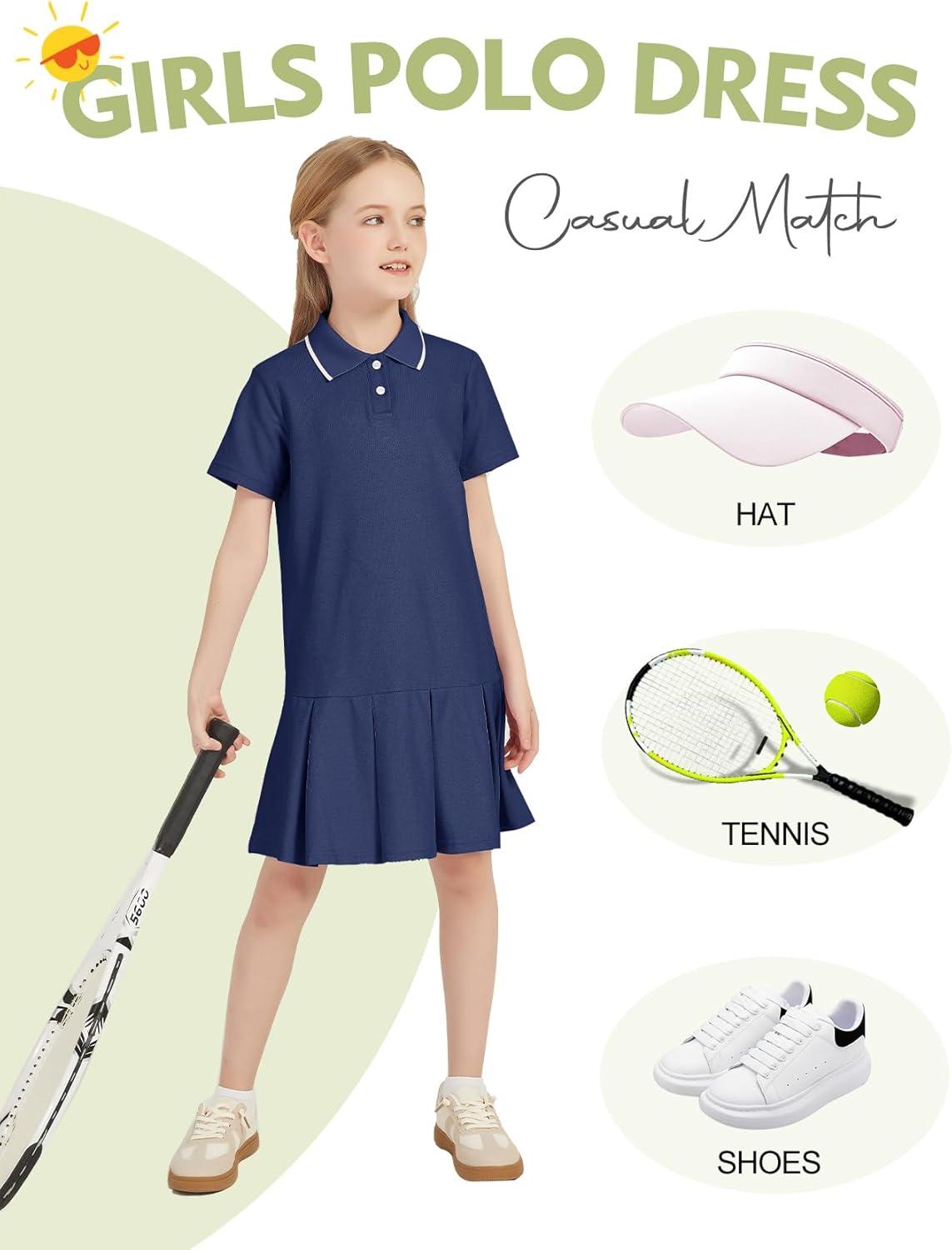 Flygo Girls Athletic Polo Dress for Tennis Golf, Breathable Pique with Ruffle Trim, Short Sleeve Summer Active Sports Dresses(Navy)