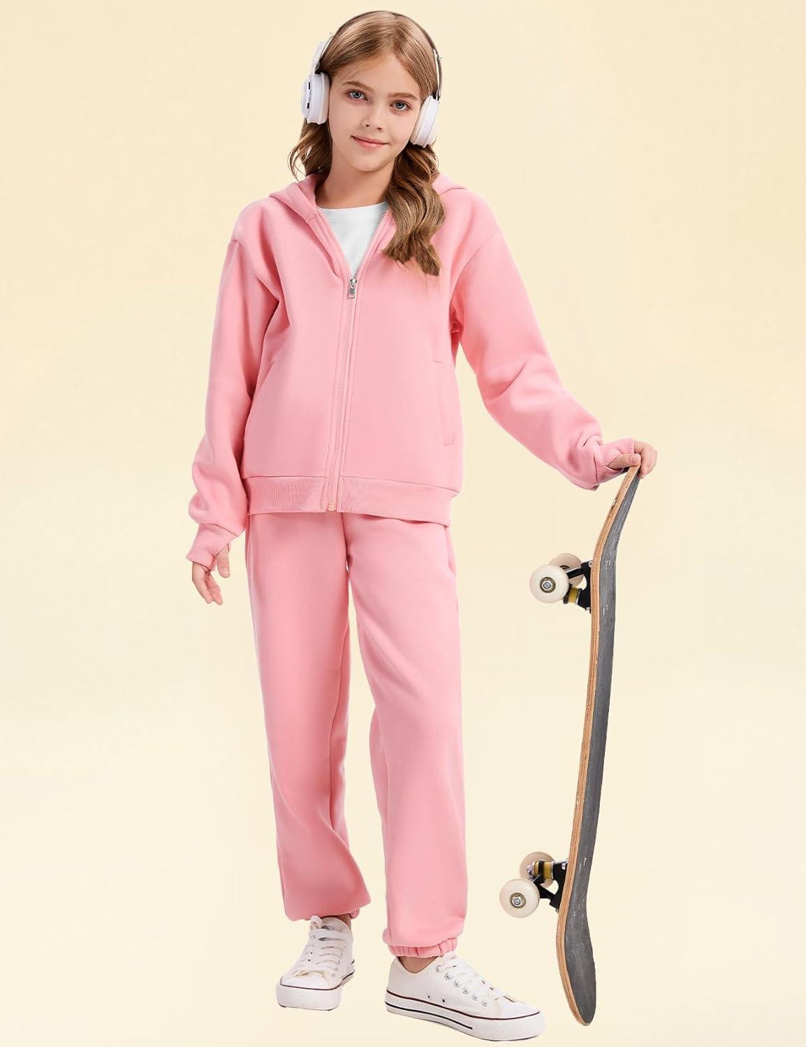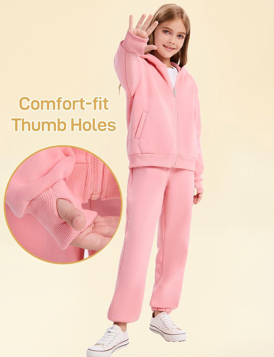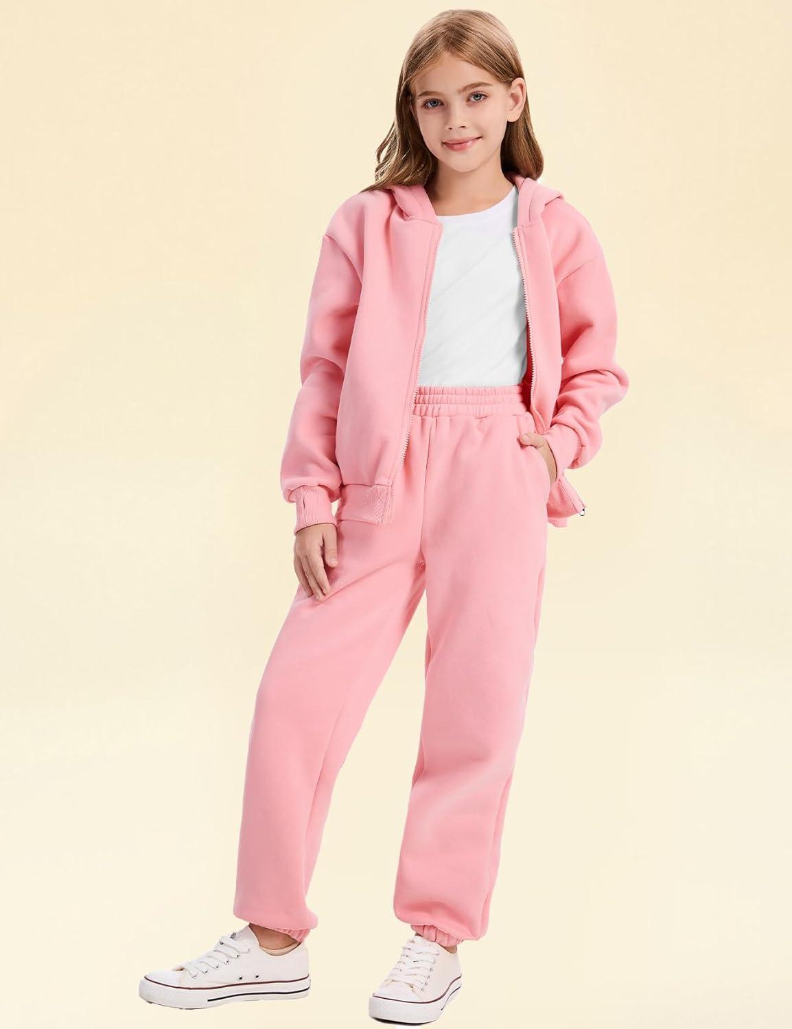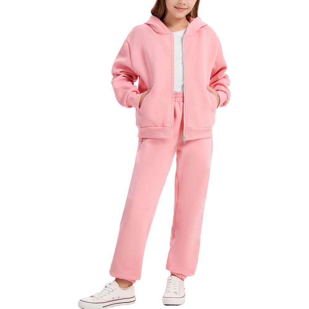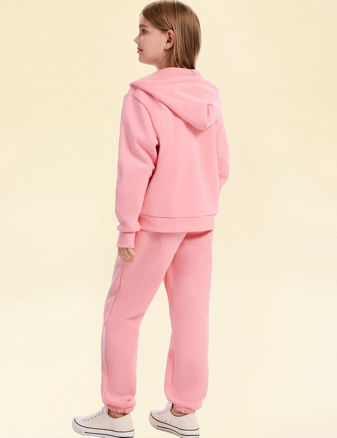 Flygo Girls Boys Fleece Sweatsuit 2 Piece Jogger Sets Zip Up Hooded Sweatshirts and Sweatpants with Pockets(Pink)