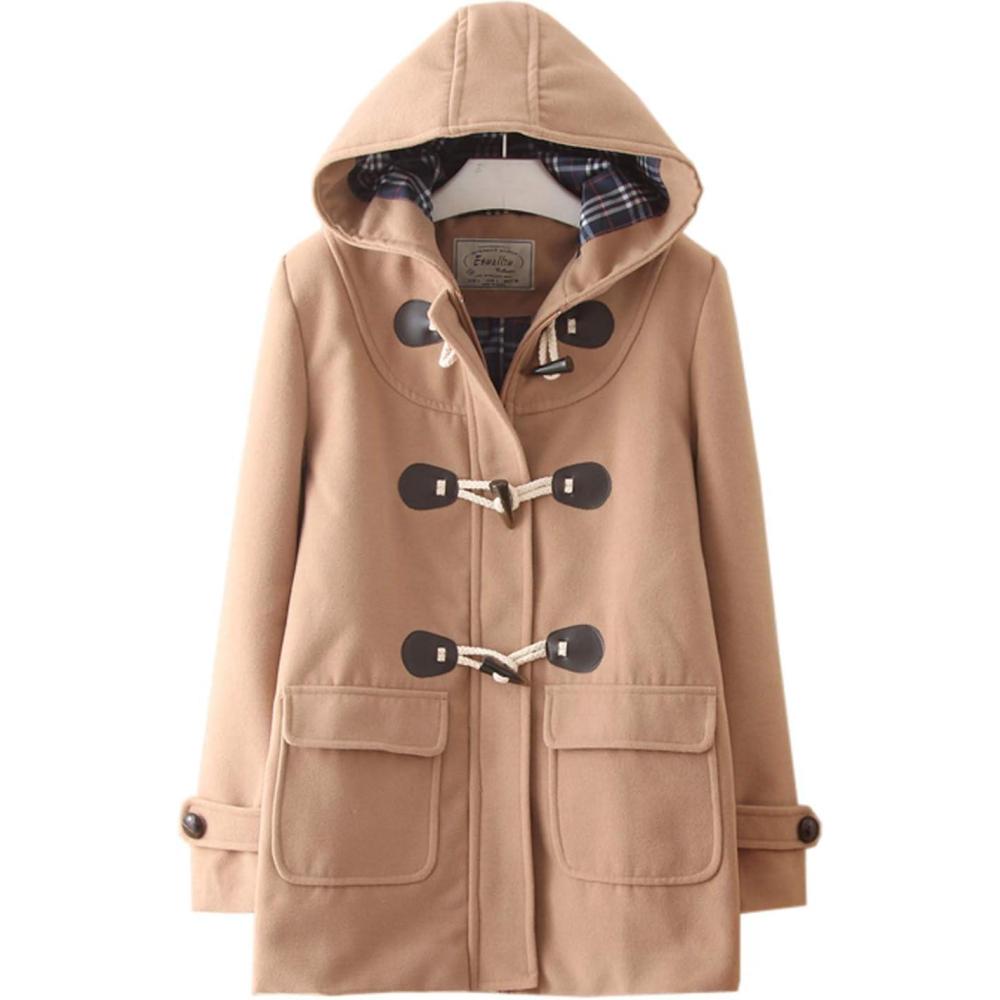 Flygo Women's Classic Horn Button Duffle Coat Hooded Wool Blended Pea Coat
