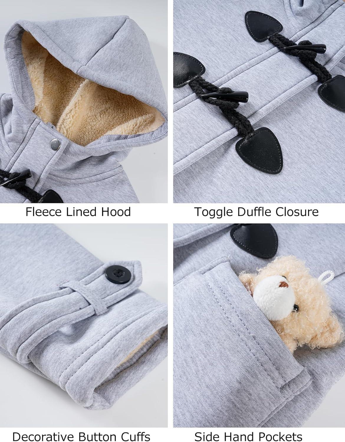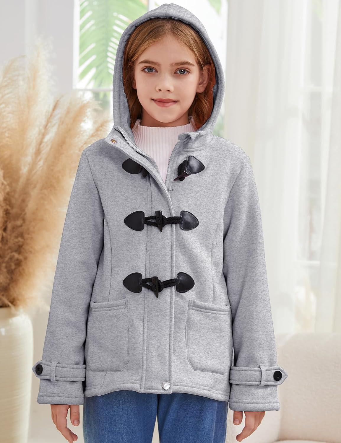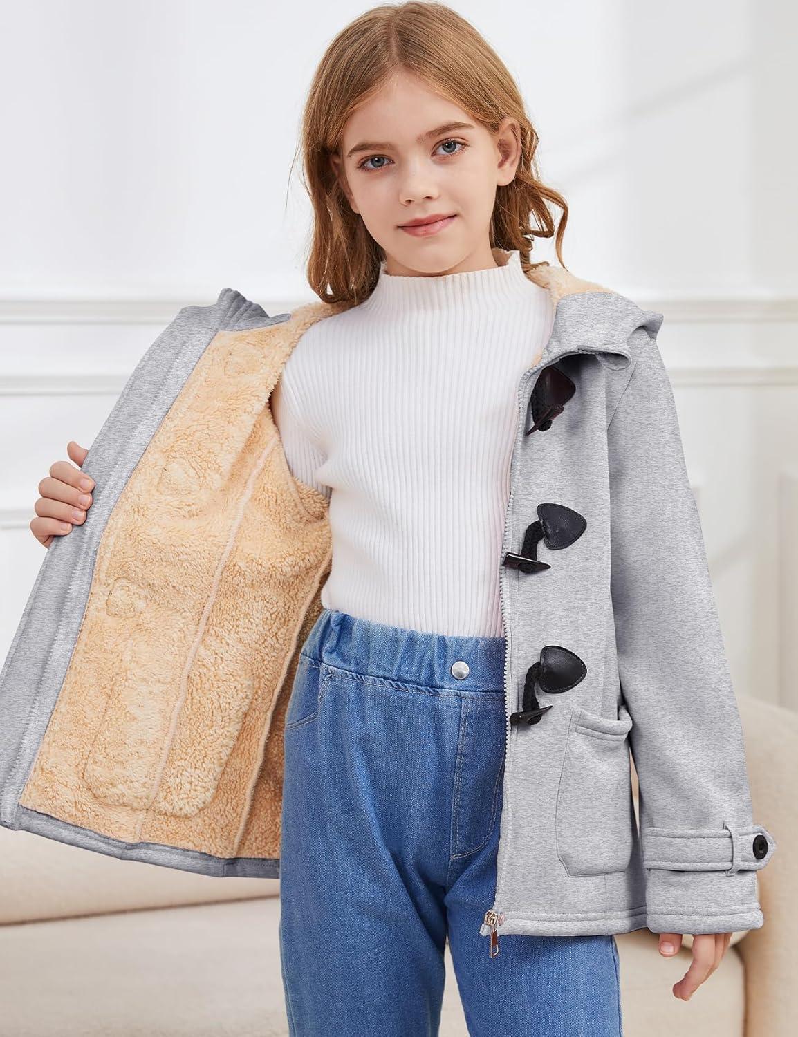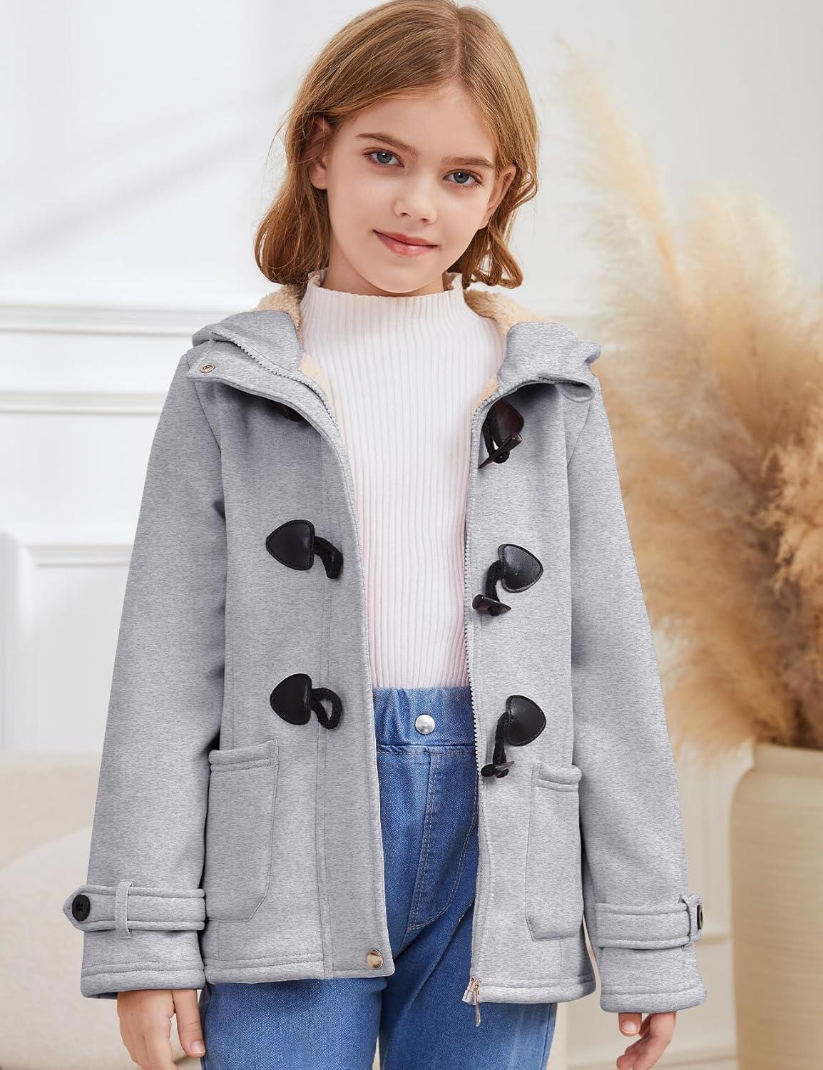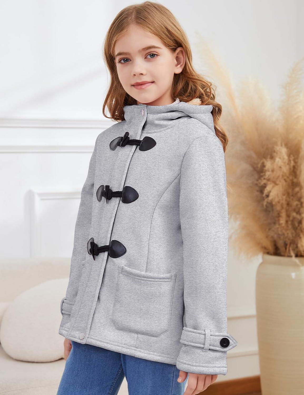Flygo Girls Fleece Jacket Sherpa Lined Hoodie Horn Button Duffle Coat Warm Winter Coats Jackets (5-14 Years)(Light Grey)