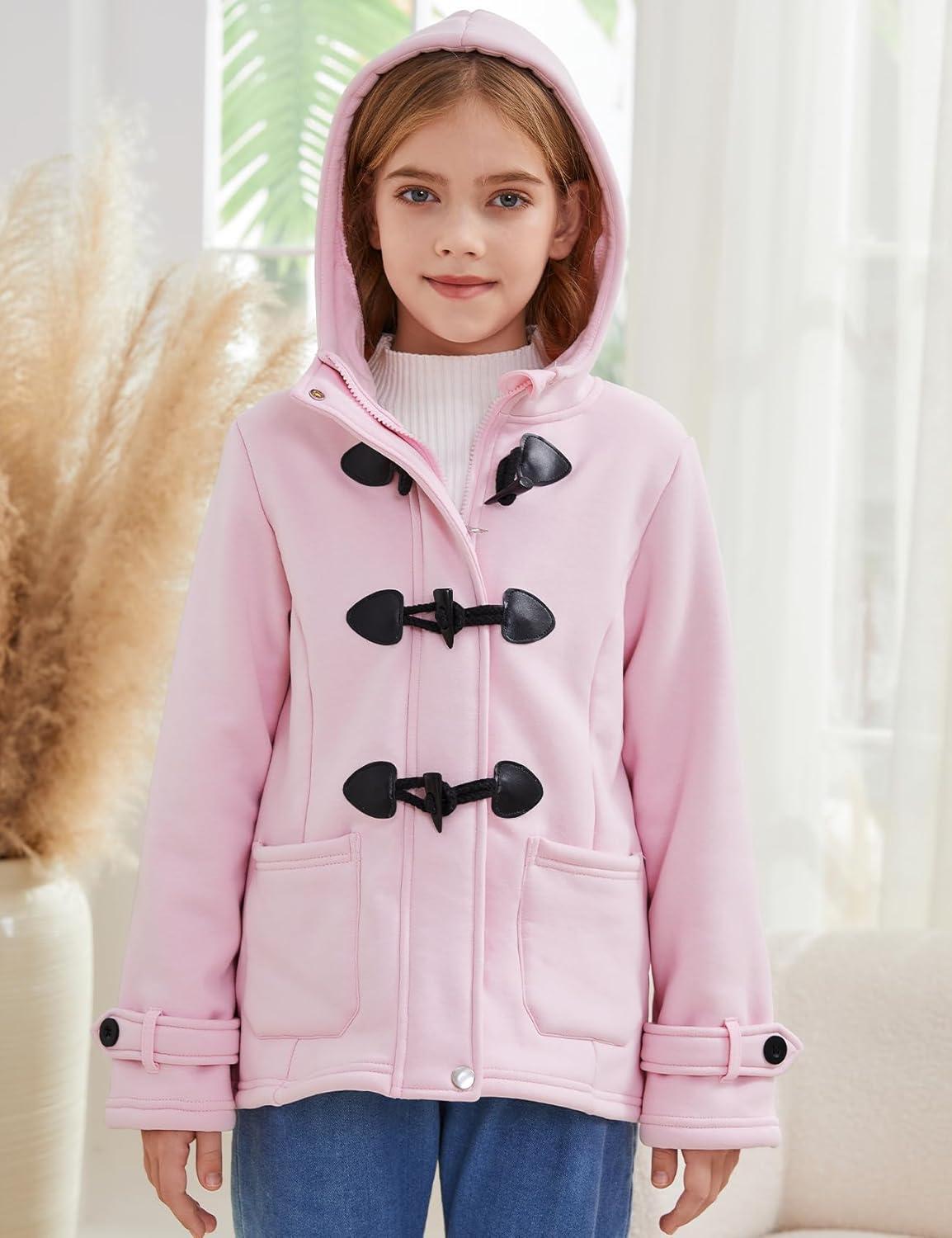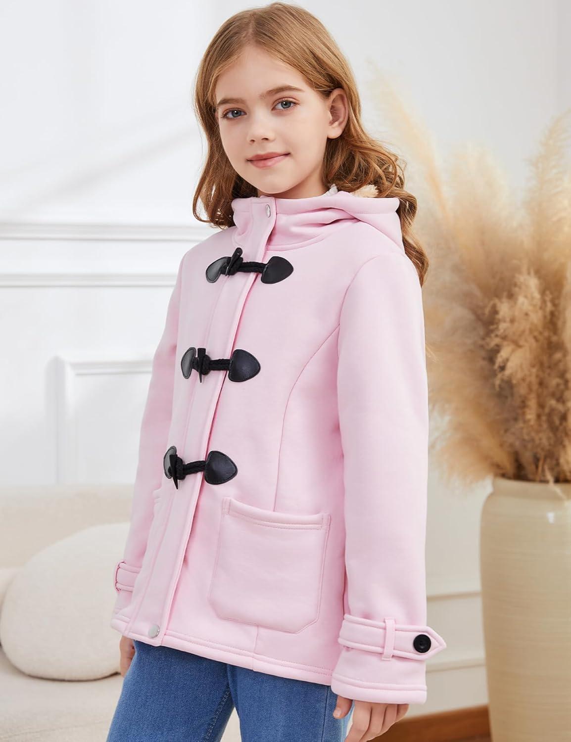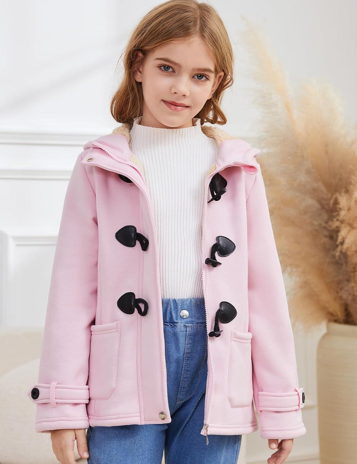 Flygo Girls Fleece Jacket Sherpa Lined Hoodie Horn Button Duffle Coat Warm Winter Coats Jackets (5-14 Years)(Pink)