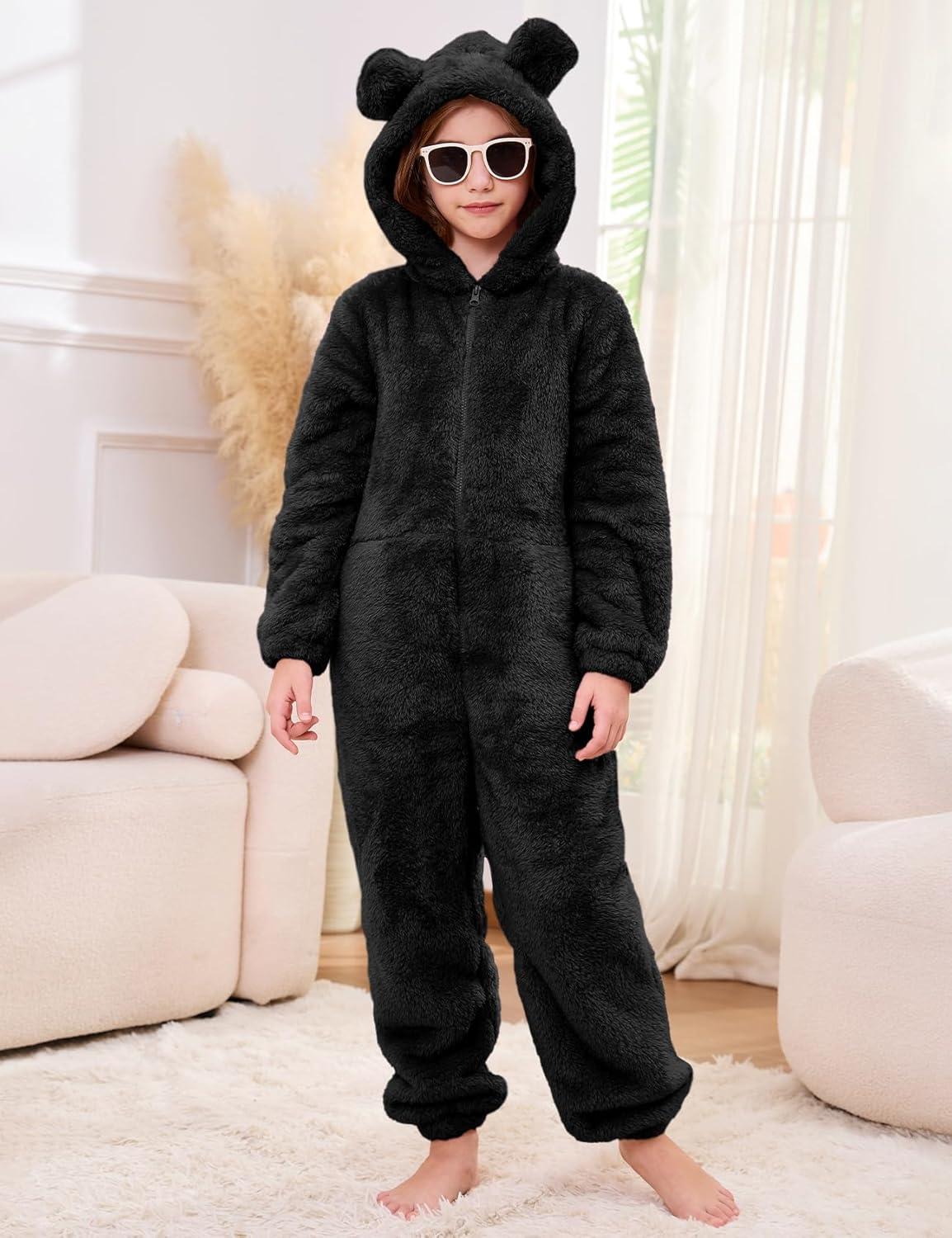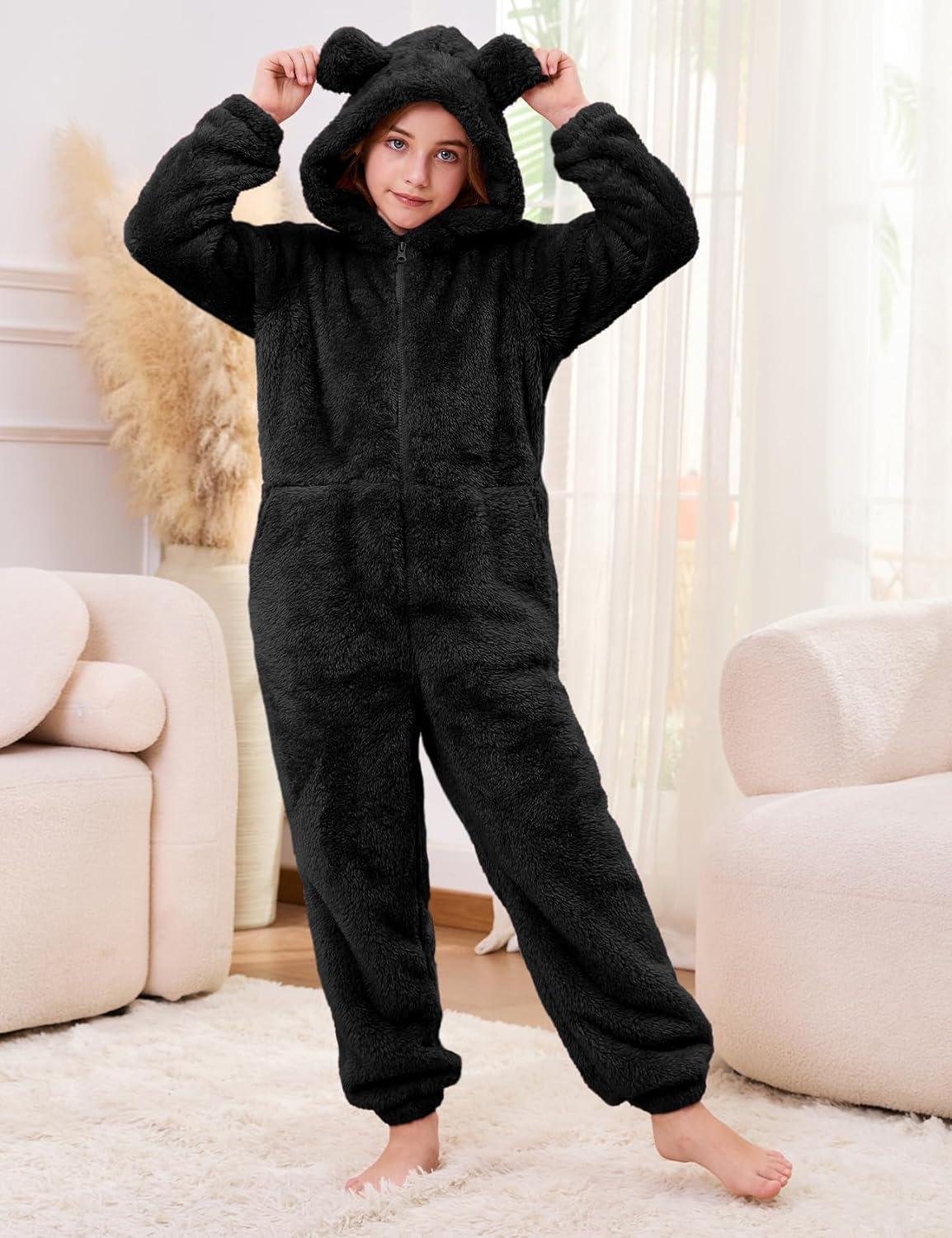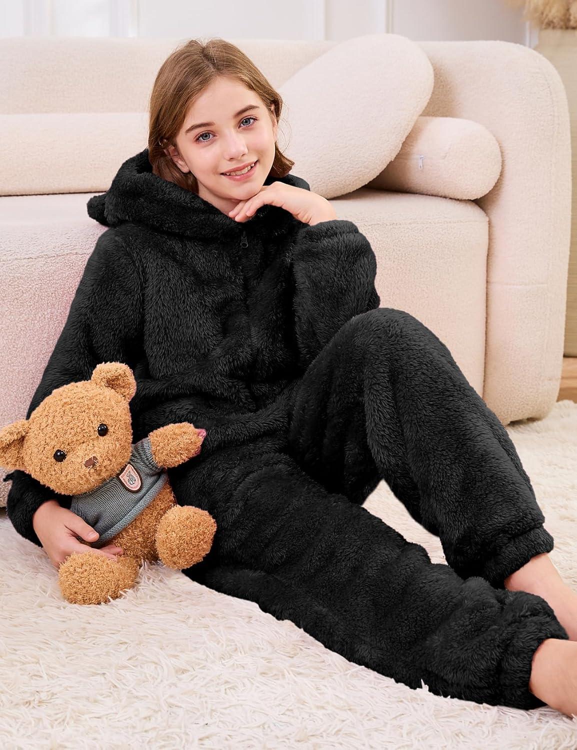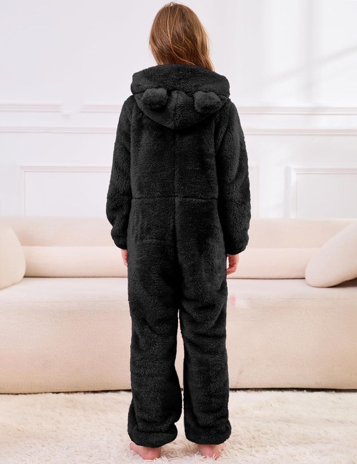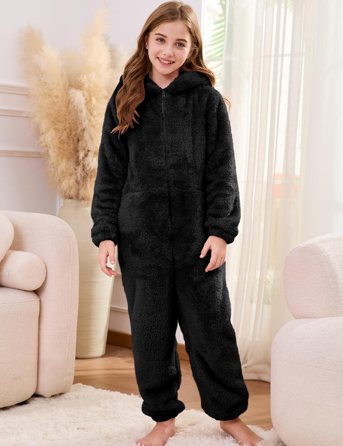 Flygo Girls Fleece Jumpsuits Fuzzy Hooded Rompers Kids Zip up Onesie Romper Costume Warm Winter Clothes 5-14 Years(Black)