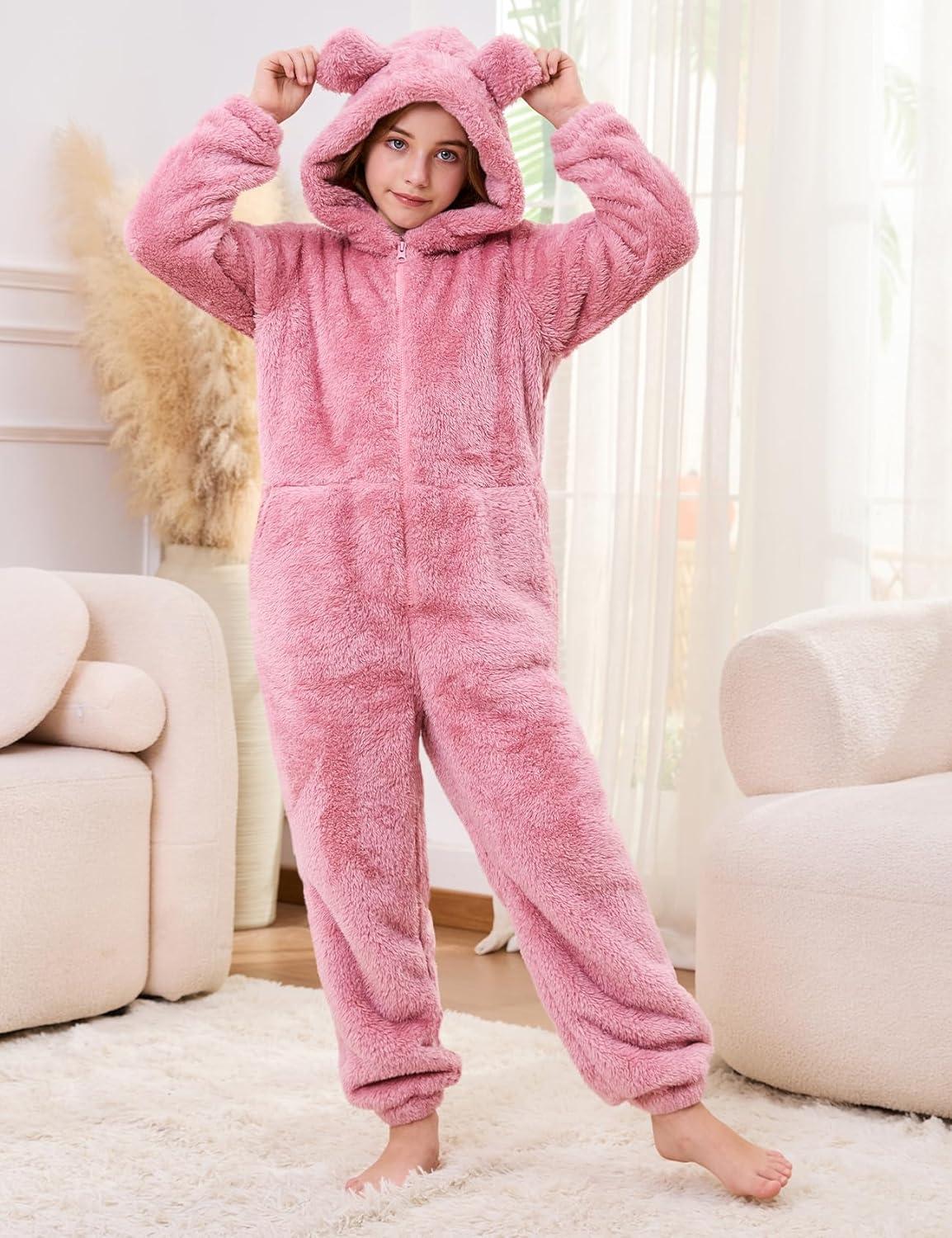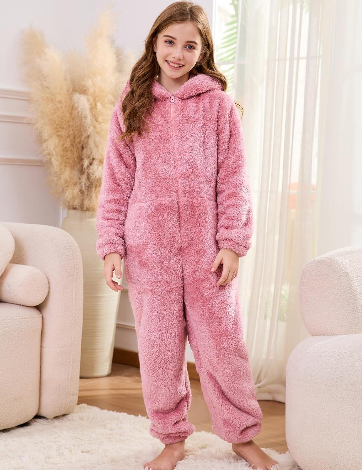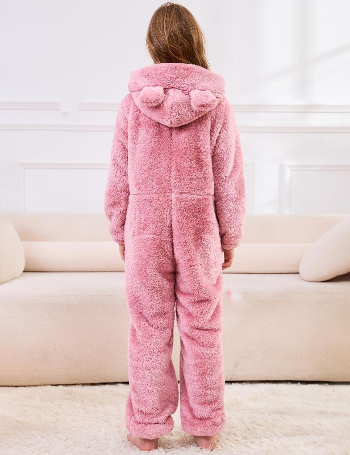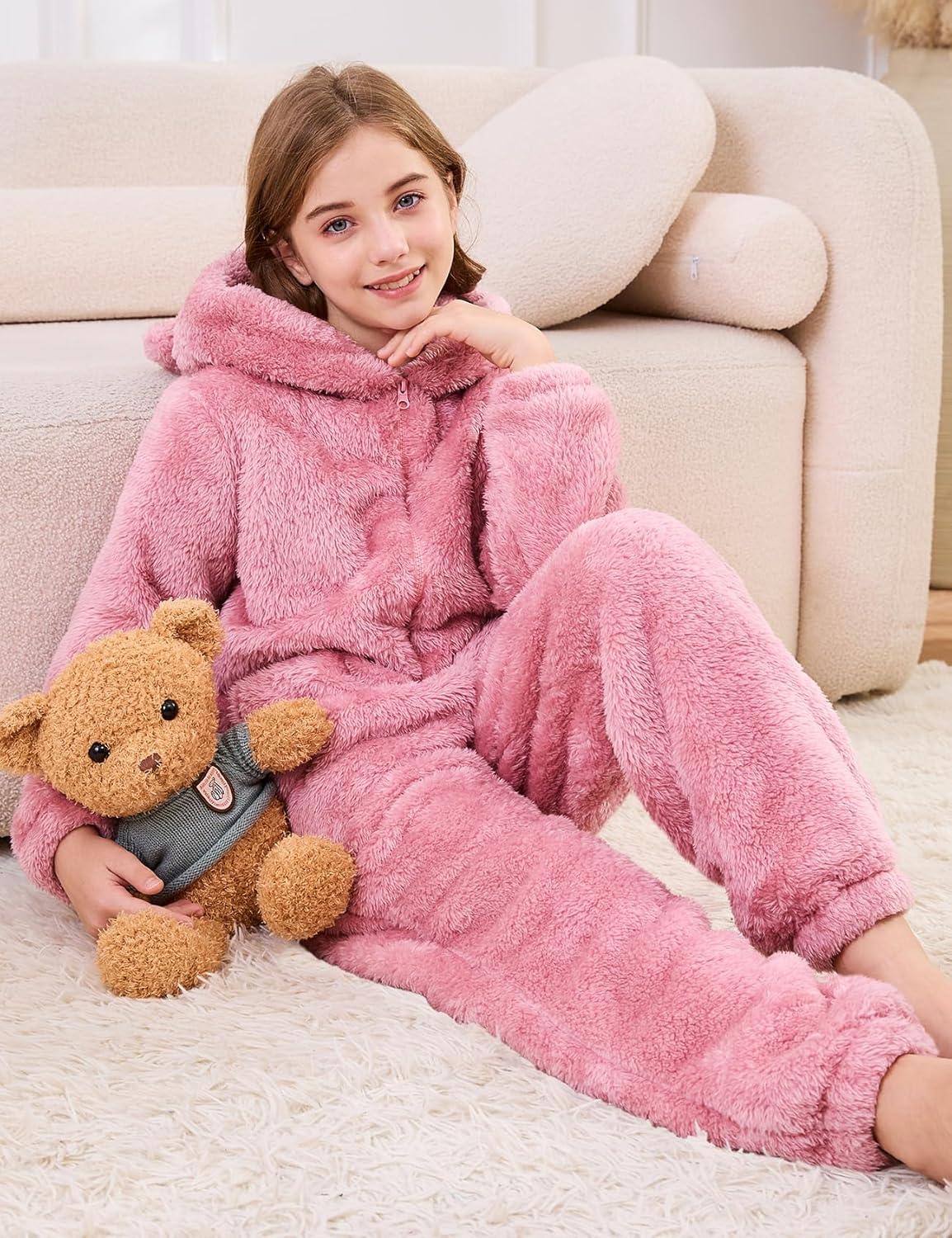 Flygo Girls Fleece Jumpsuits Fuzzy Hooded Rompers Kids Zip up Onesie Romper Costume Warm Winter Clothes 5-14 Years(Pink)