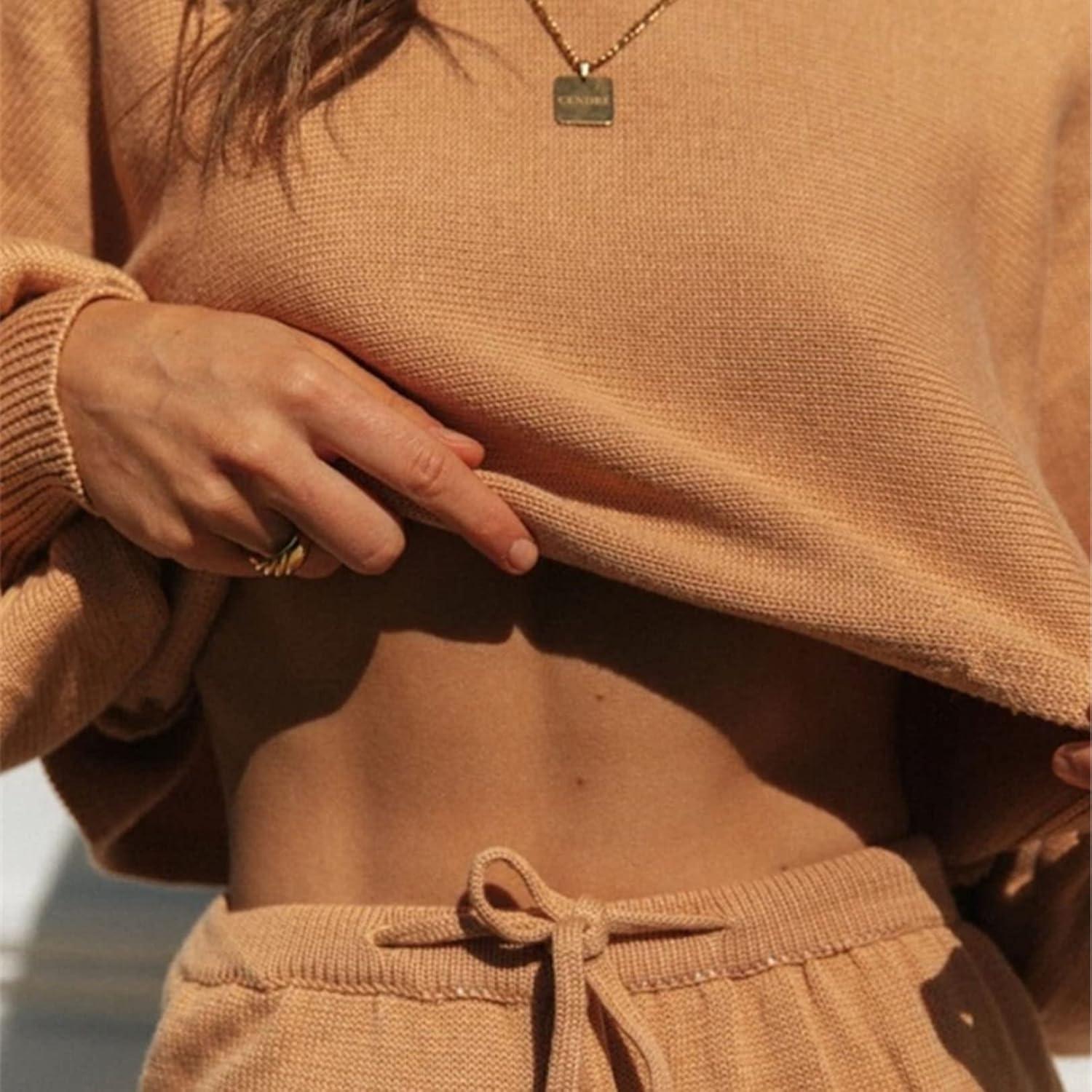 Knitted jogging set 2 piece for women, loose fitting crop tops, suitable for sports and lounge.