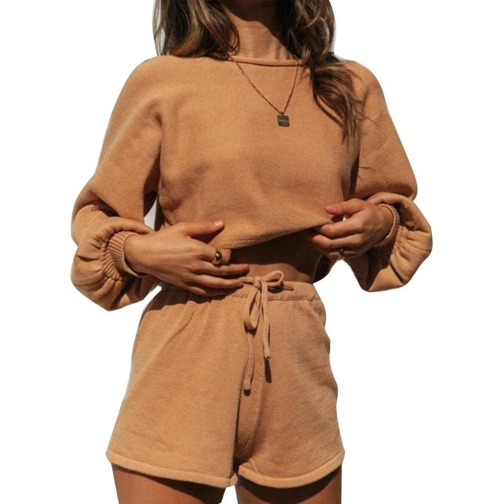 Flygo Lougewear for Women 2 Piece Knitted Jogging Suits Long Sleeve Pajamas Shorts Sweatsuit Sets(Brown)