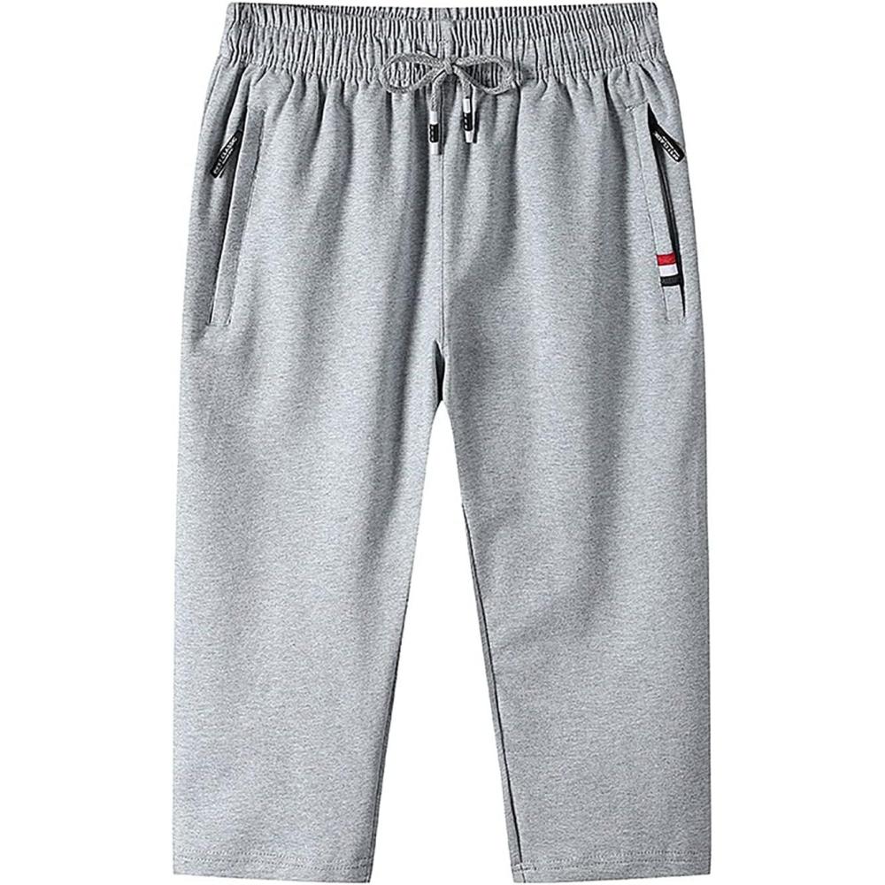 Flygo Men’s Cotton Casual Shorts 3/4 Jogger Capri Pants Below Knee Cropped Pants Zipper Pockets(02 Light Grey)