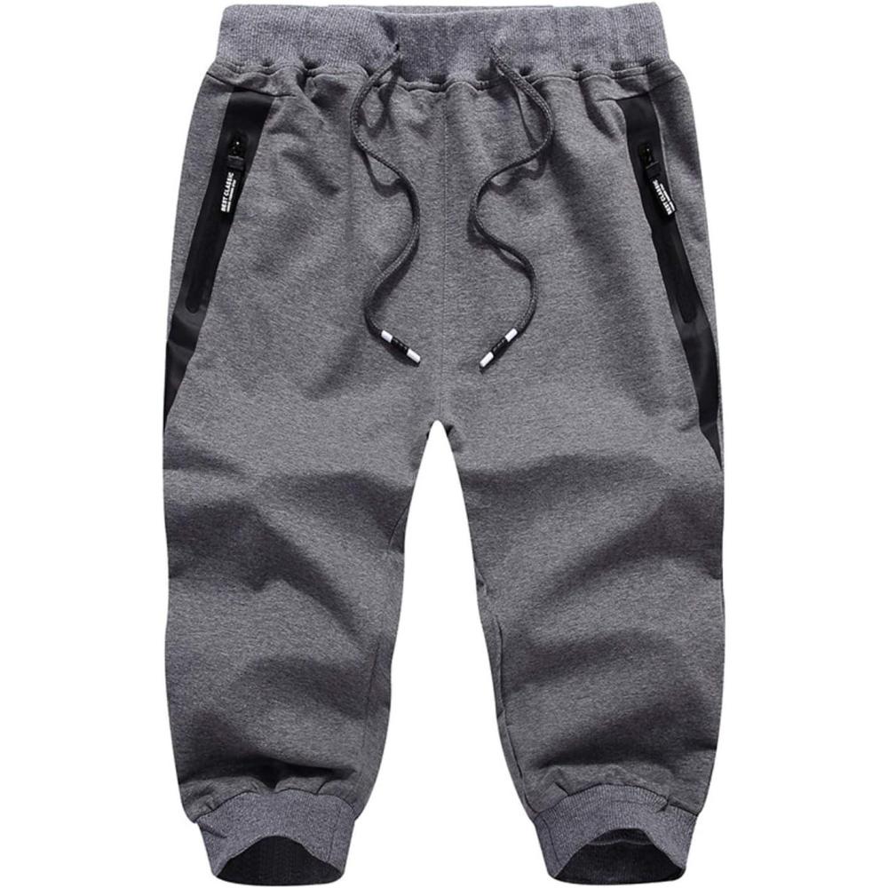 Flygo Men’s Cotton Casual Shorts 3/4 Jogger Capri Pants Below Knee Cropped Pants Zipper Pockets(Dark Grey)
