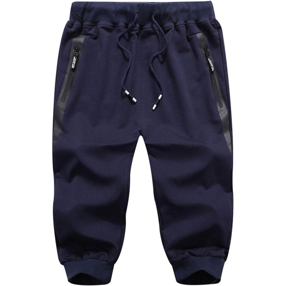 Flygo Men’s Cotton Casual Shorts 3/4 Jogger Capri Pants Below Knee Cropped Pants Zipper Pockets(02 Navy)