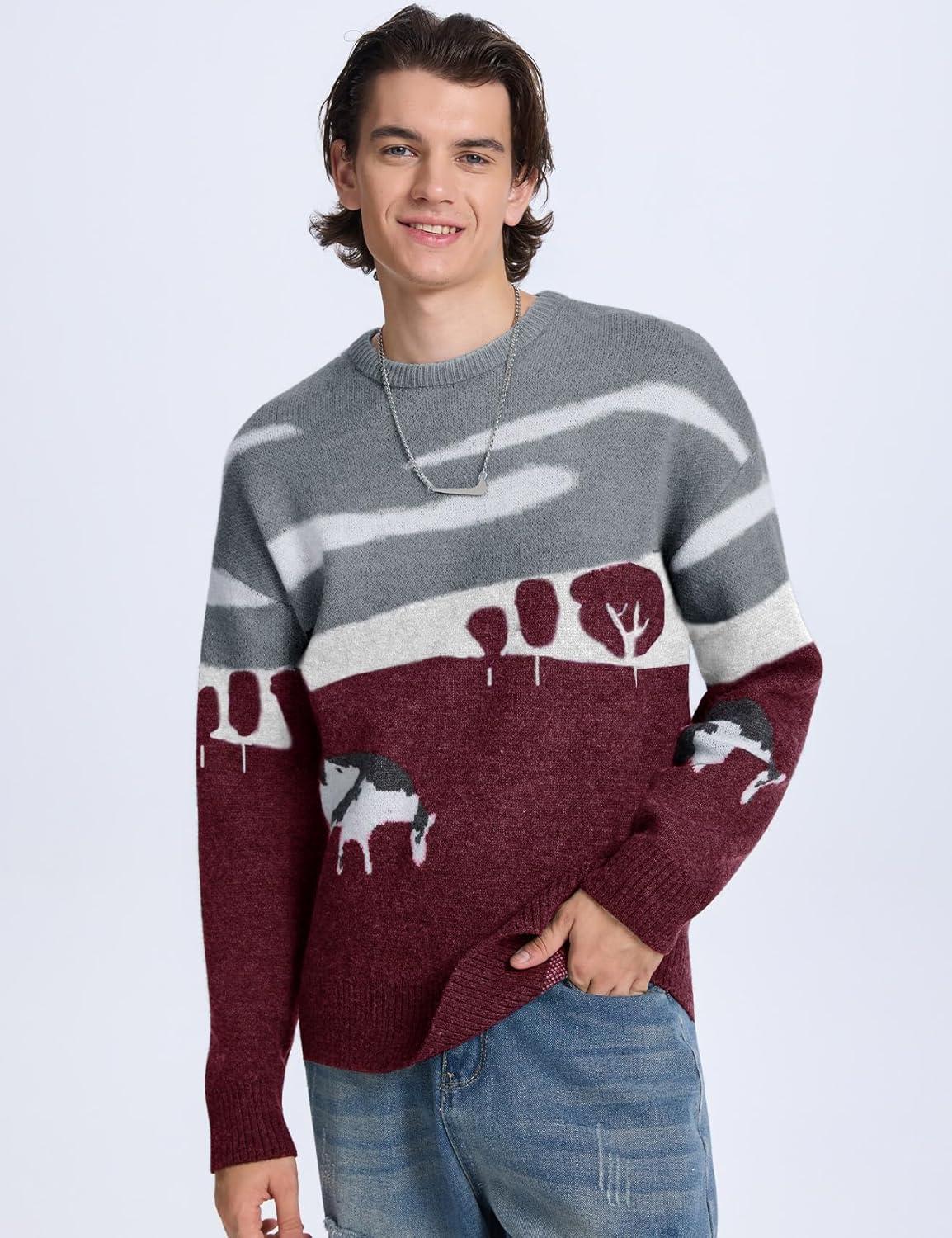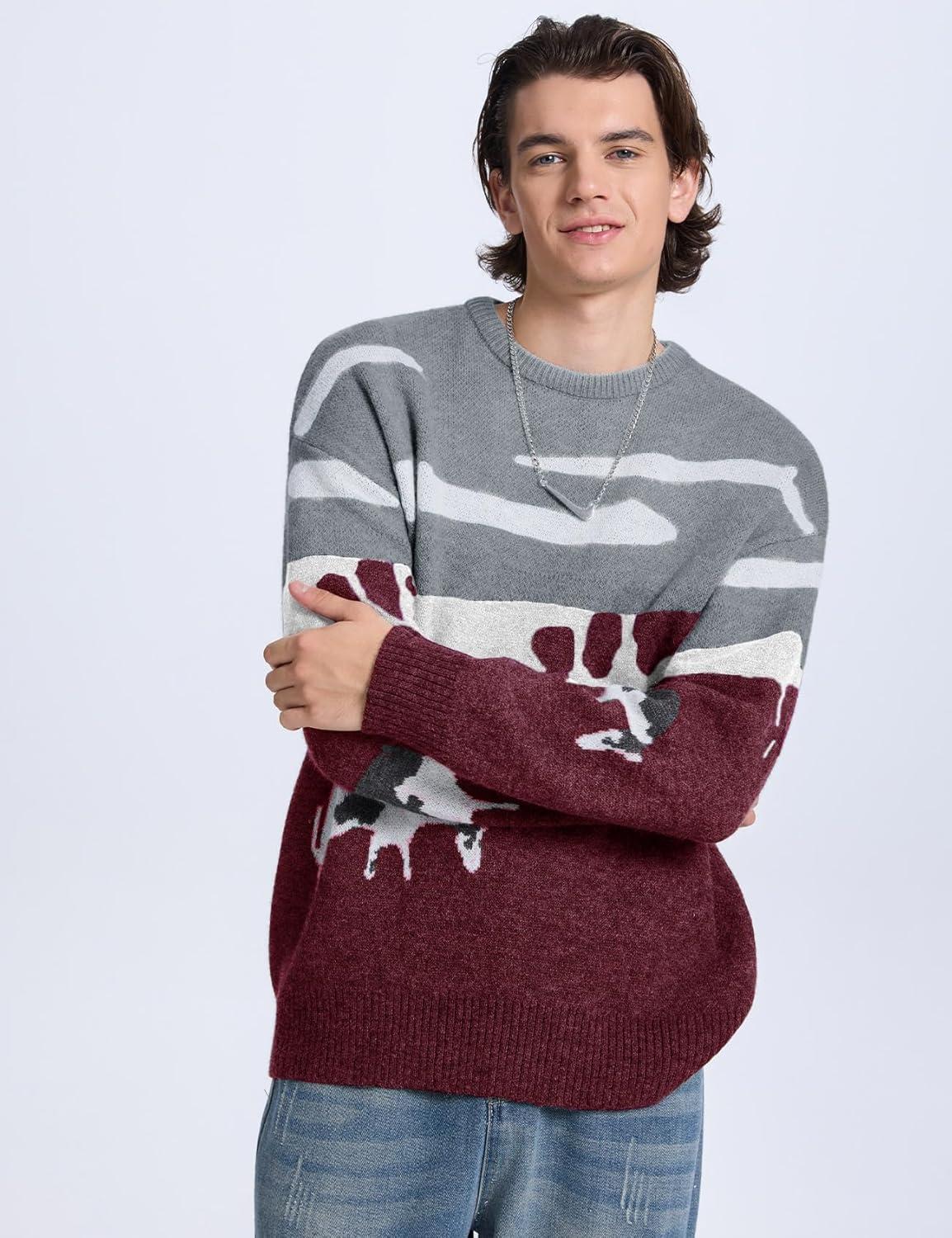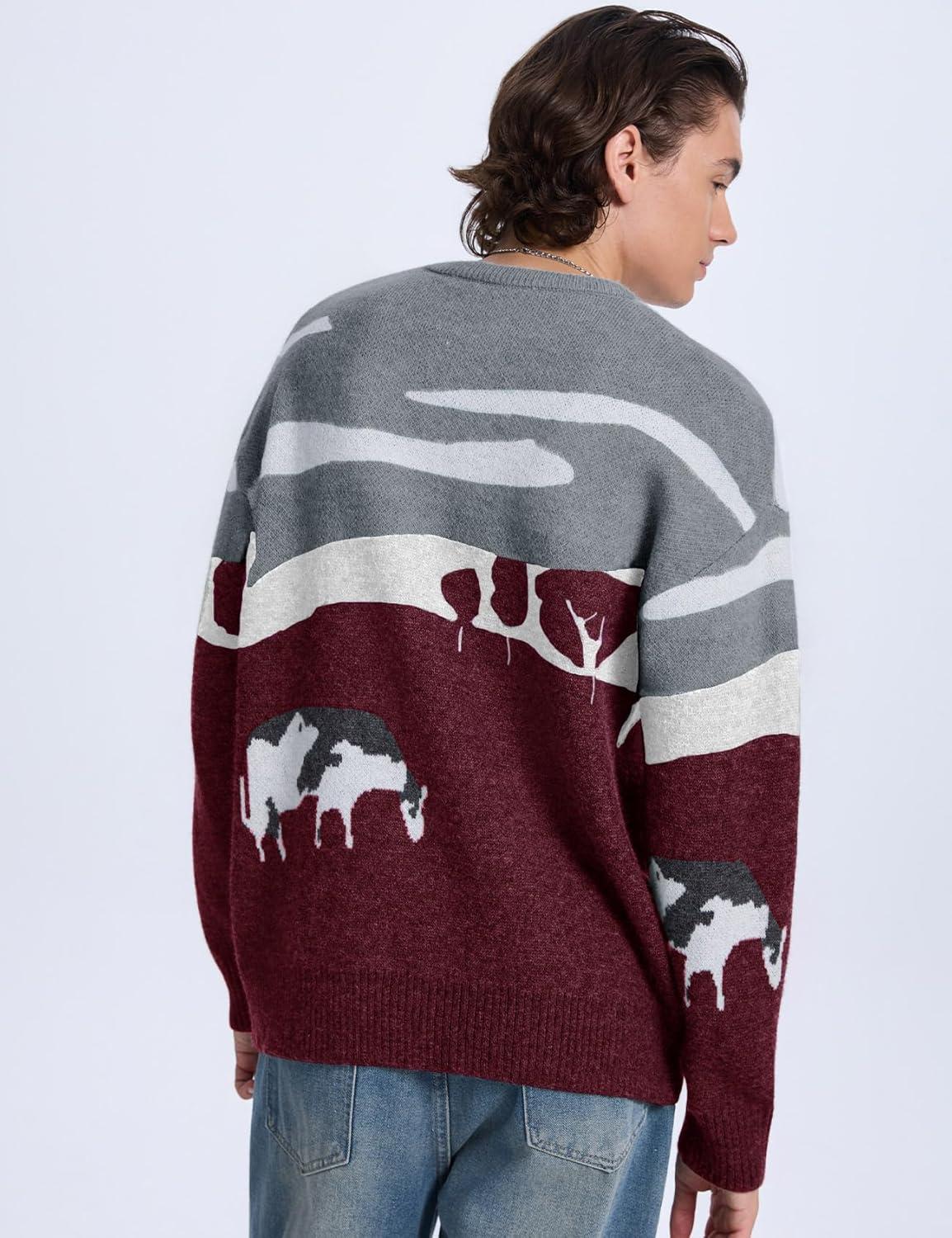 Flygo Men’s Cow Sweater Harajuku Oversized Sweaters Chunky Casual Knit Pullover Jumper Fall Winter Fashion(Burgundy)