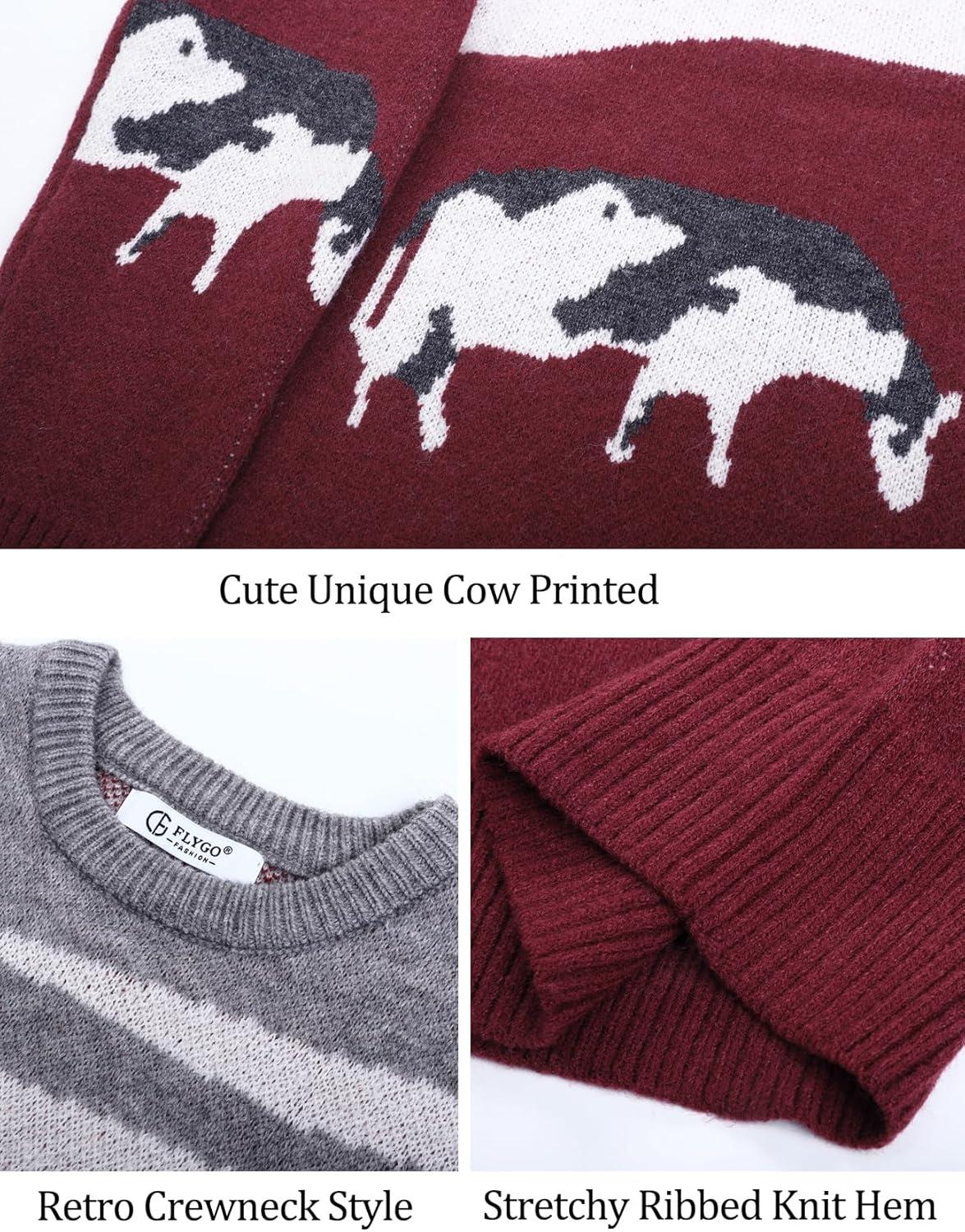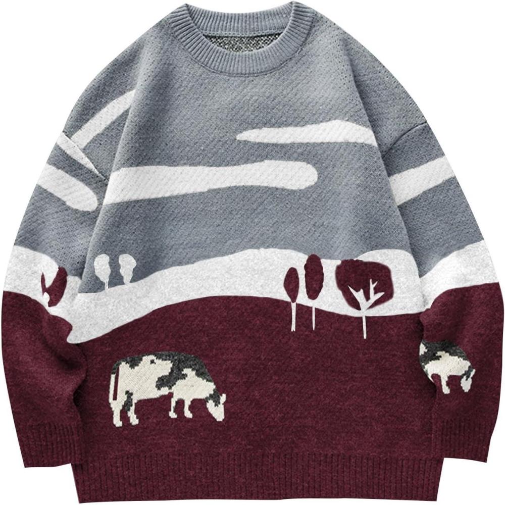 Flygo Men’s Cow Sweater Harajuku Oversized Sweaters Chunky Casual Knit Pullover Jumper Fall Winter Fashion(Grey)