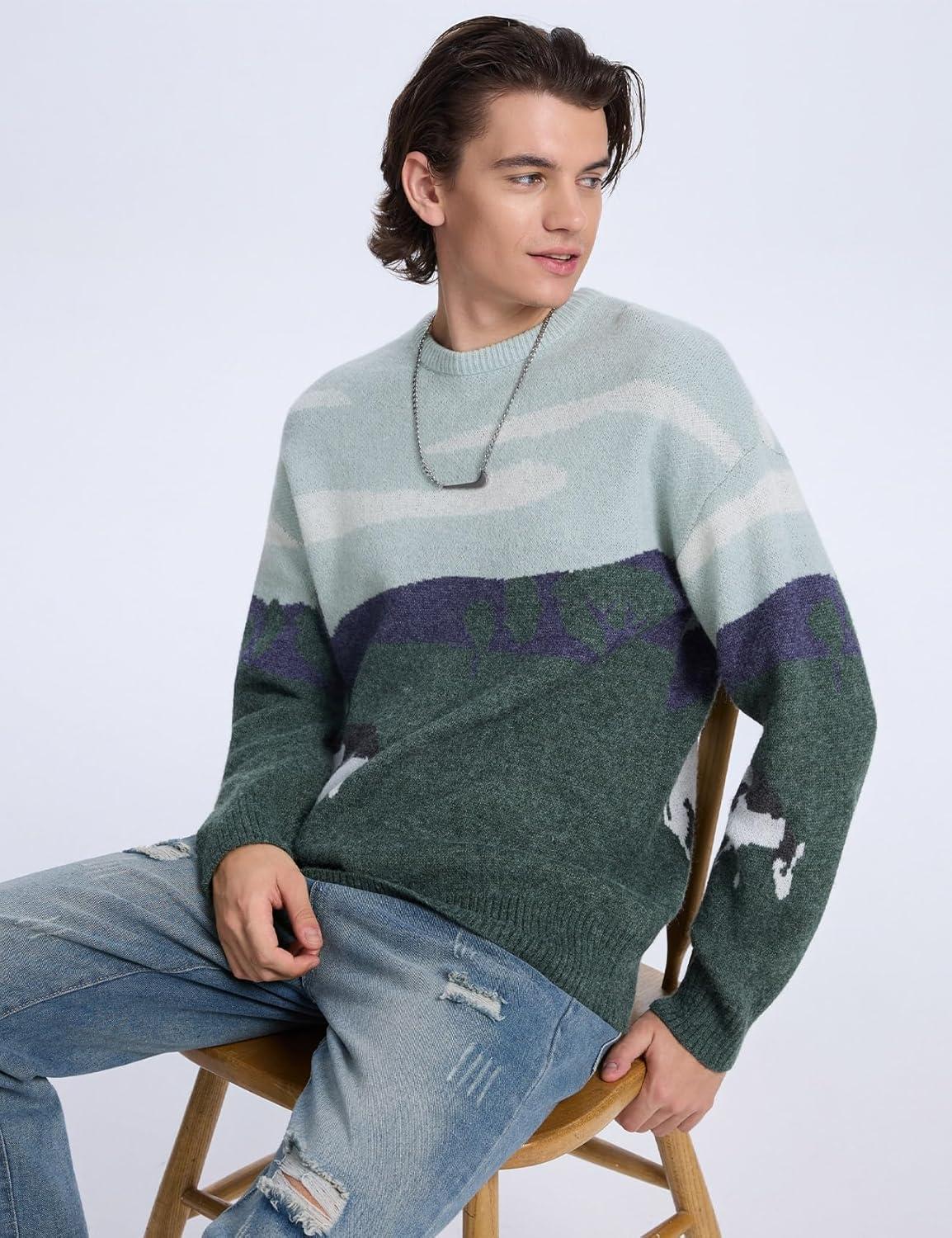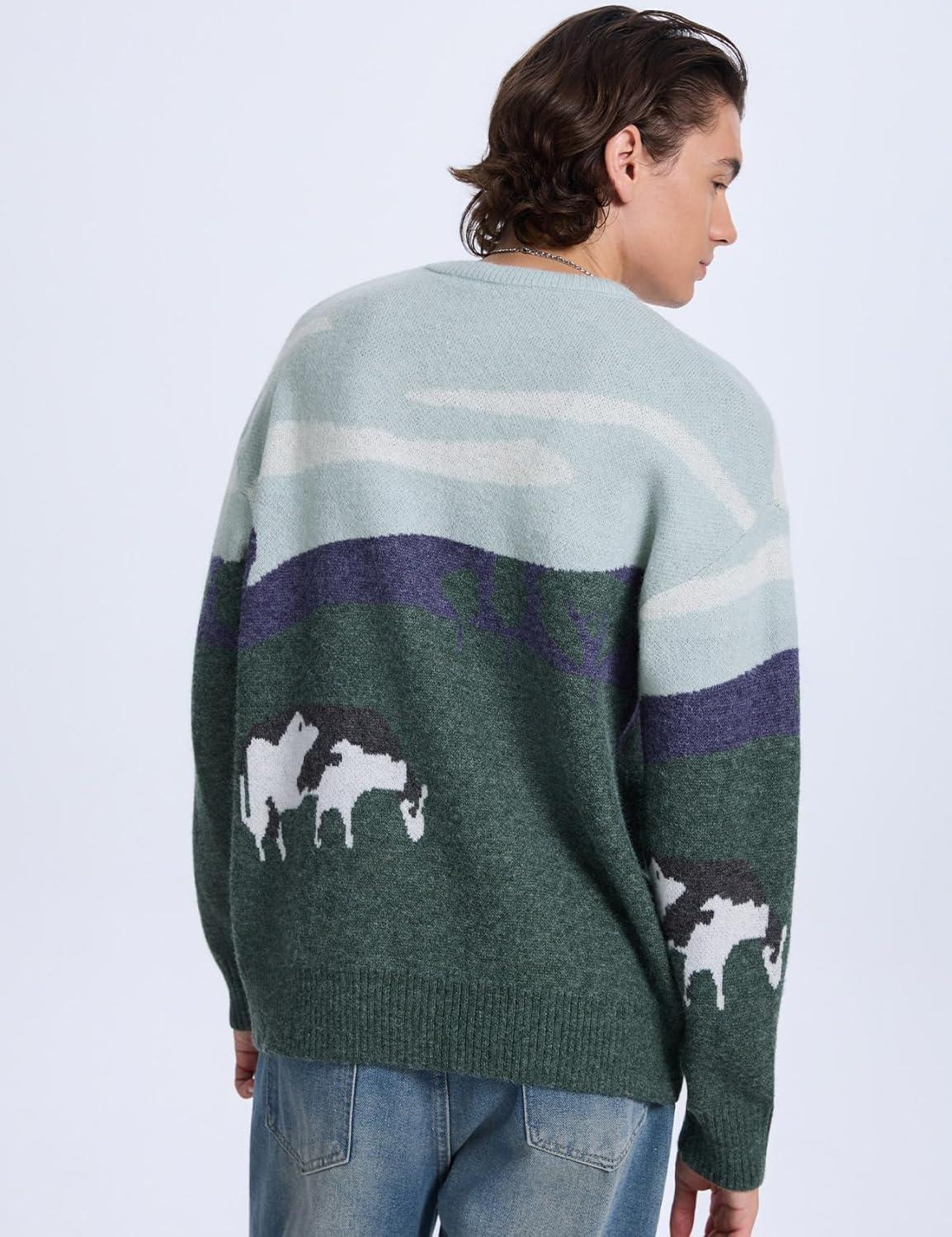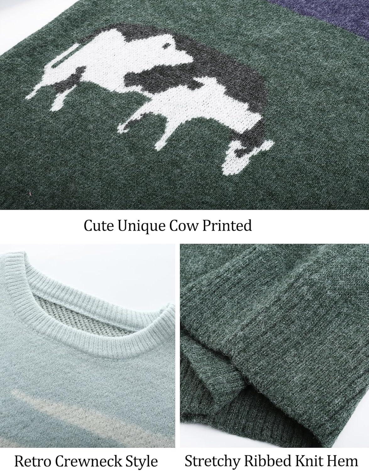 Flygo Men’s Cow Sweater Harajuku Oversized Sweaters Chunky Casual Knit Pullover Jumper Fall Winter Fashion(Grey)