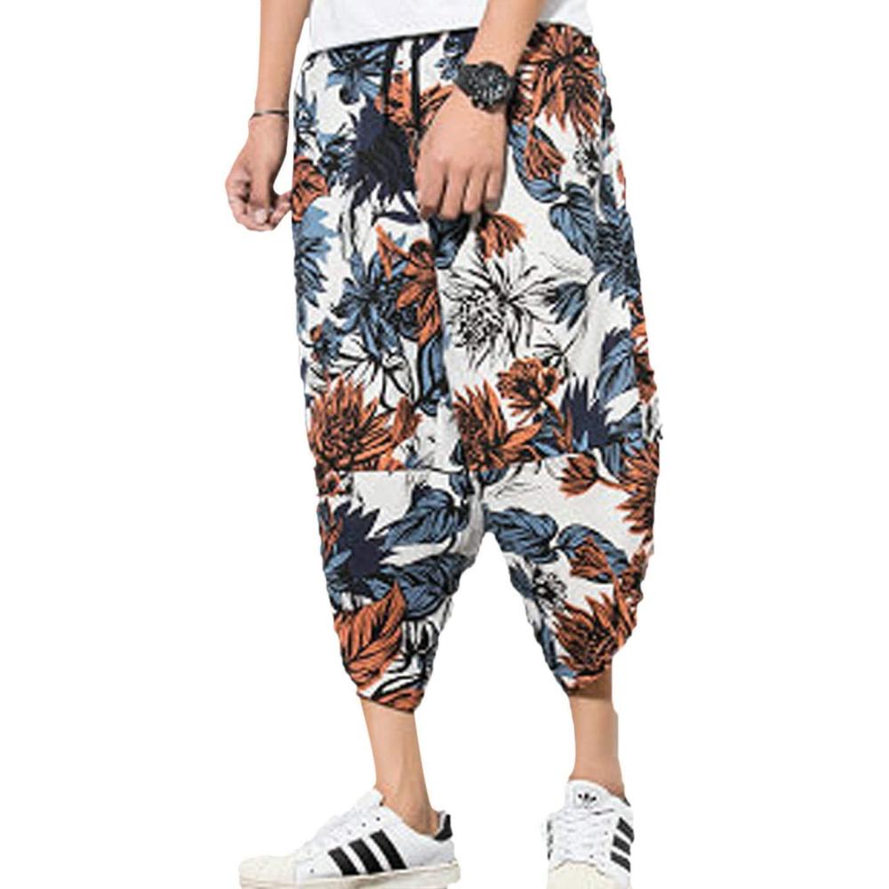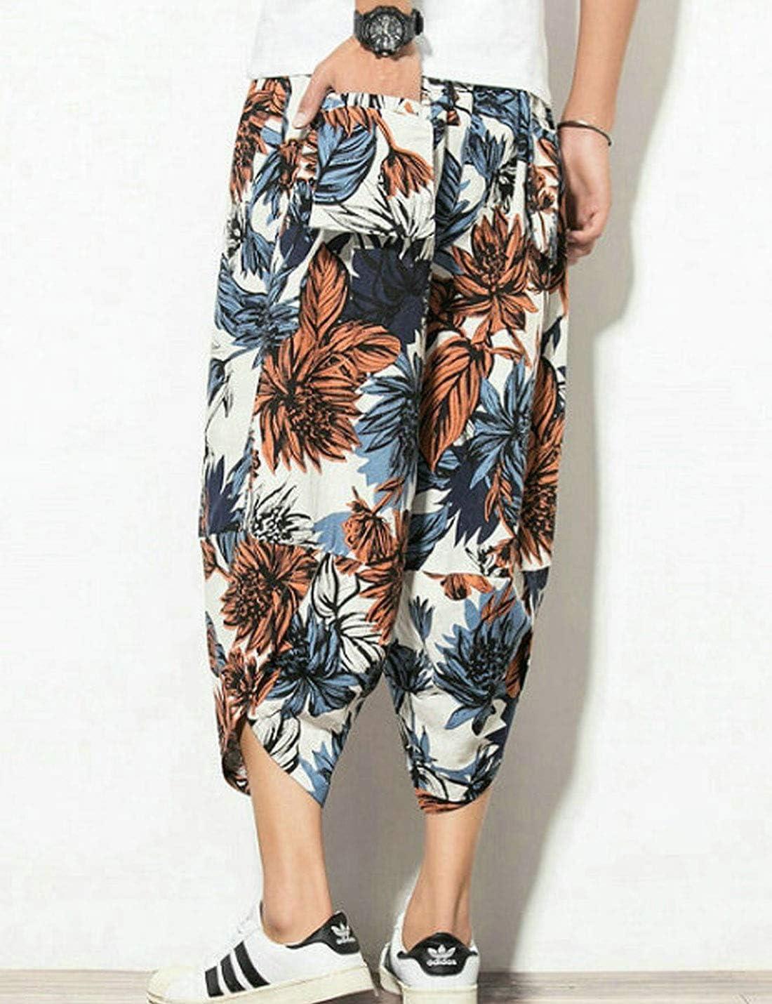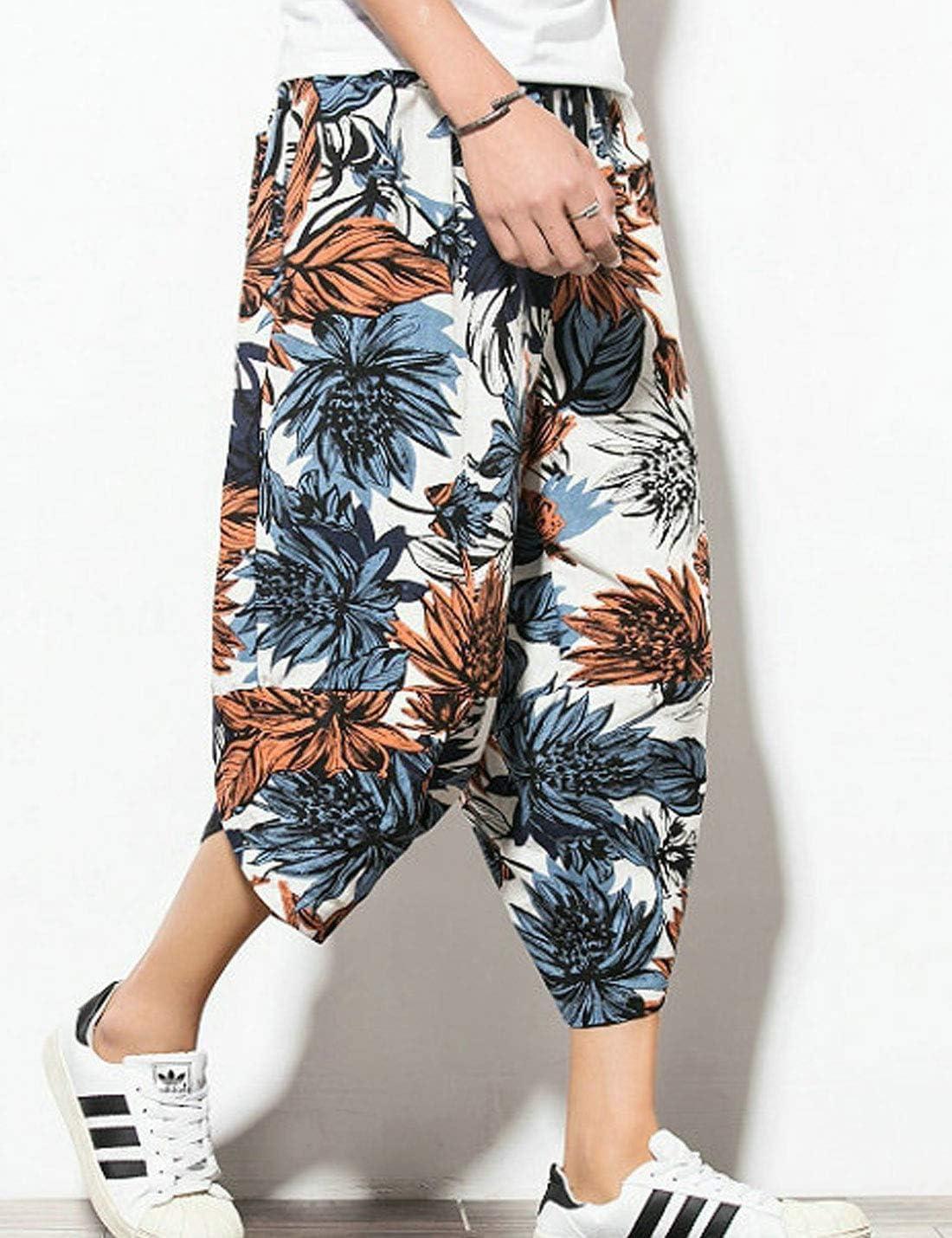 Flygo Men’s Ethnic Stylish Drawstring Elastic Waist Loose Fit Baggy Linen Harem Capri Pants(Blue-9)
