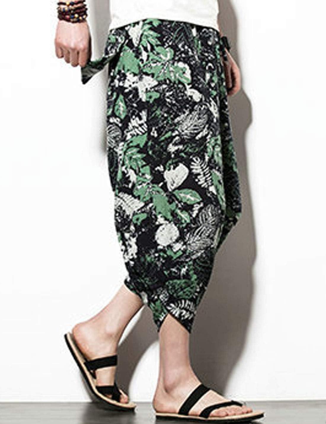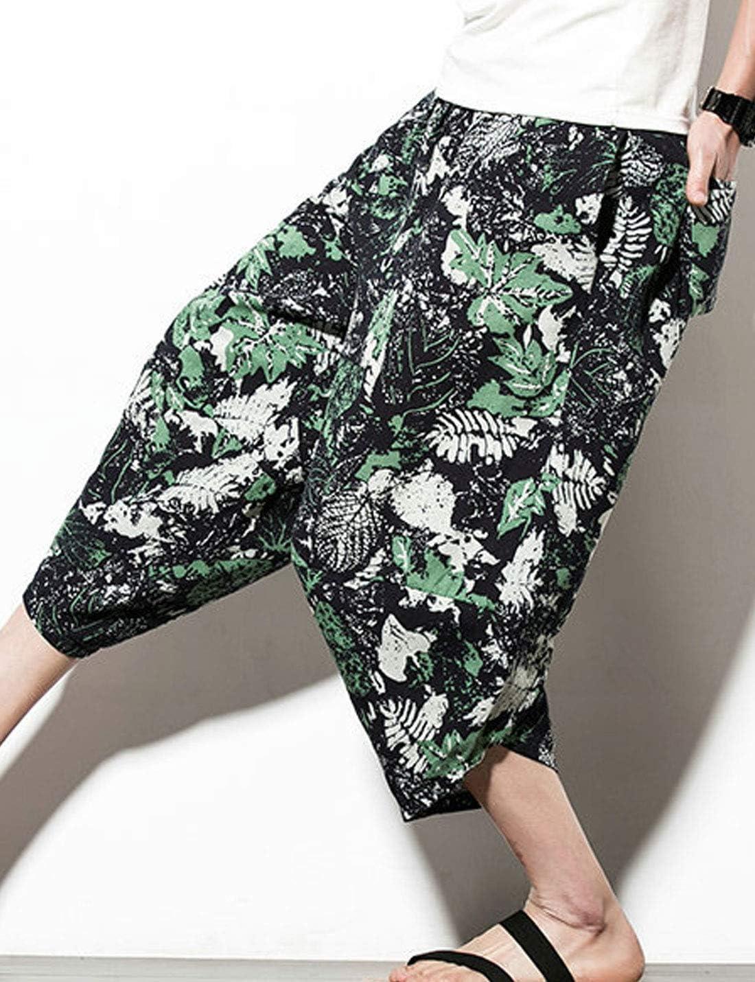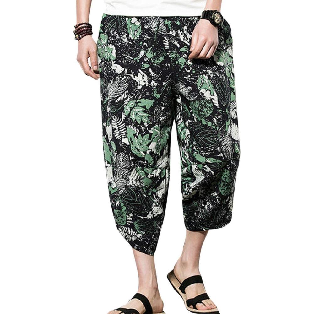 Flygo Men’s Ethnic Stylish Drawstring Elastic Waist Loose Fit Baggy Linen Harem Capri Pants(Green-3)