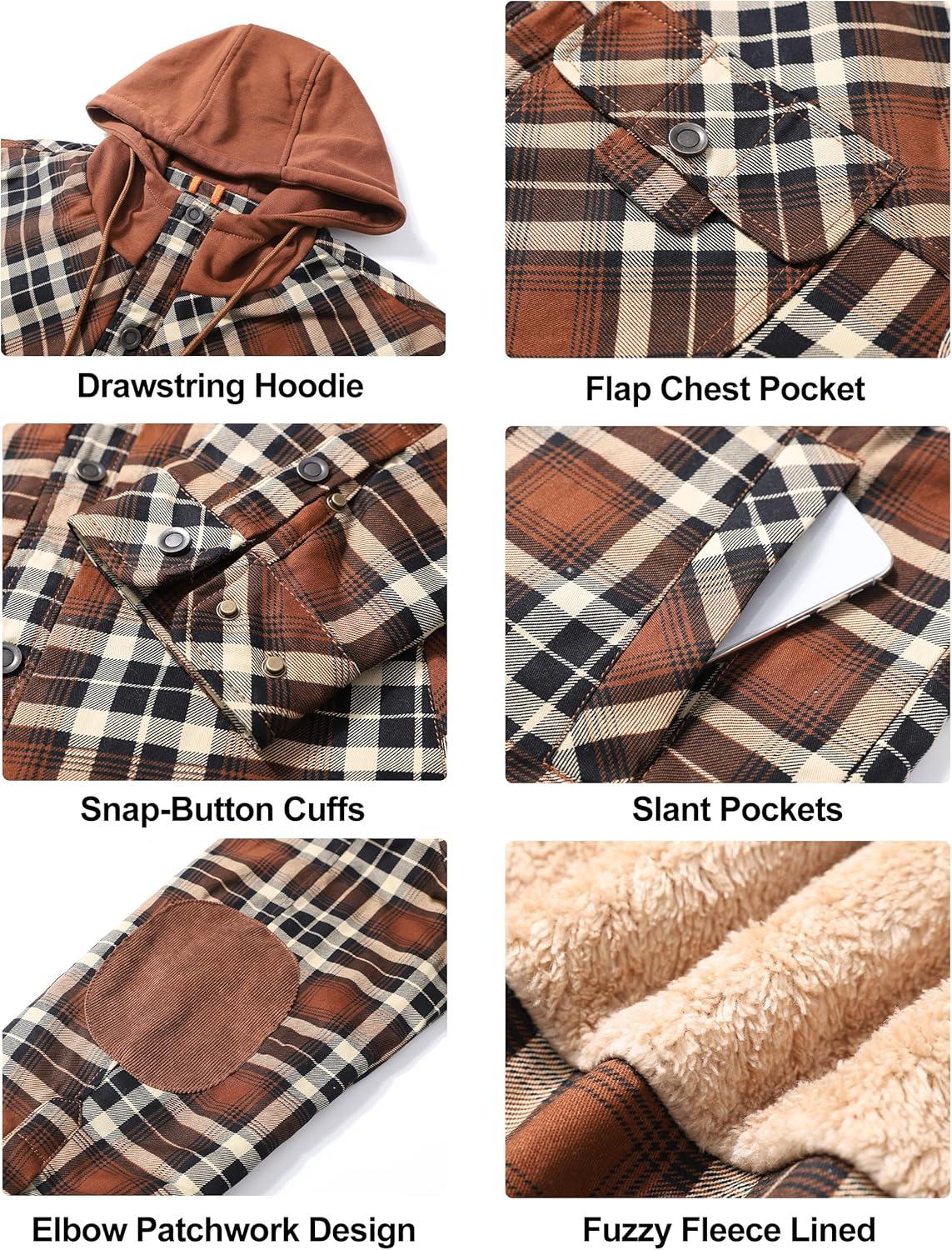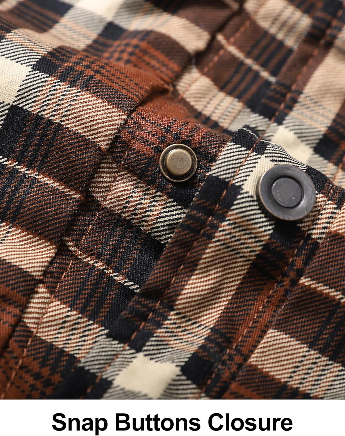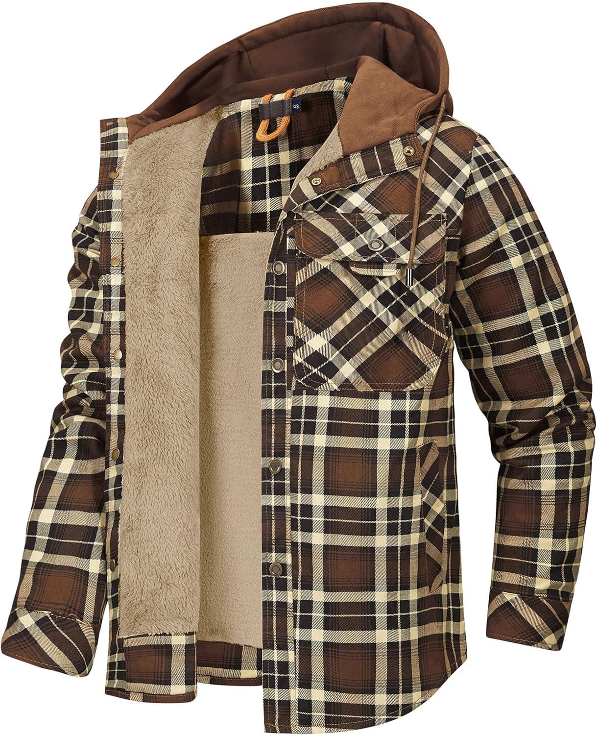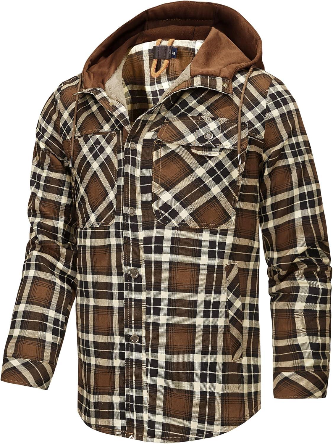 Flygo Men’s Flannel Jacket Loose Plaid Sherpa Lined Flannel Shirt Snap Button Warm Winter Jackets Pockets(02 Hooded Brown)