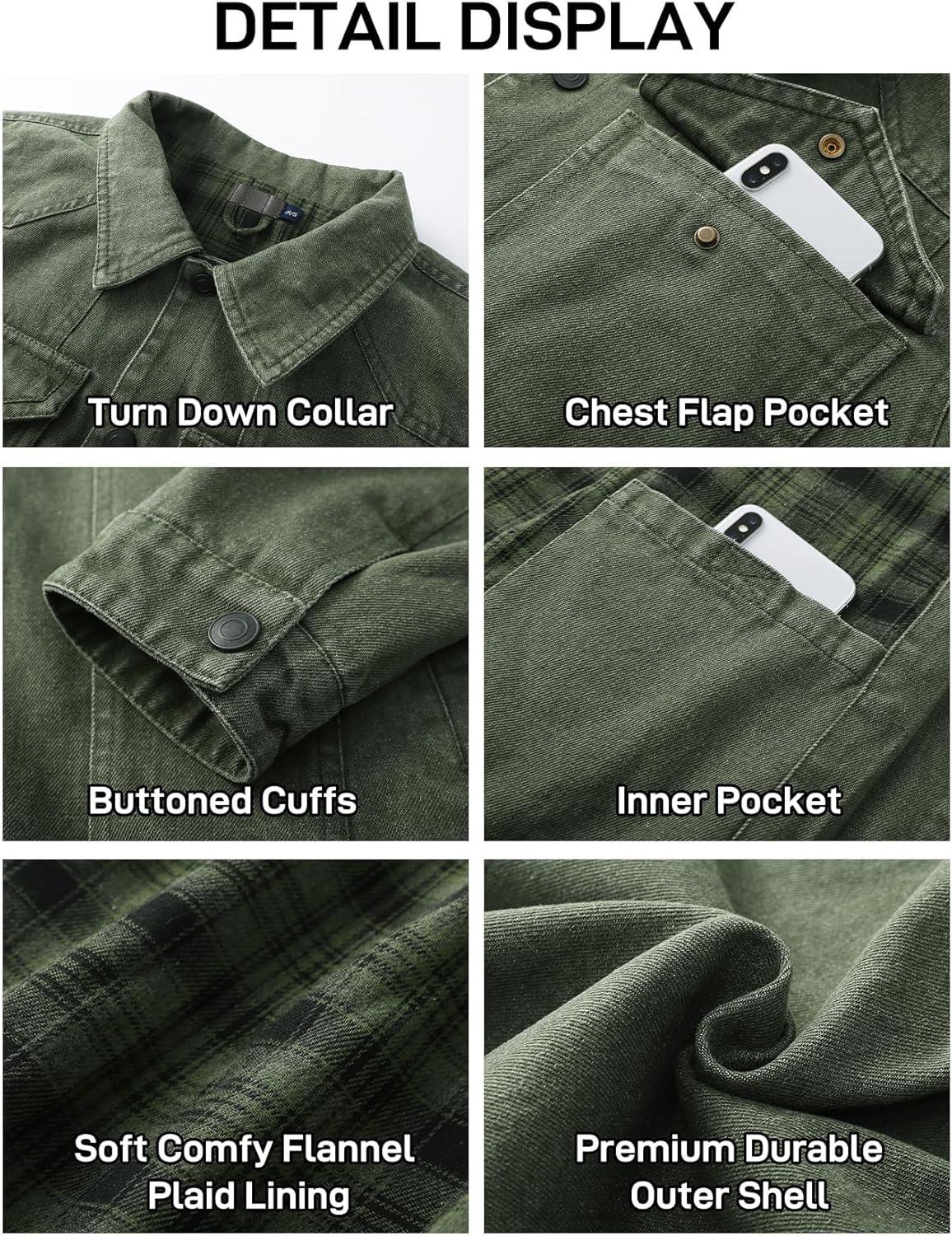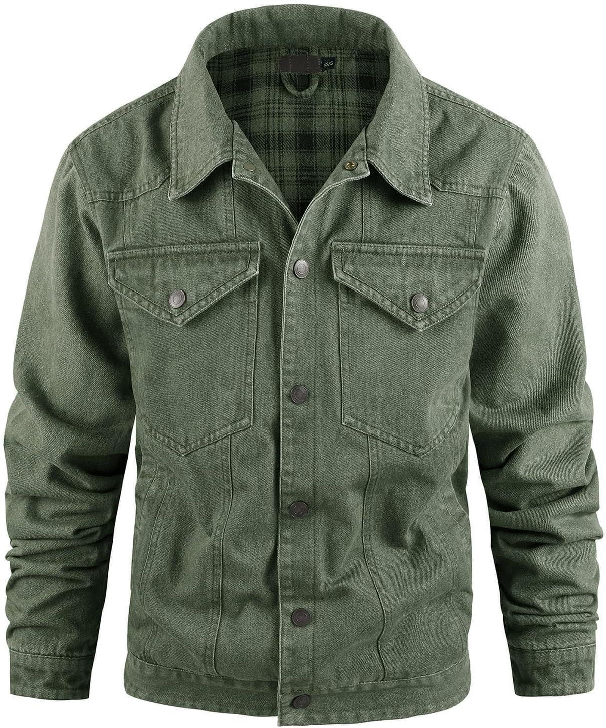 Flygo Mens Flannel Lined Denim Jacket Snap Cowboy Cut Western Classic Slim Fit Vintage Heavy Duty Jacket Trucker Coat(Green)