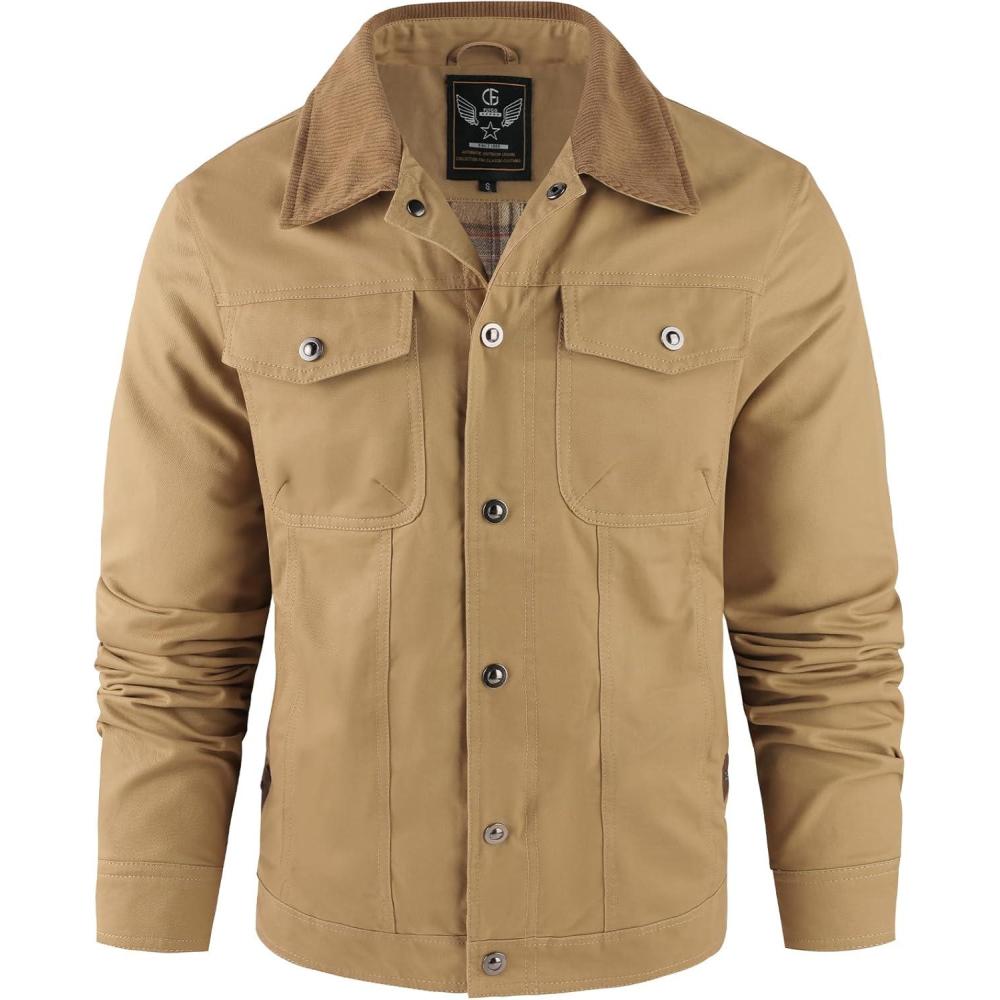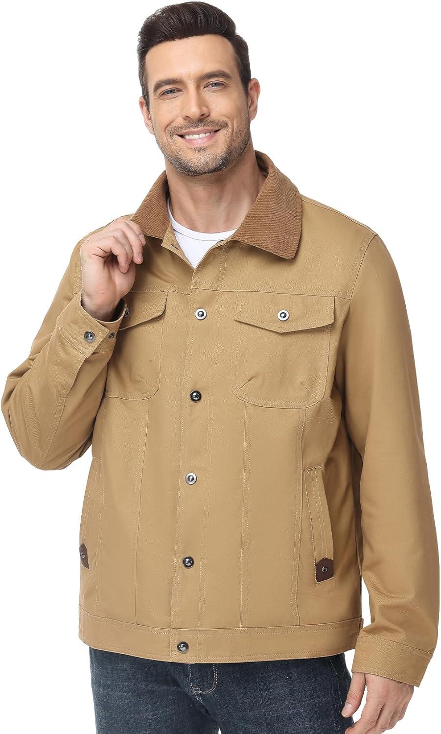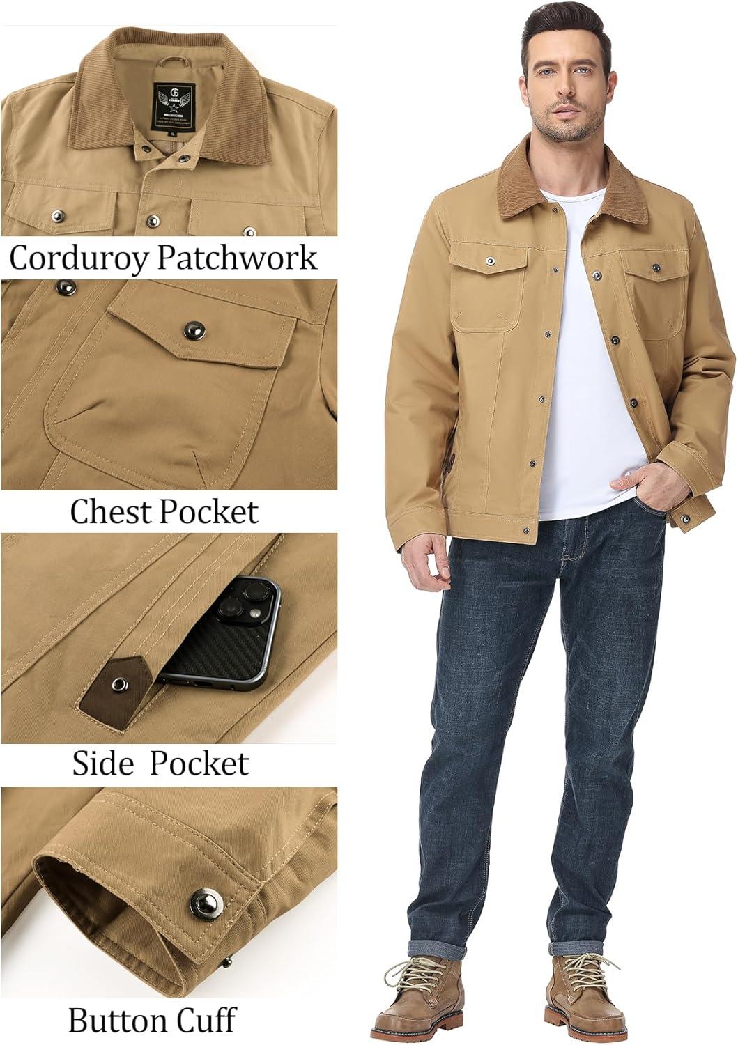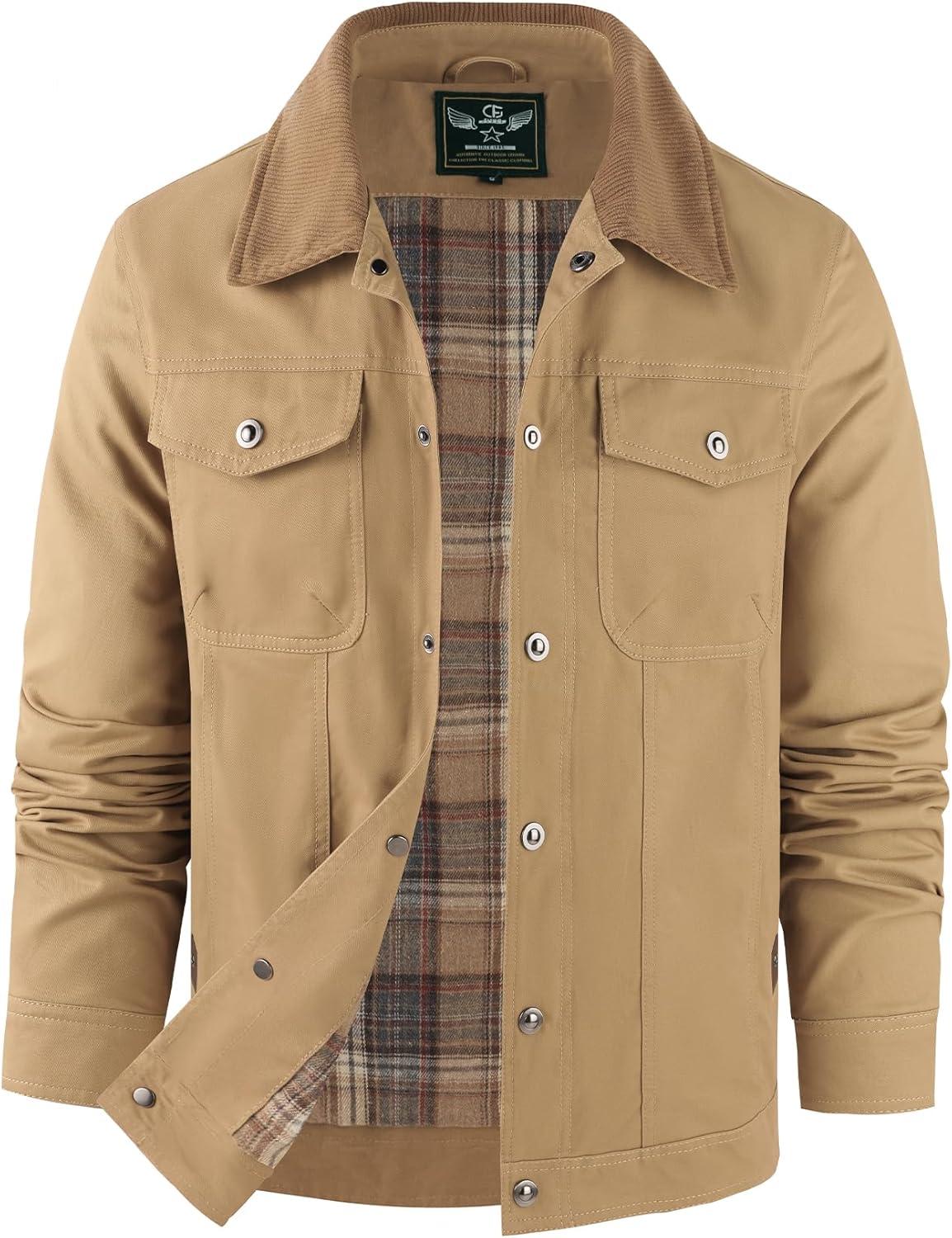 Flygo Mens Flannel Lined Shirt Jacket Cotton Corduroy Turndown Collar Snap Button Rugged Cargo Trucker Jacket Multi Pockets(Khaki)