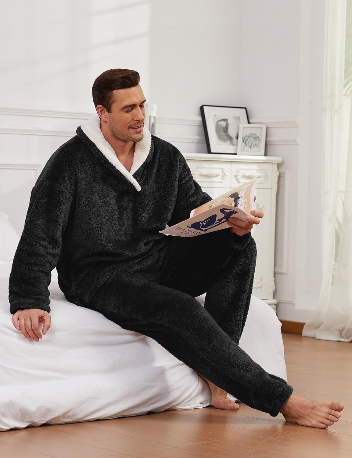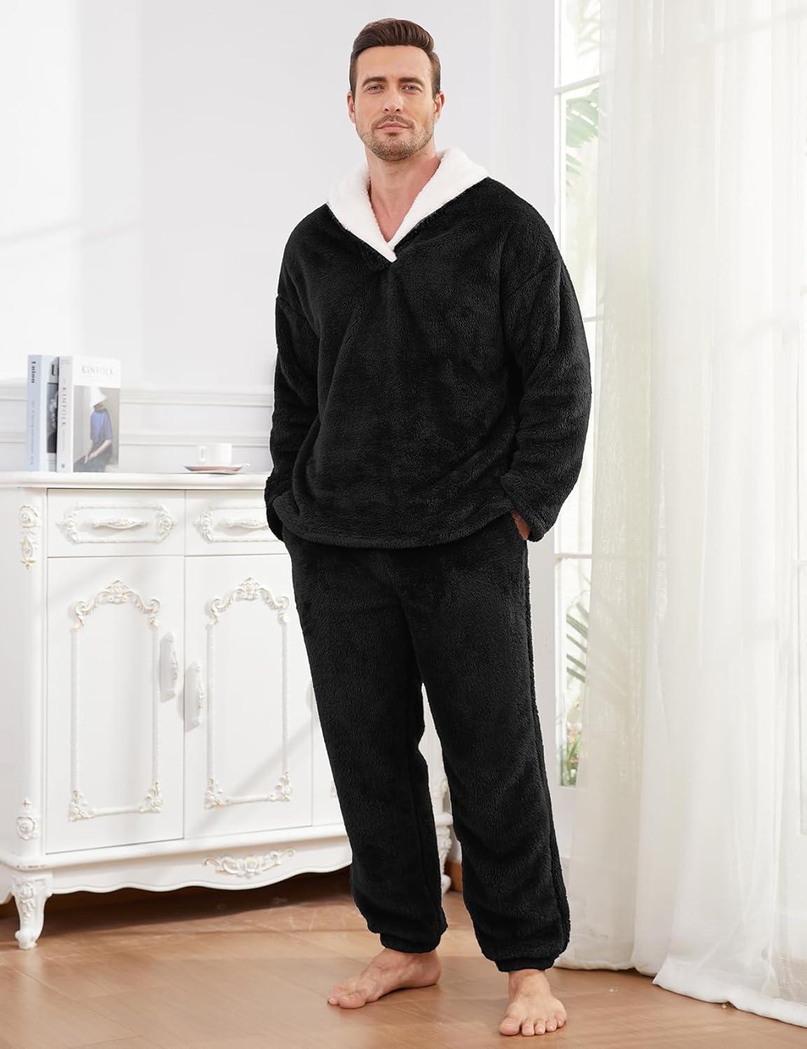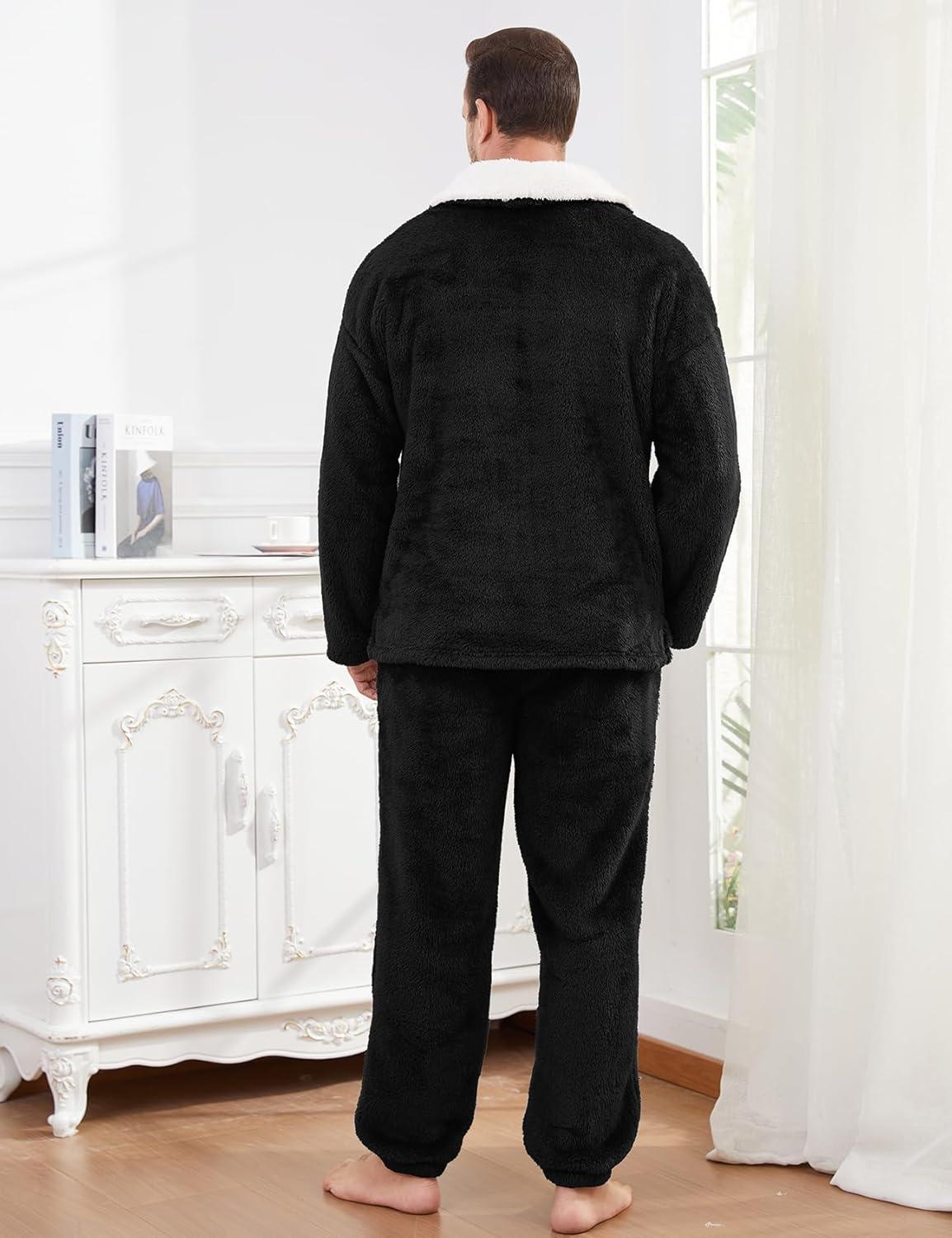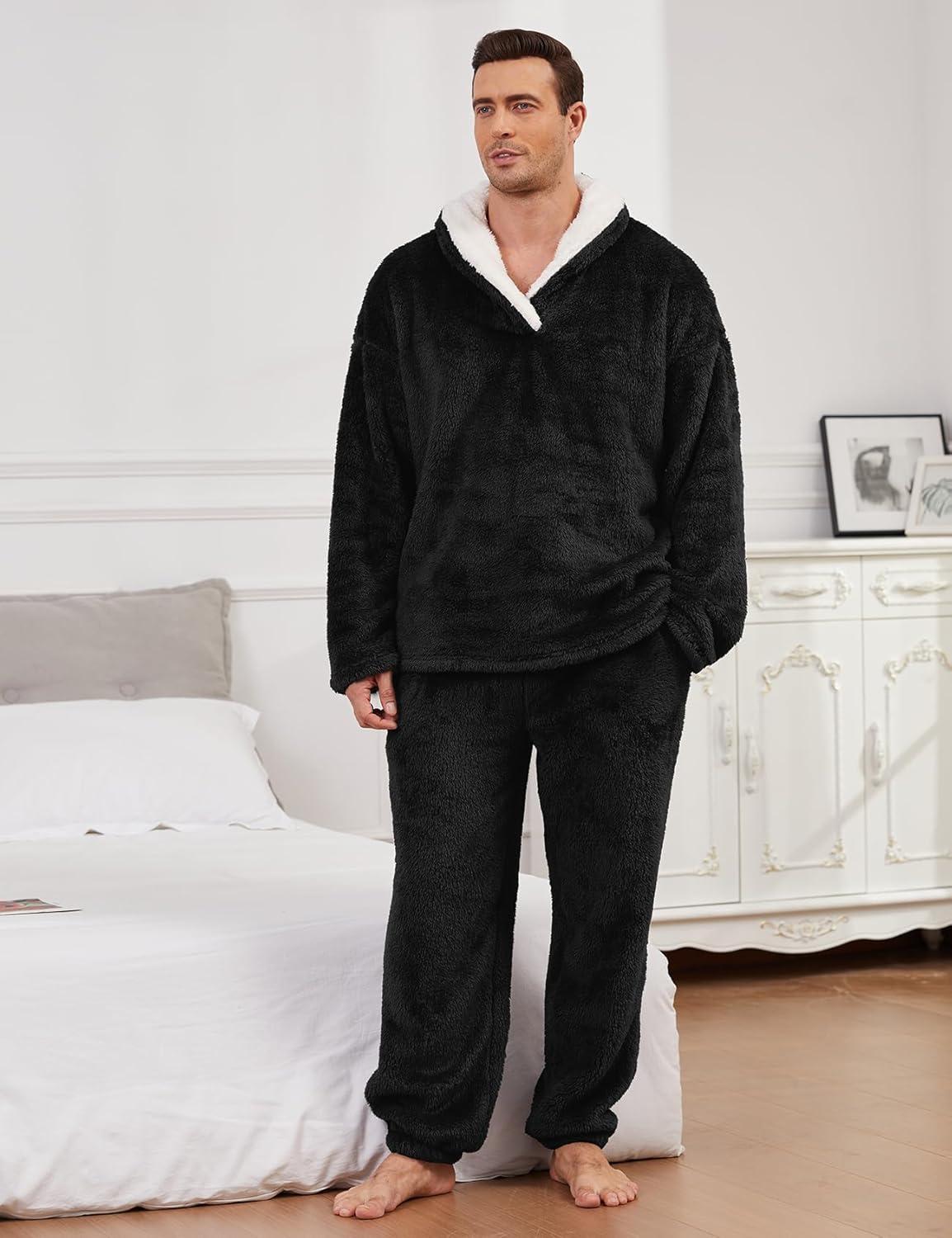 Flygo Mens Pajamas Set Winter Warm Coral Fleece Pajamas Fuzzy Pants Lounge Set Loose Plush Sleepwear(Black)