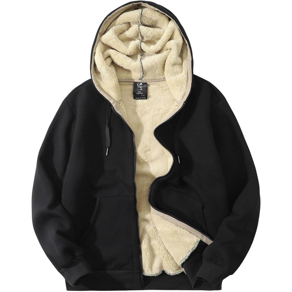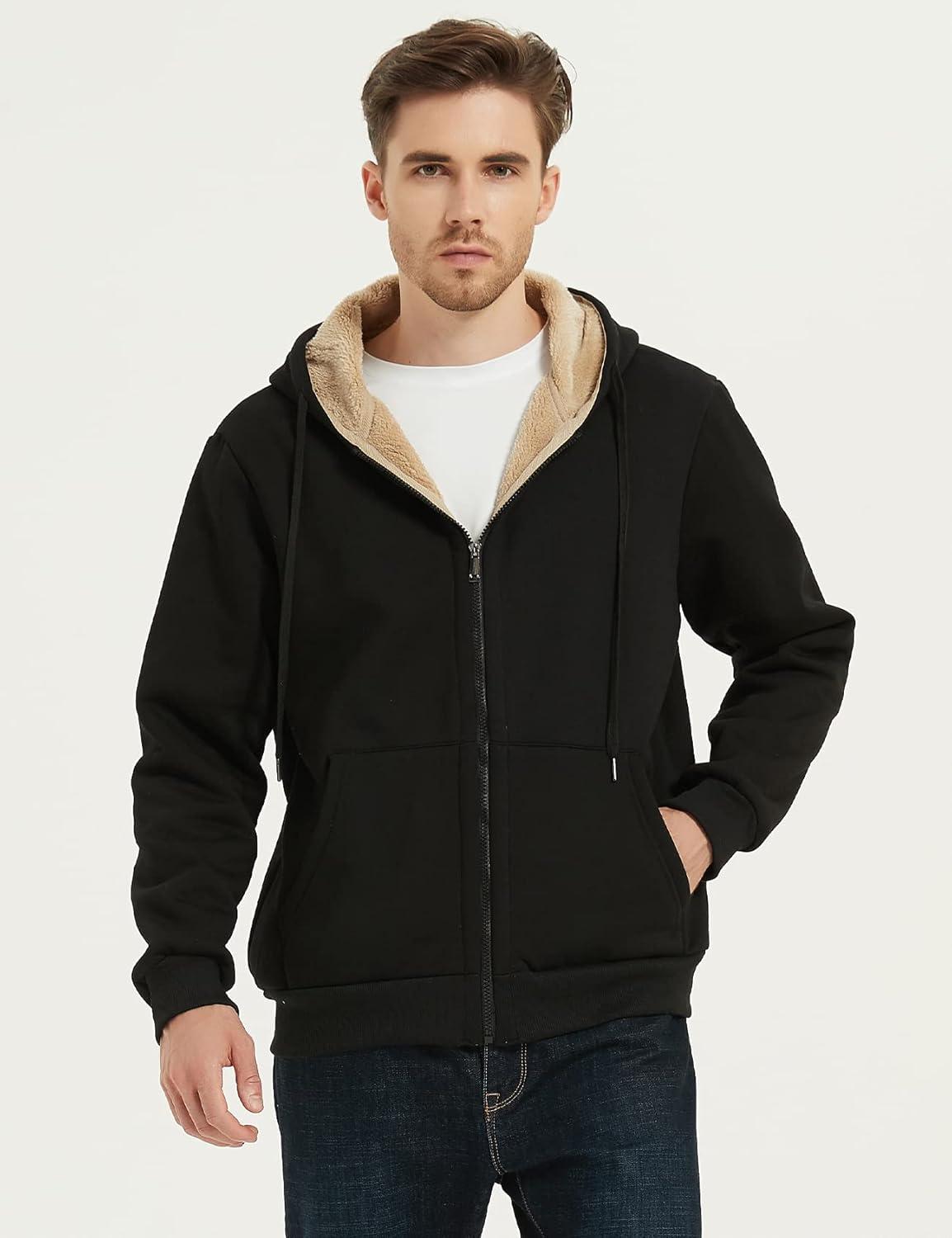 Flygo Men’s Sherpa Hoodie Jacket Fleece Lined Zip Up Warm Hoodies Sweatshirt Winter Zipper Sweater Hooded Coat(Black)