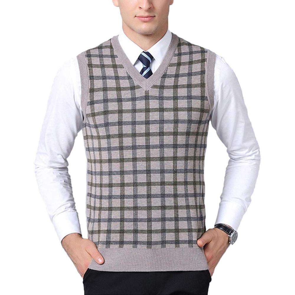 imageFlygo Mens Slim Fit Plaid Knitted VNeck Sweater Vests PulloverGrey