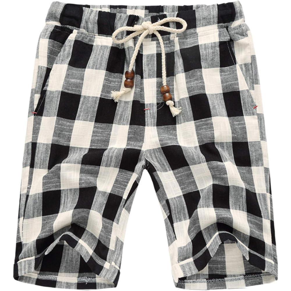 Flygo Men’s Summer Casual Linen Drawstring Striped Beach Shorts(Plaid Black)