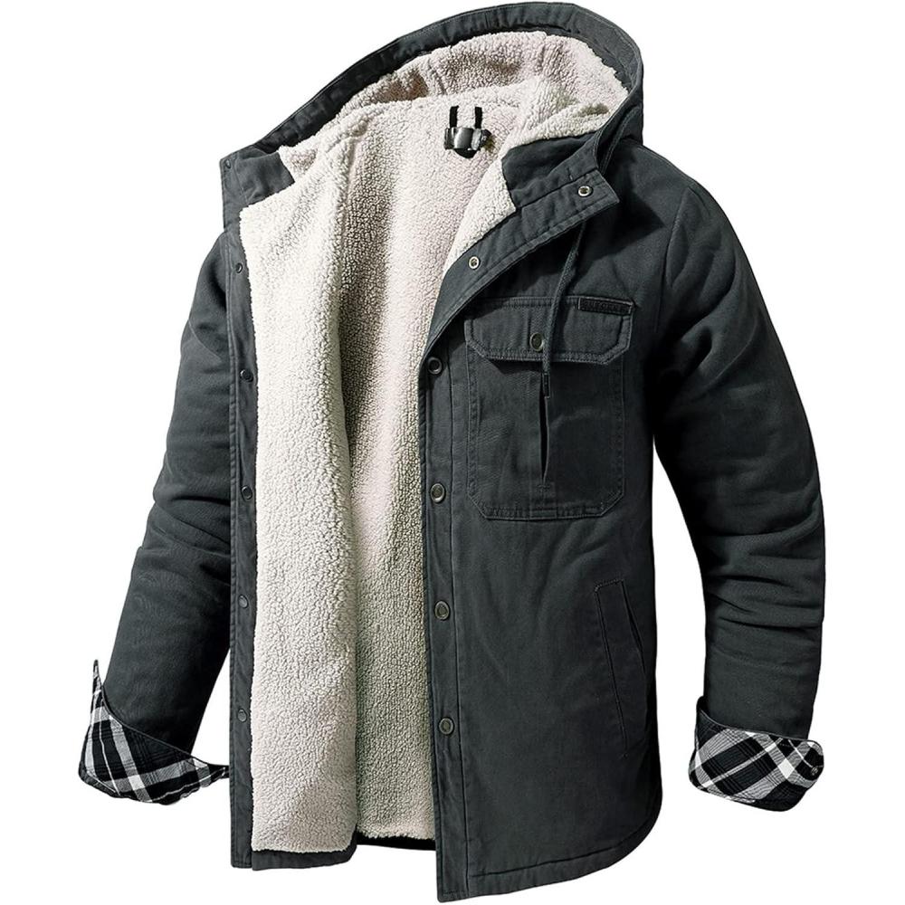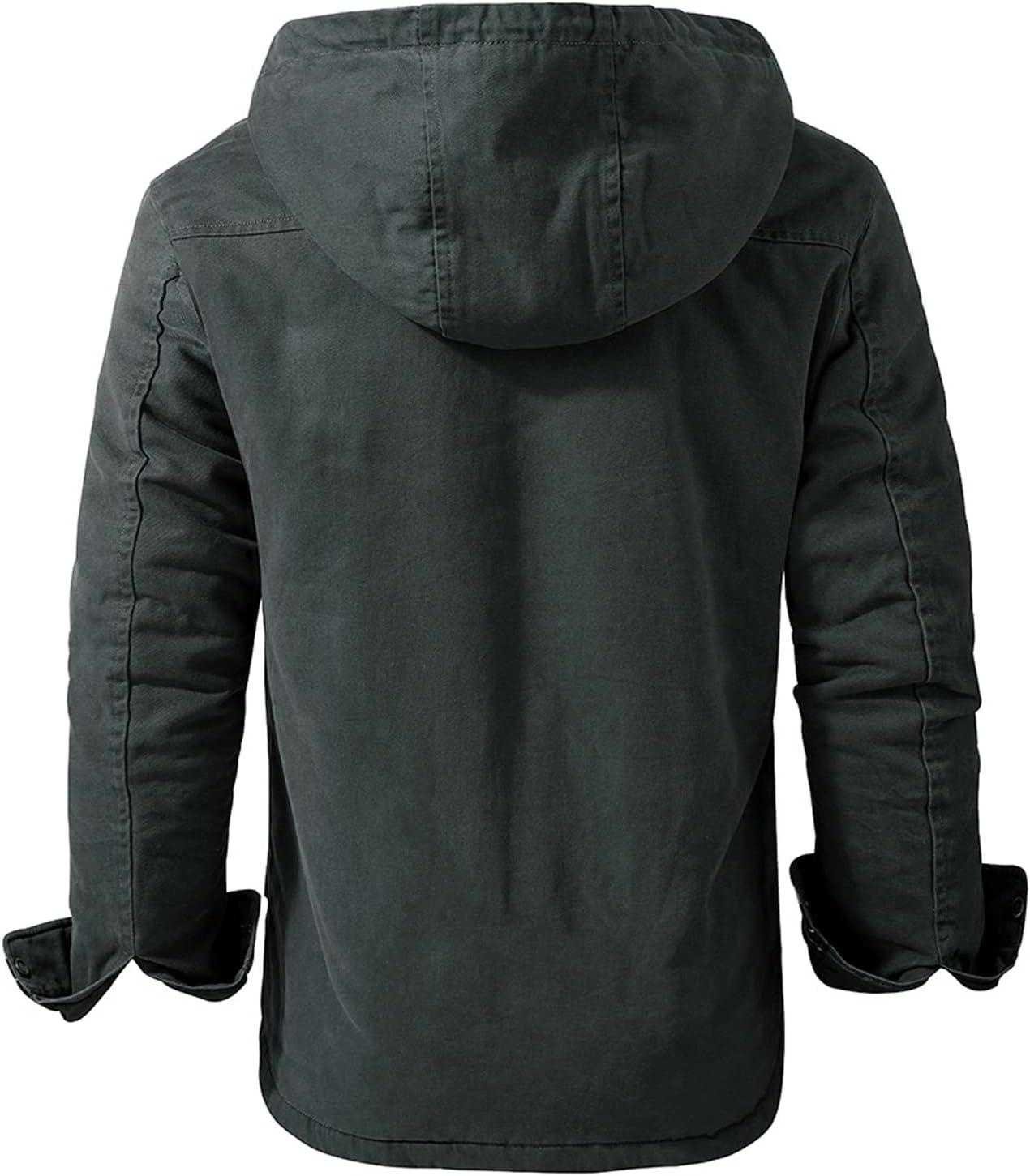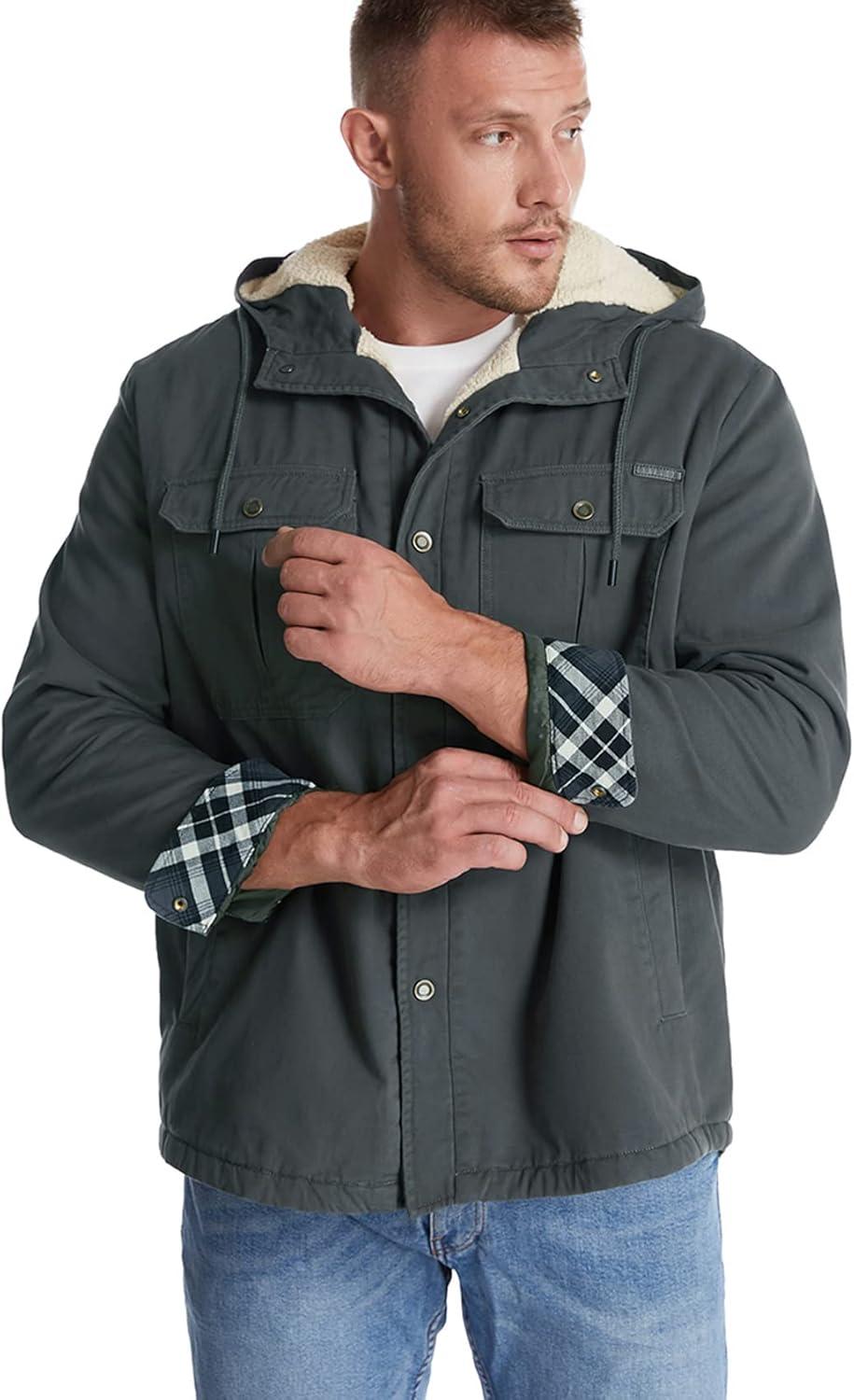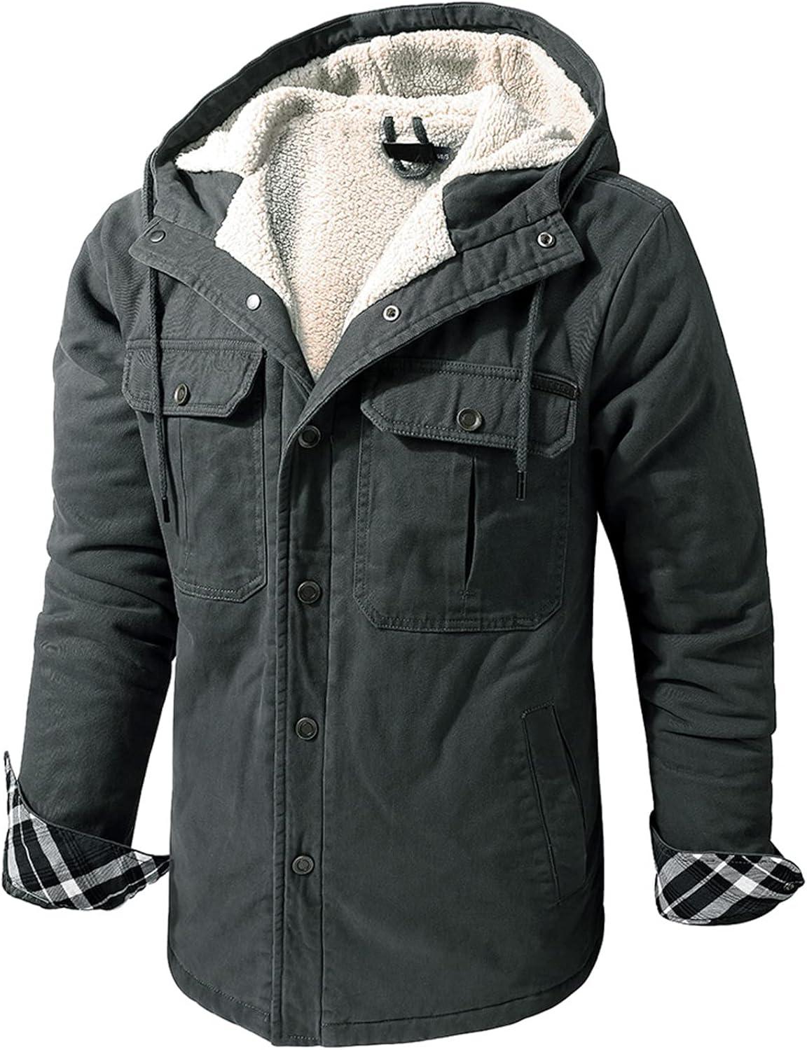 Flygo Men’s Warm Relaxed Fit Washed Duck Sherpa-Lined Shirt Jacket Hooded Outdoor Fleece Lined Utility Work Coat(Solid Grey)