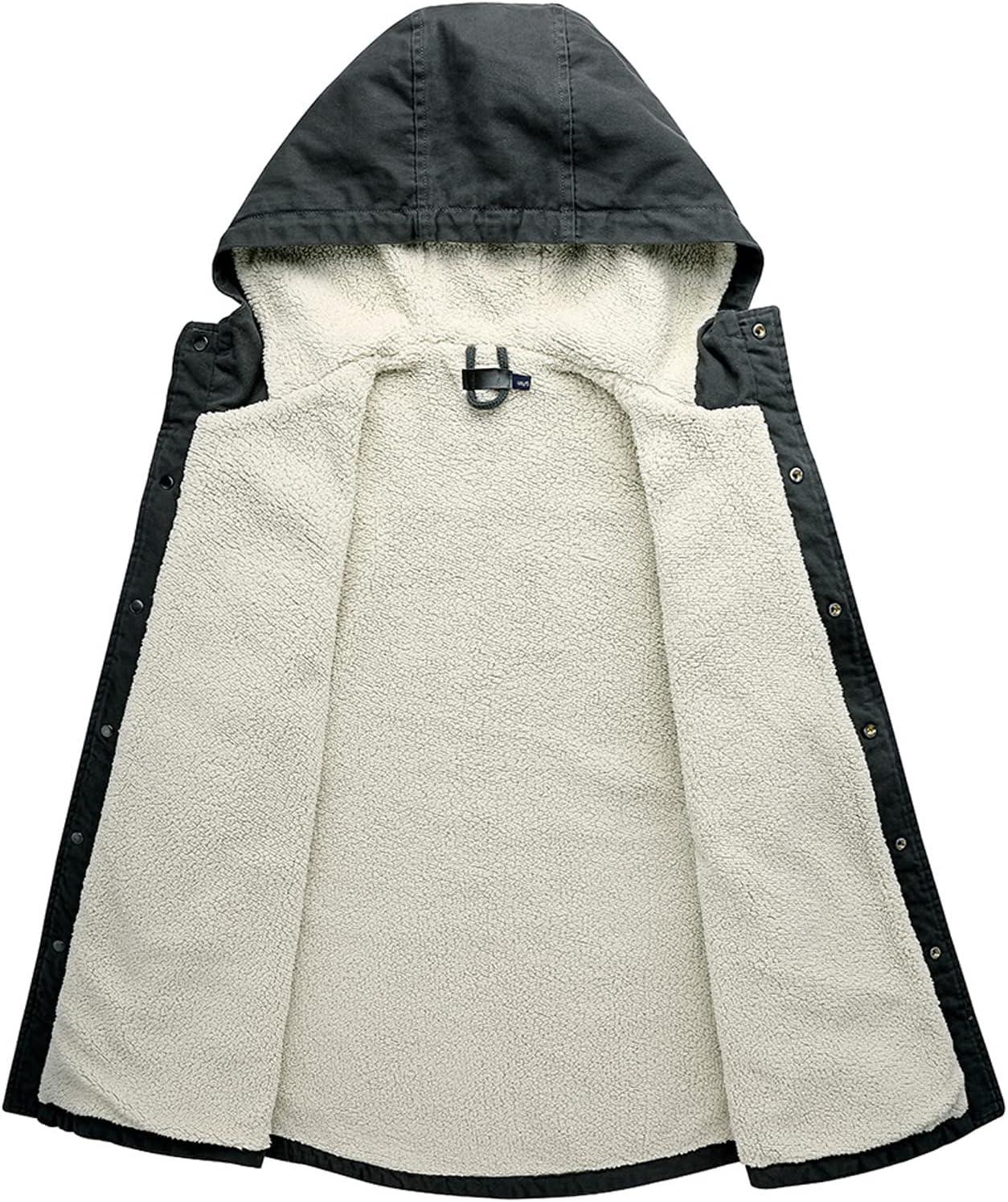 Flygo Men’s Warm Relaxed Fit Washed Duck Sherpa-Lined Shirt Jacket Hooded Outdoor Fleece Lined Utility Work Coat(Solid Khaki)