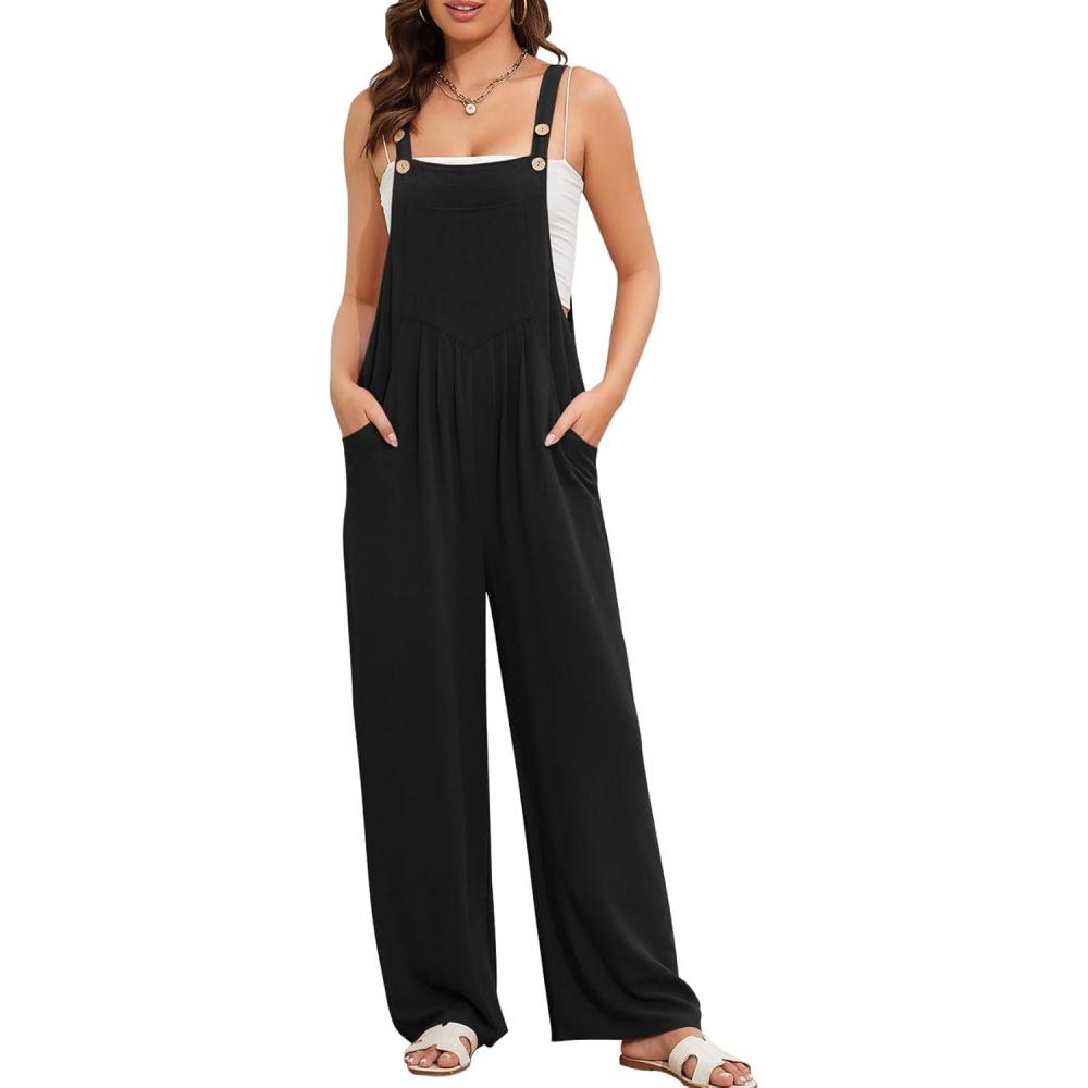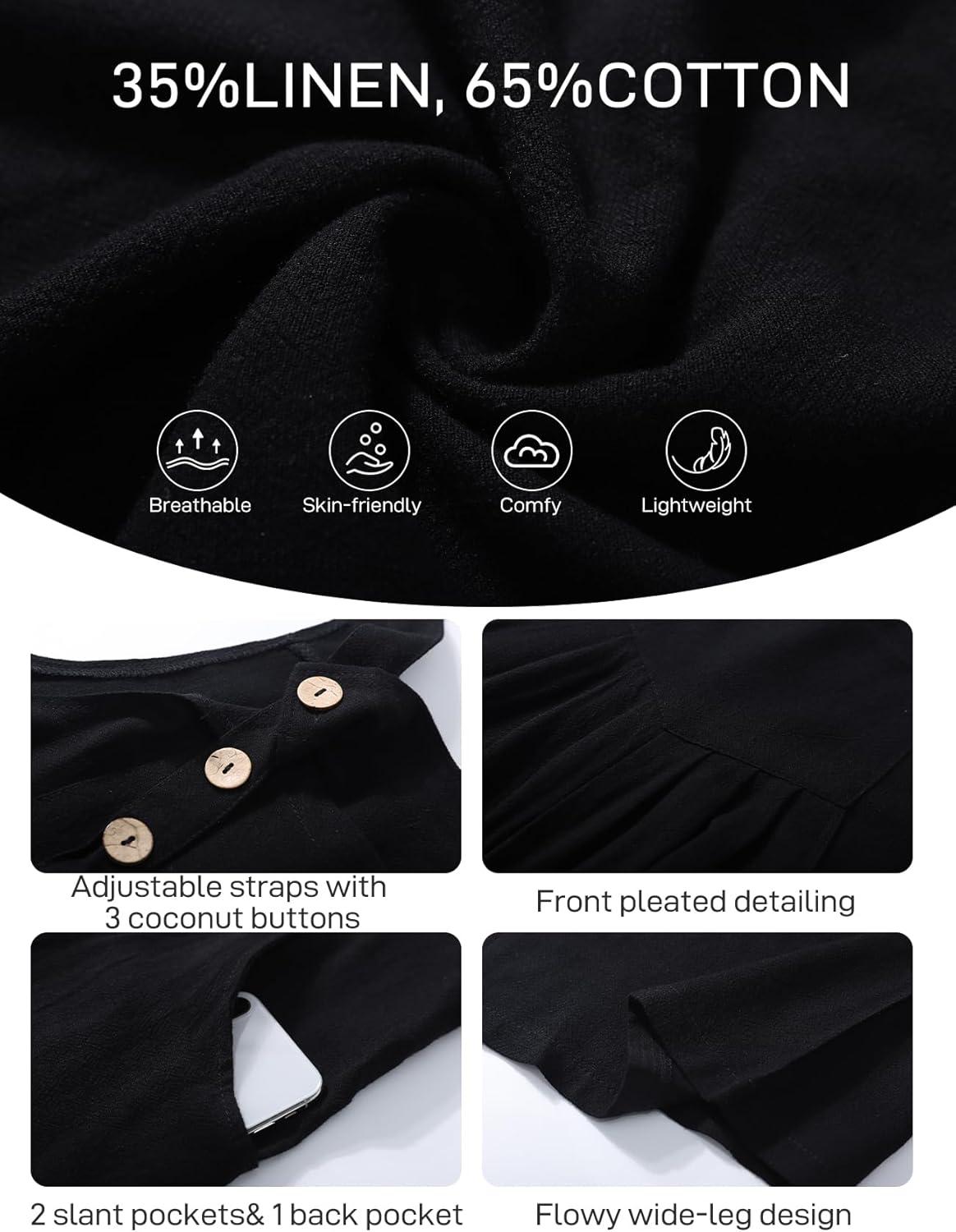 Flygo Overalls for Women Loose Fit Cotton Linen Bib Overalls Wide Leg Jumpsuits Casual 2025 Summer Rompers(Black)