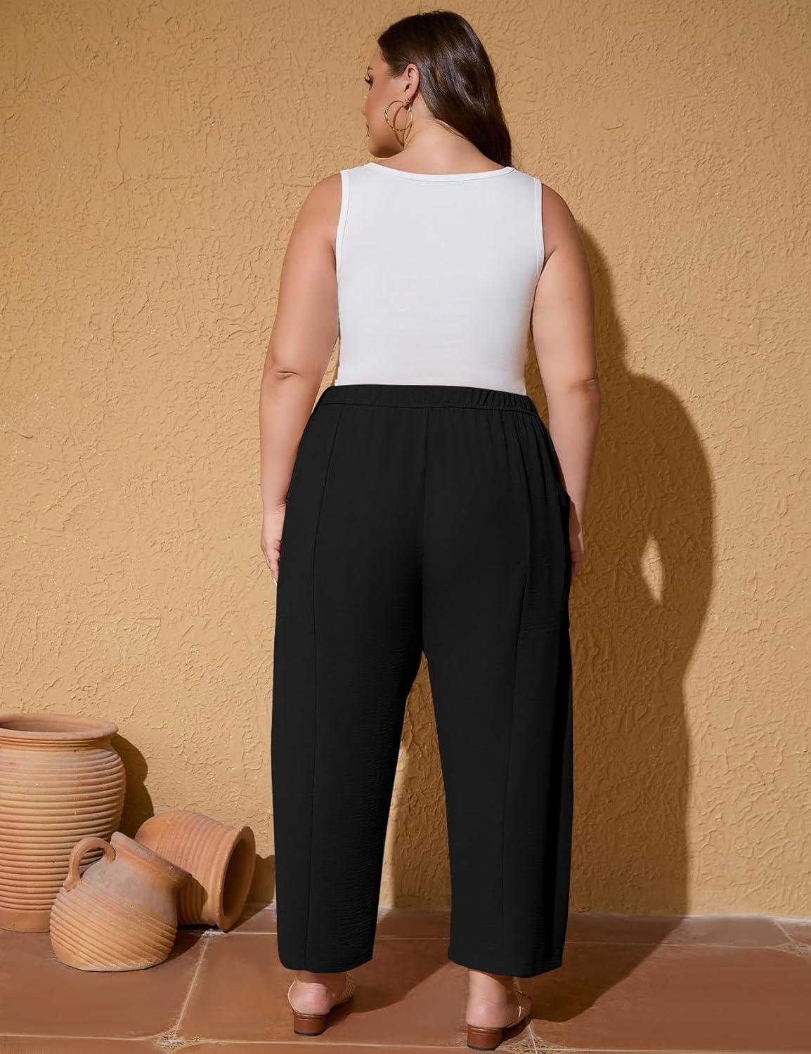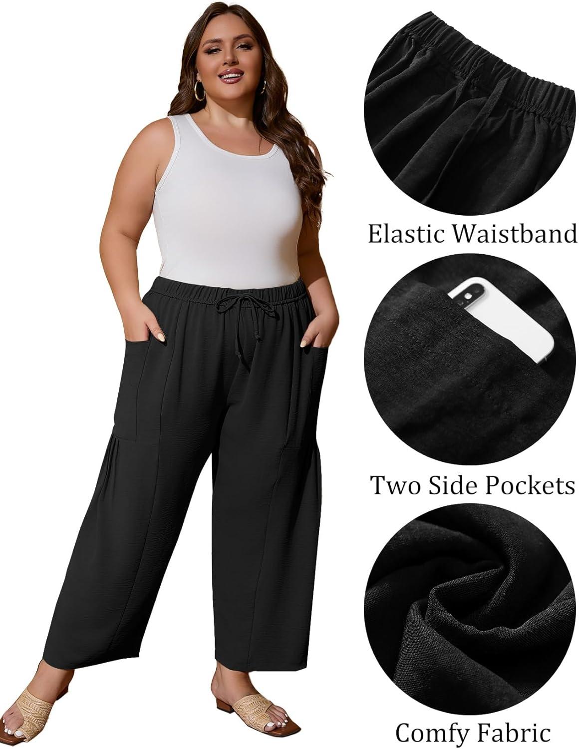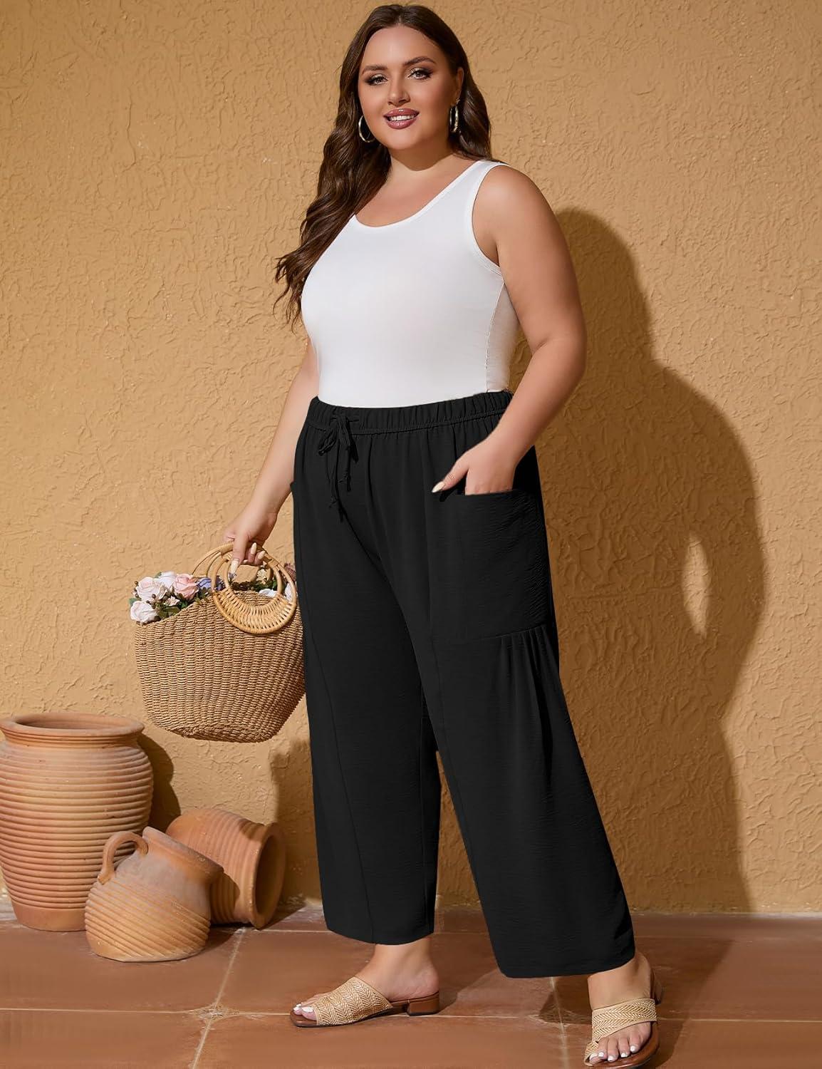Flygo Plus Size Pants for Women Summer Casual Wide Leg Palazzo Pants Baggy Trousers with Pockets(Black)