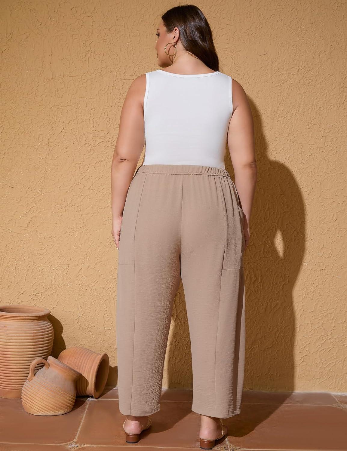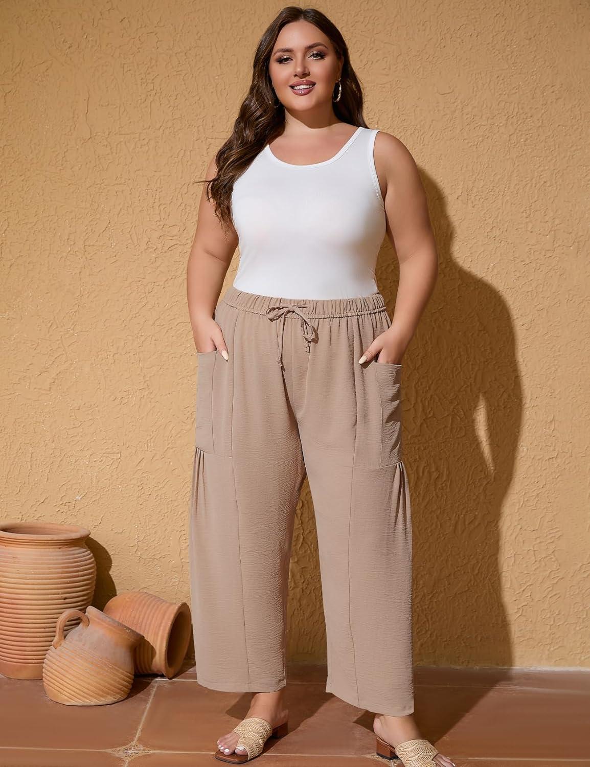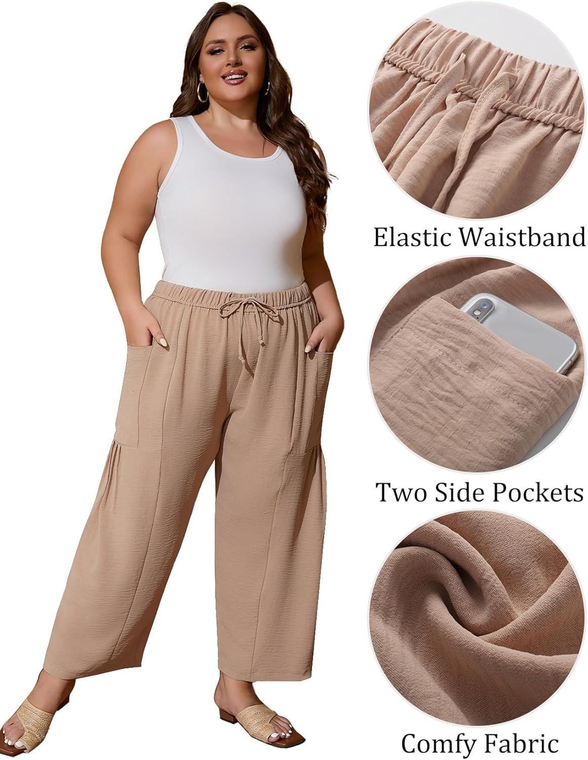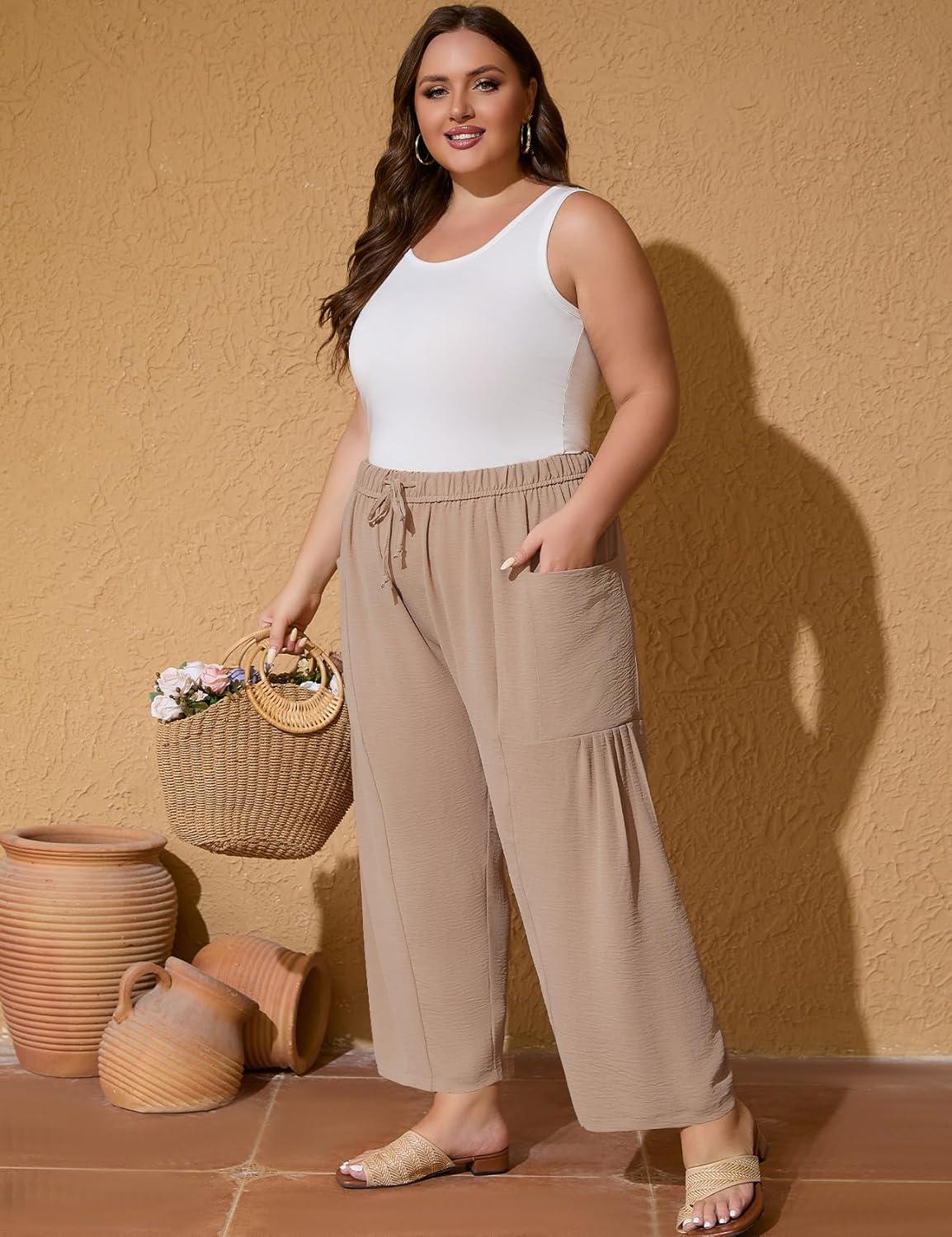 Flygo Plus Size Pants for Women Summer Casual Wide Leg Palazzo Pants Baggy Trousers with Pockets(Khaki)