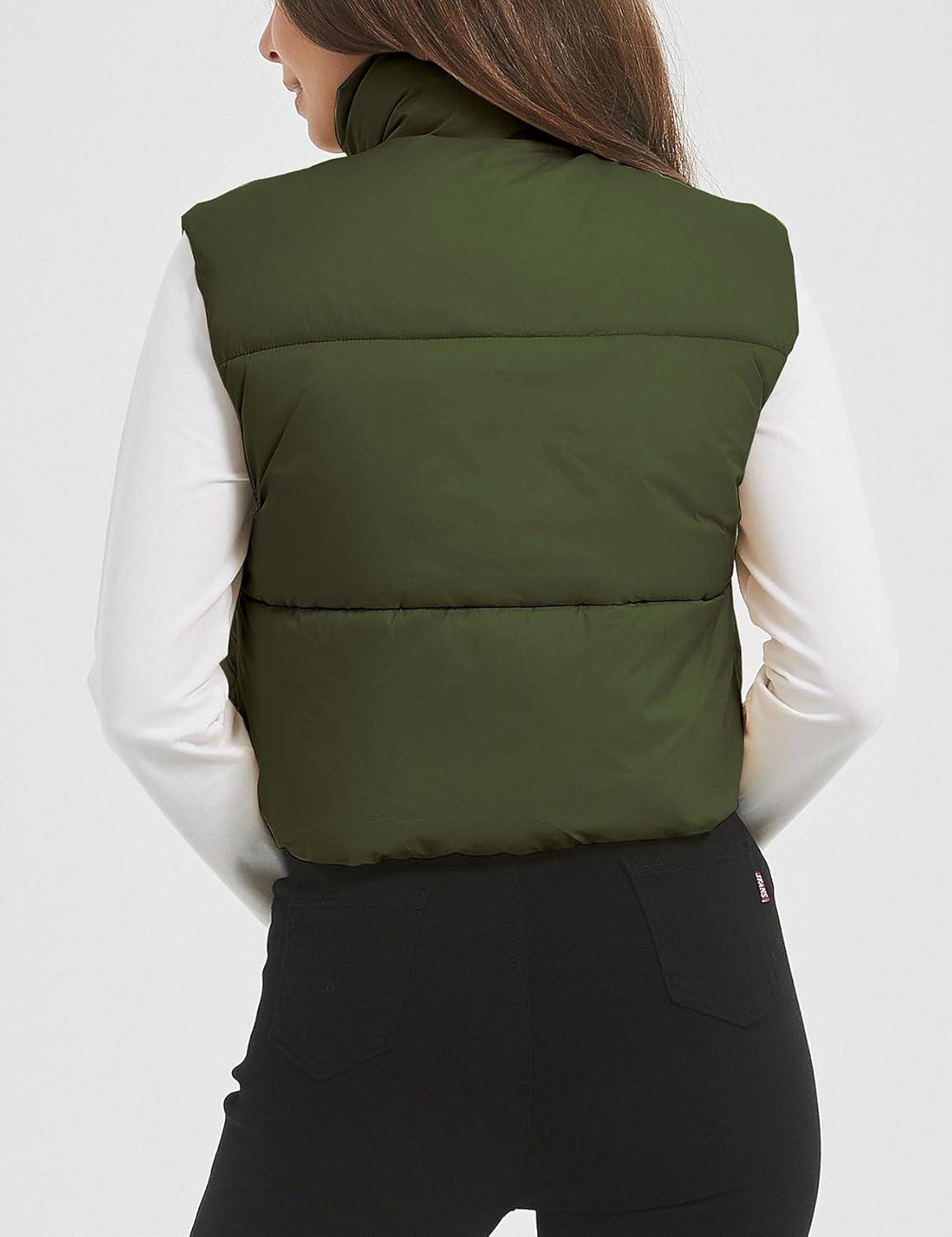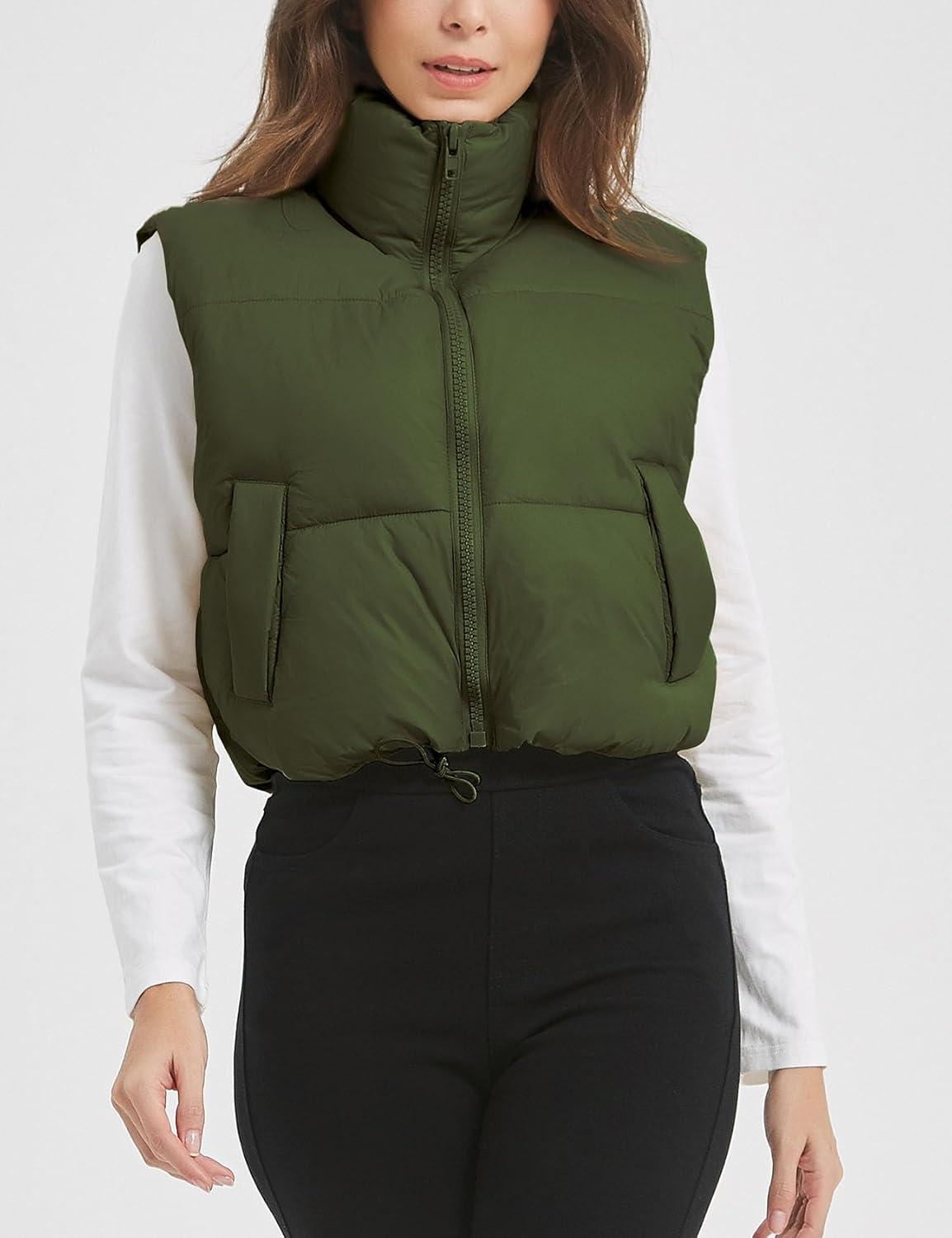 Flygo Puffer Vest Women Cropped Vest Zip Up Stand Collar Sleeveless Lightweight Winter Down Vests Jacket(Army Green)