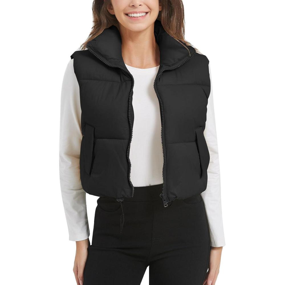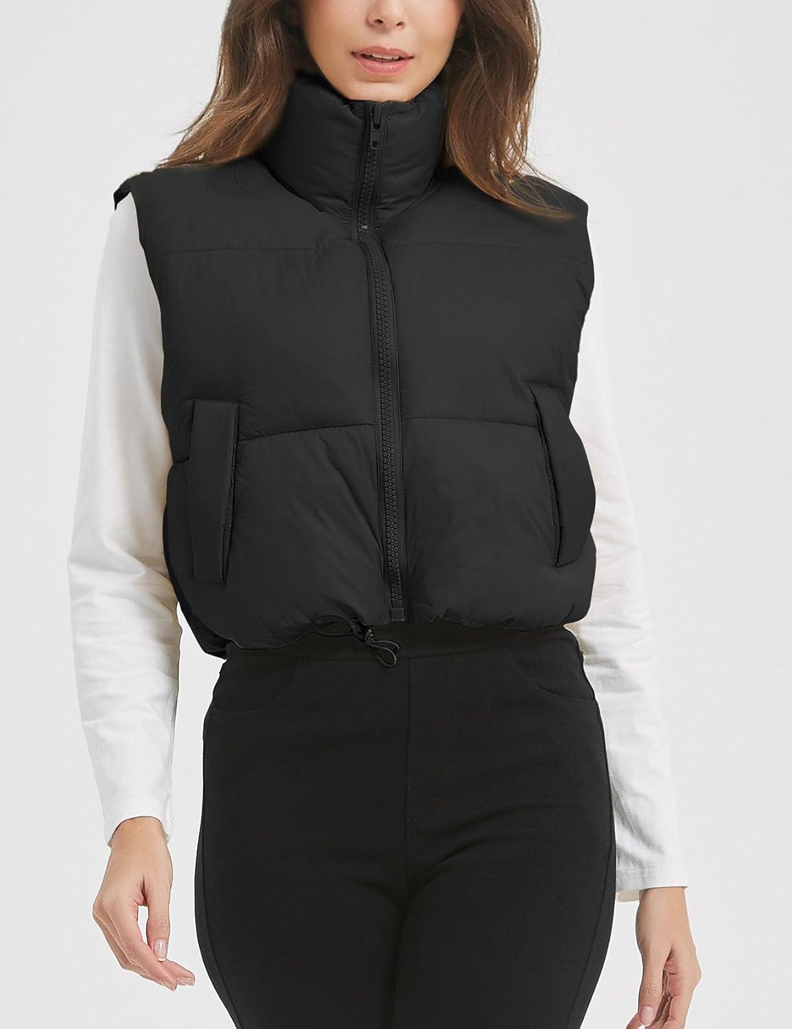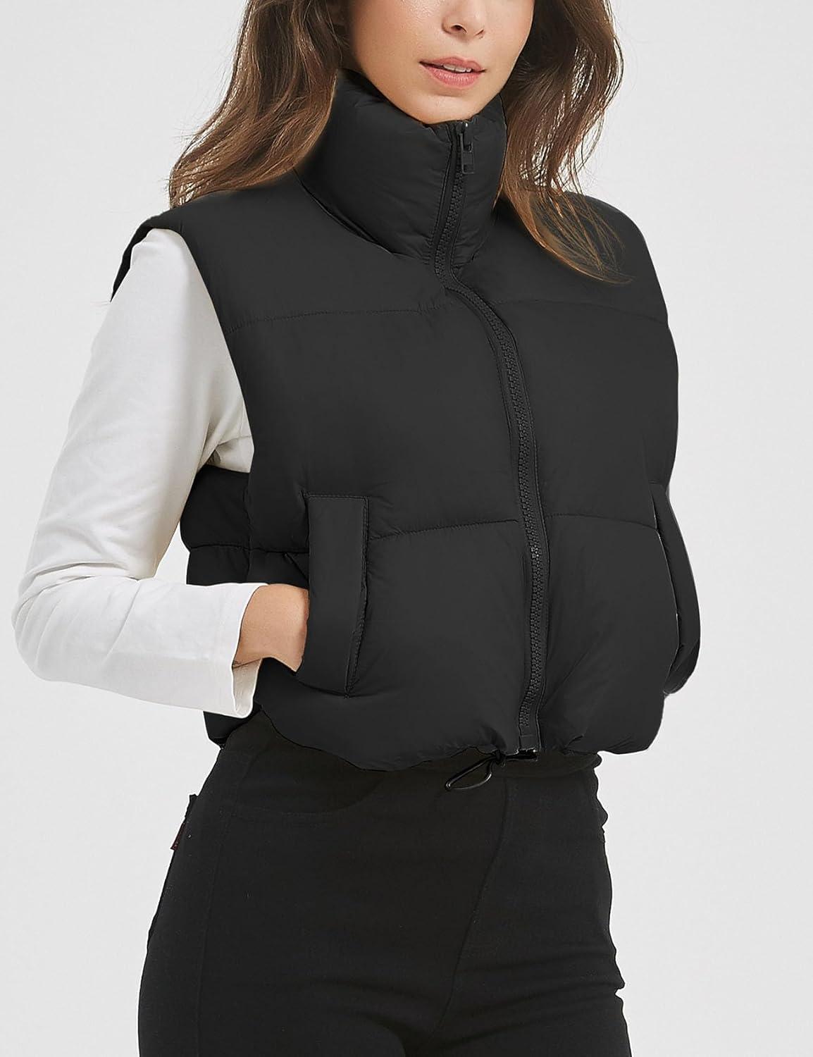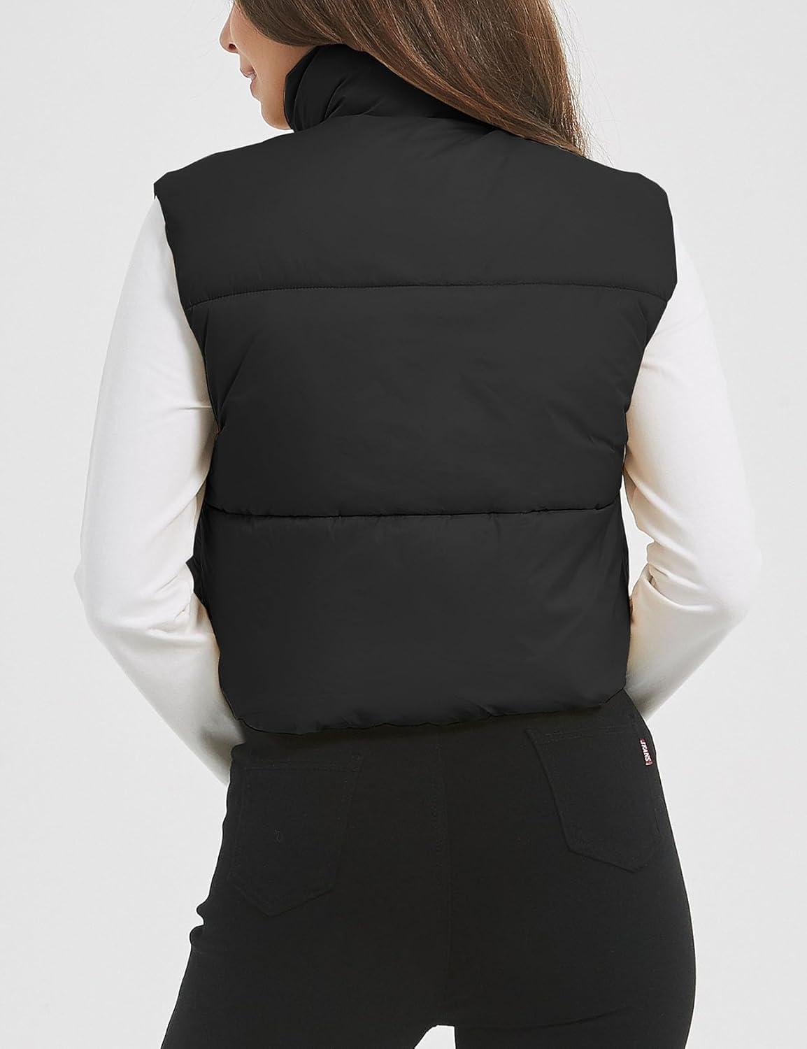 Flygo Puffer Vest Women Cropped Vest Zip Up Stand Collar Sleeveless Lightweight Winter Down Vests Jacket(Black)