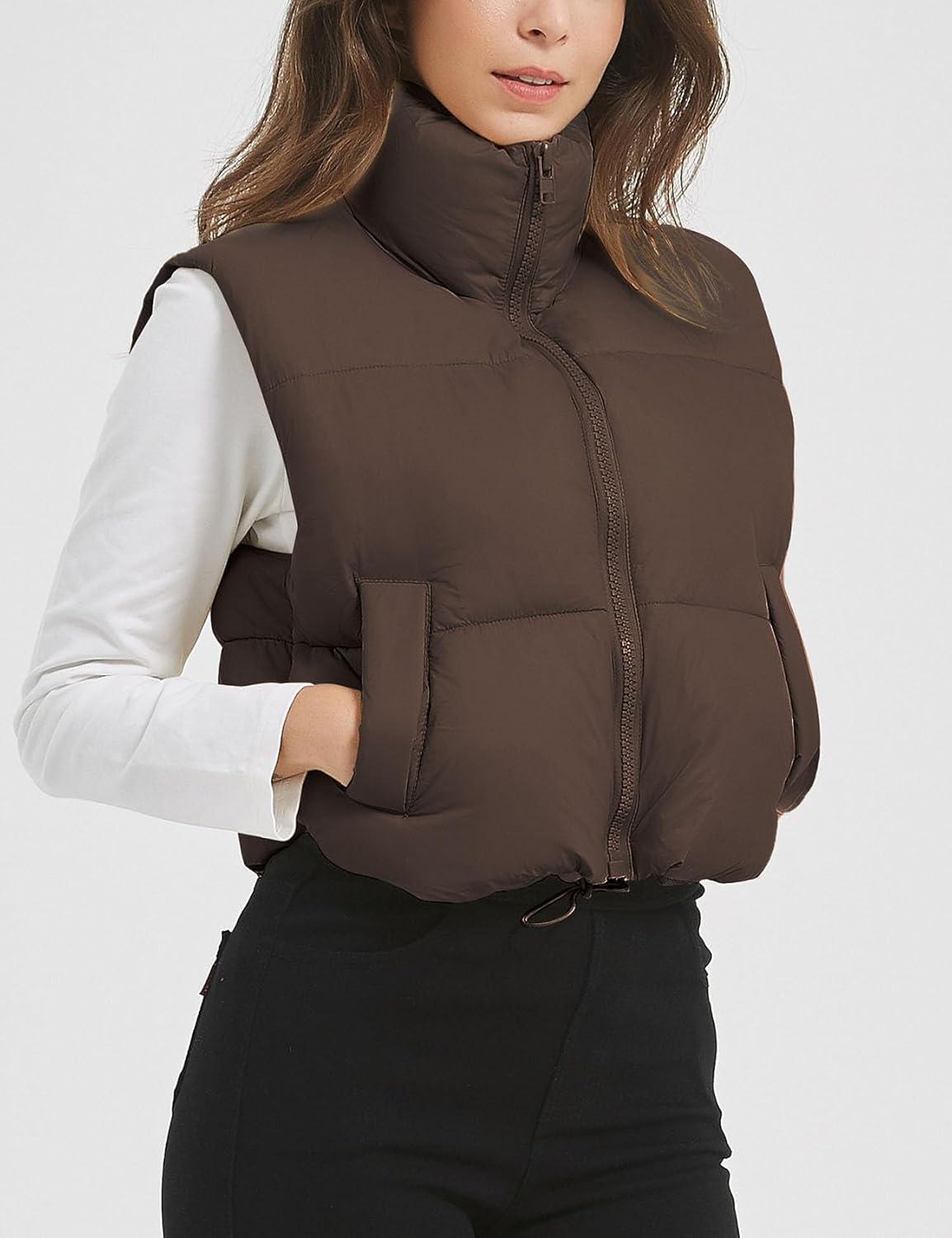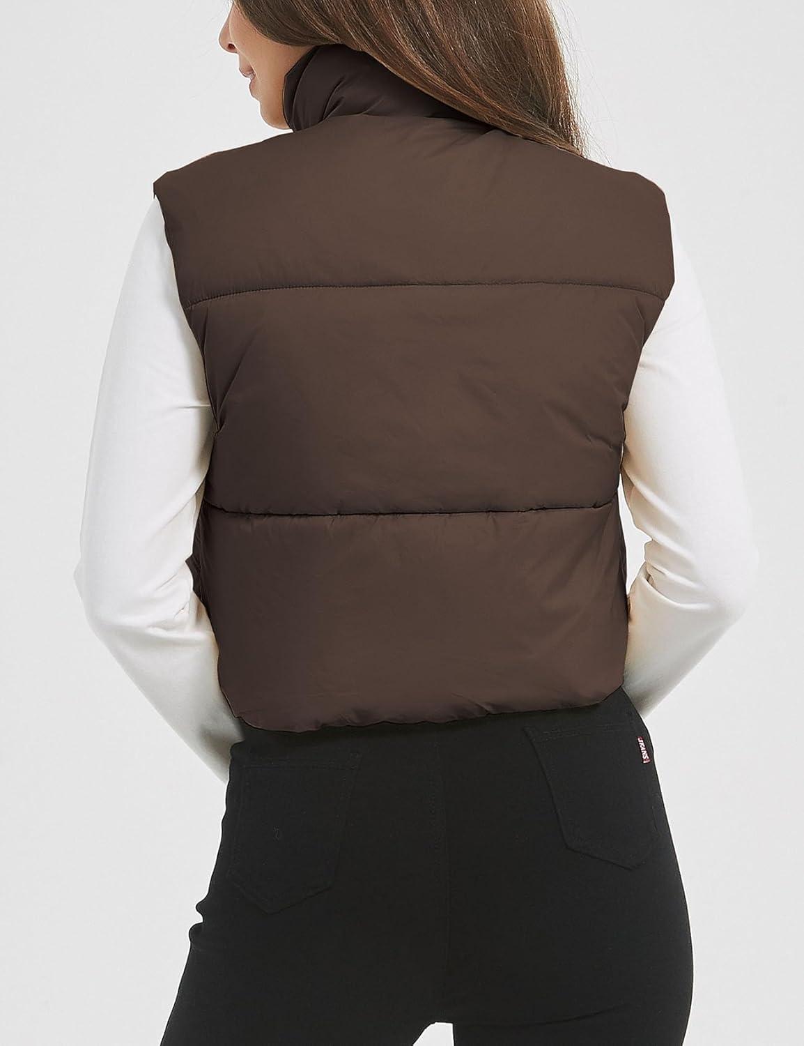 Flygo Puffer Vest Women Cropped Vest Zip Up Stand Collar Sleeveless Lightweight Winter Down Vests Jacket(Brown)