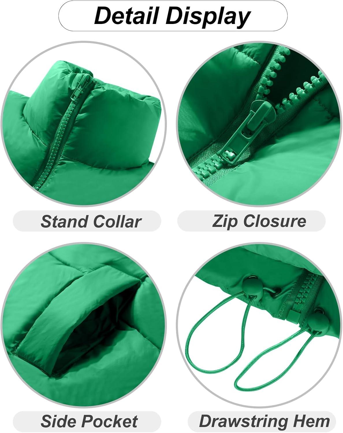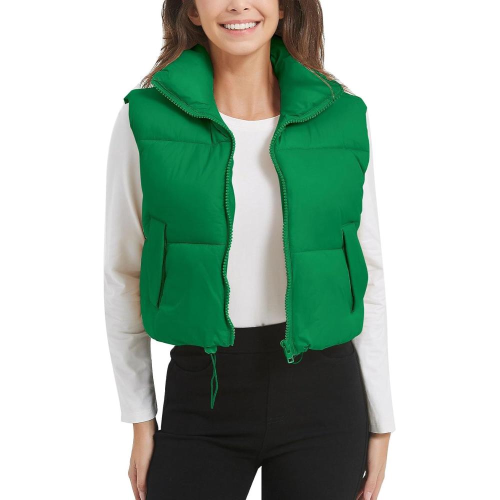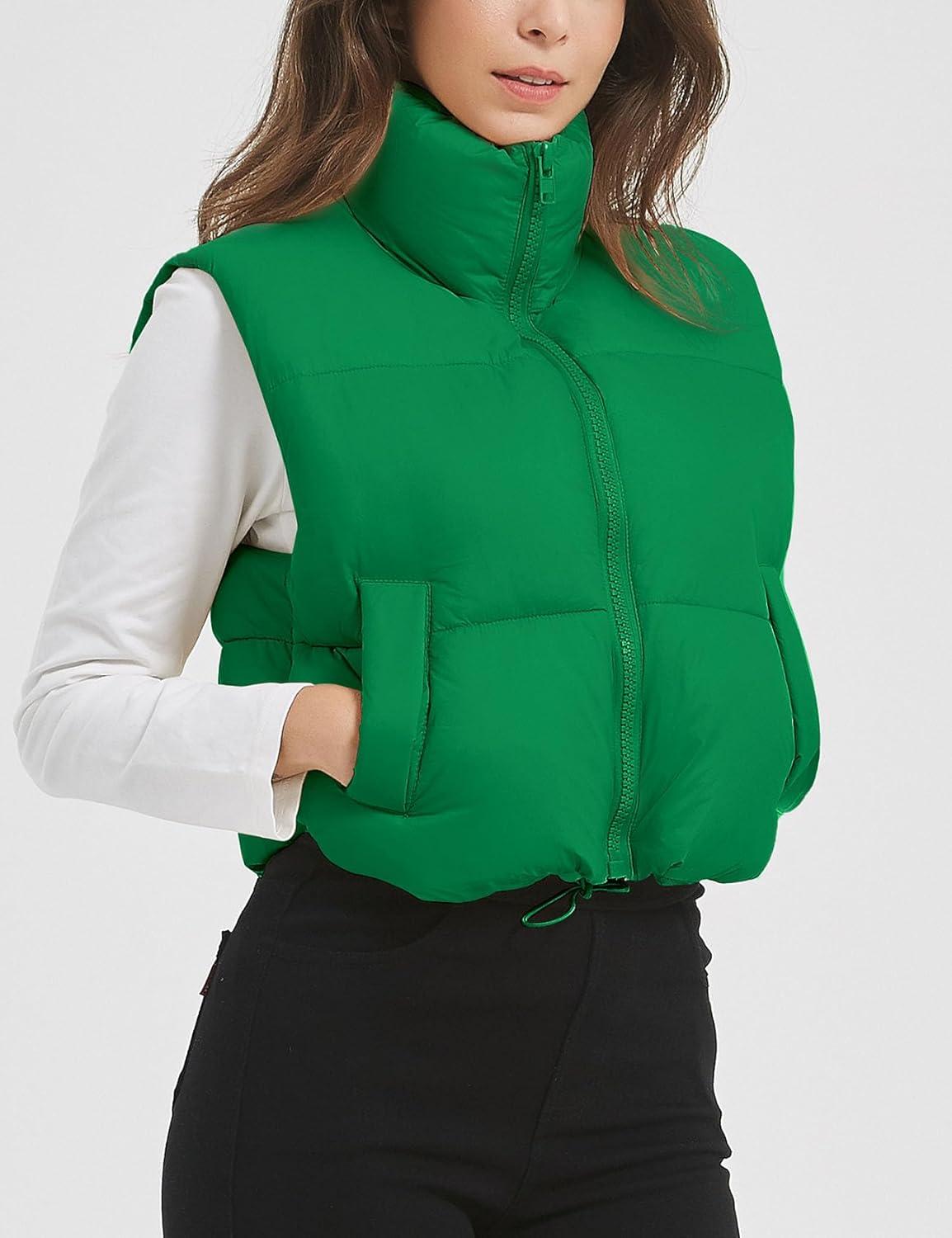 Flygo Puffer Vest Women Cropped Vest Zip Up Stand Collar Sleeveless Lightweight Winter Down Vests Jacket(Green)