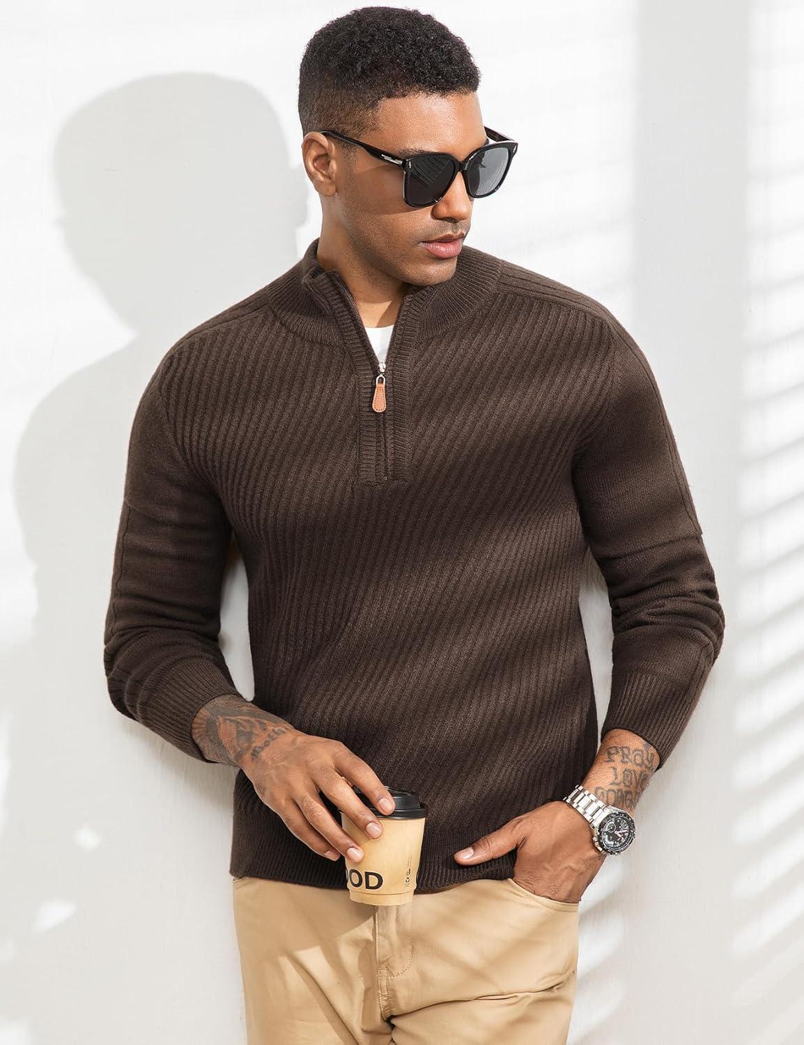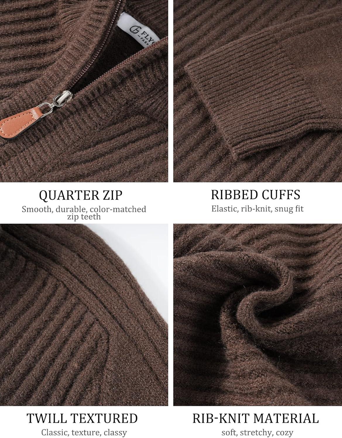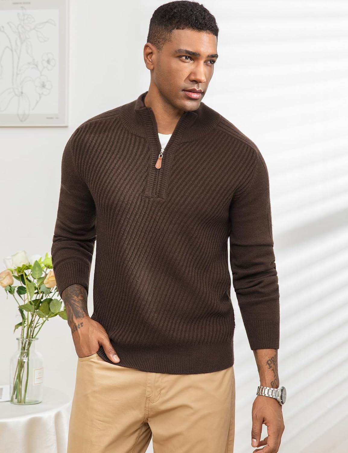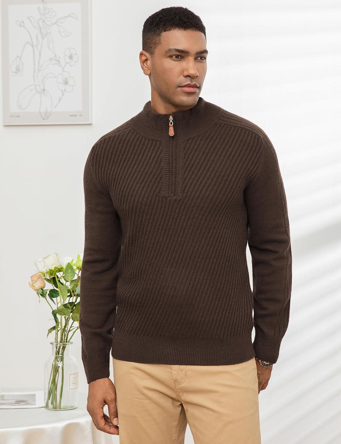 Flygo Quarter Zip Pullover Sweaters for Men Casual Long Sleeve Knitted Textured Mock Neck Polo Sweater(Brown)