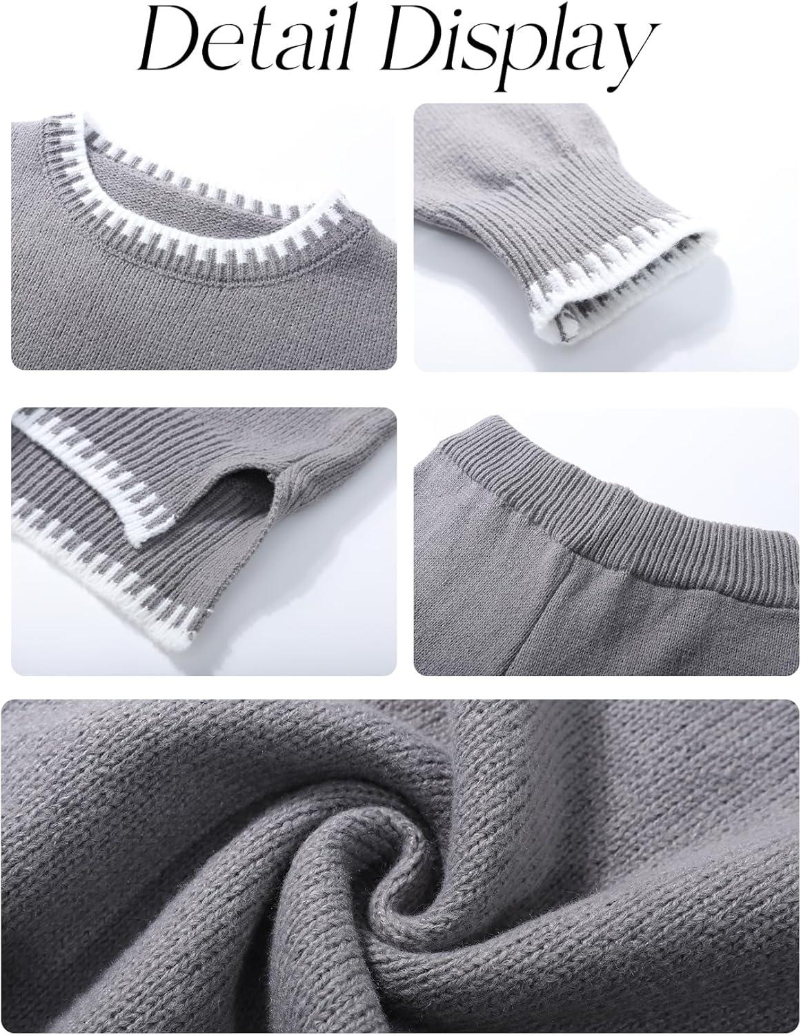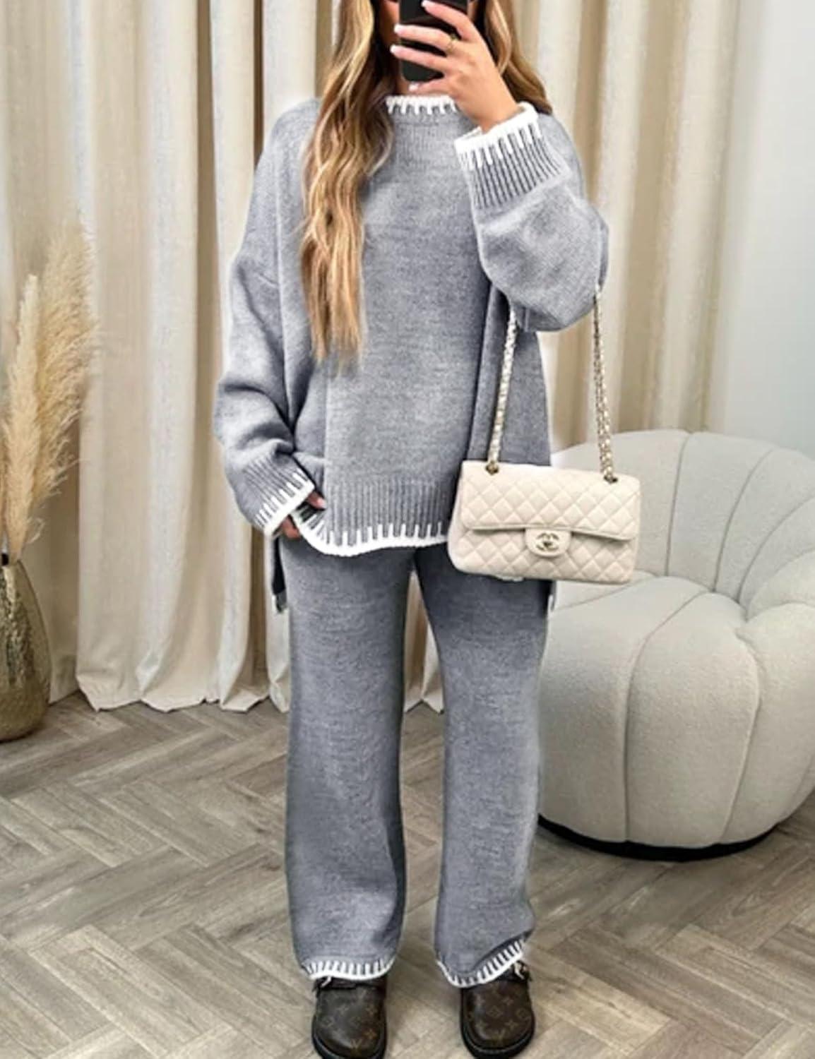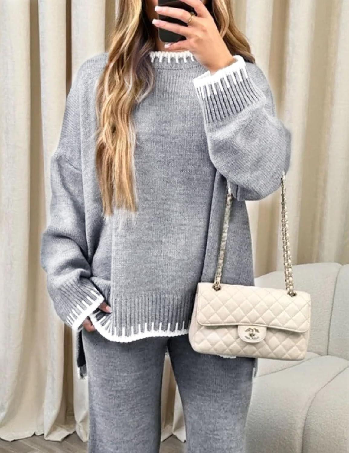 Flygo Sweater Sets Women 2 Piece Outfits Long Sleeve Pullover Sweater Tops Wide Leg Pants Lounge Set Tracksuits(Grey)