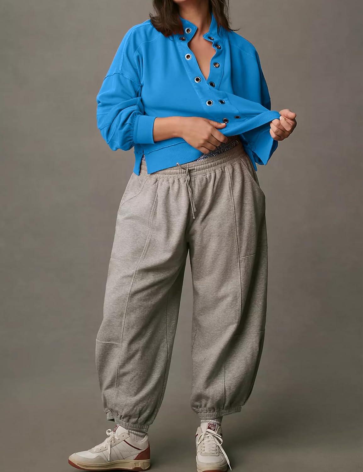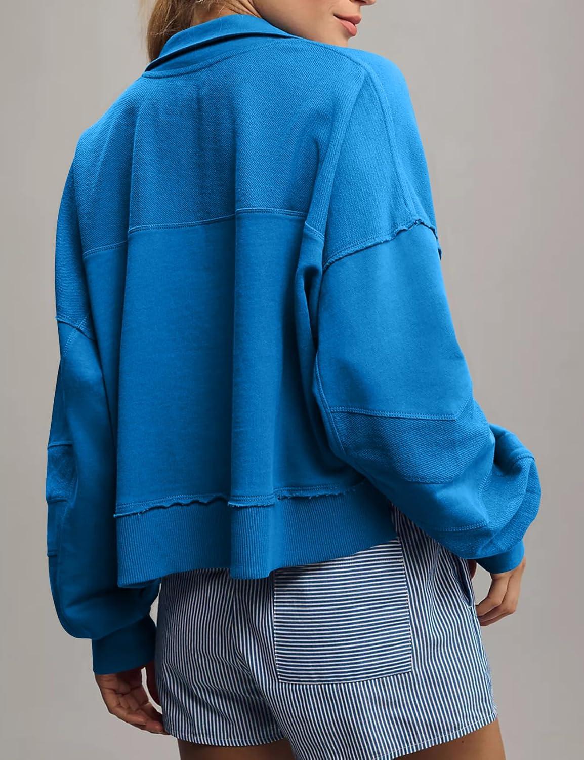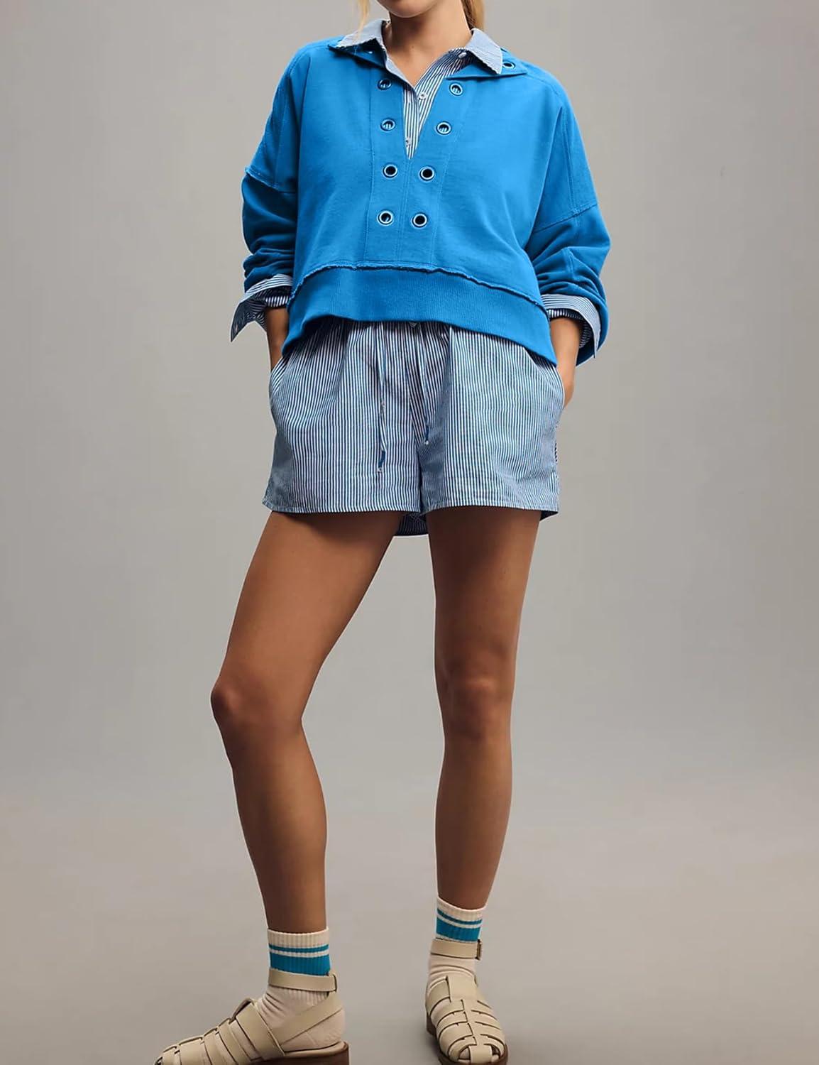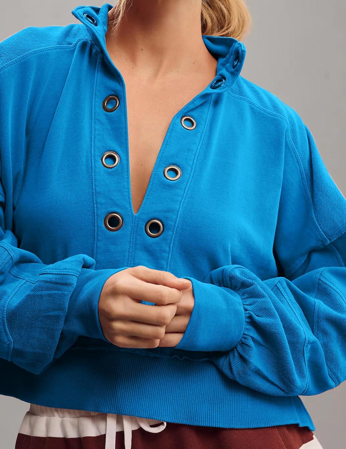Flygo Sweatshirt for Women Pieced Popover Henley Top Cropped Lapel V Neck Pullover Oversized Sweatshirts 2024 Trendy(Blue-S)