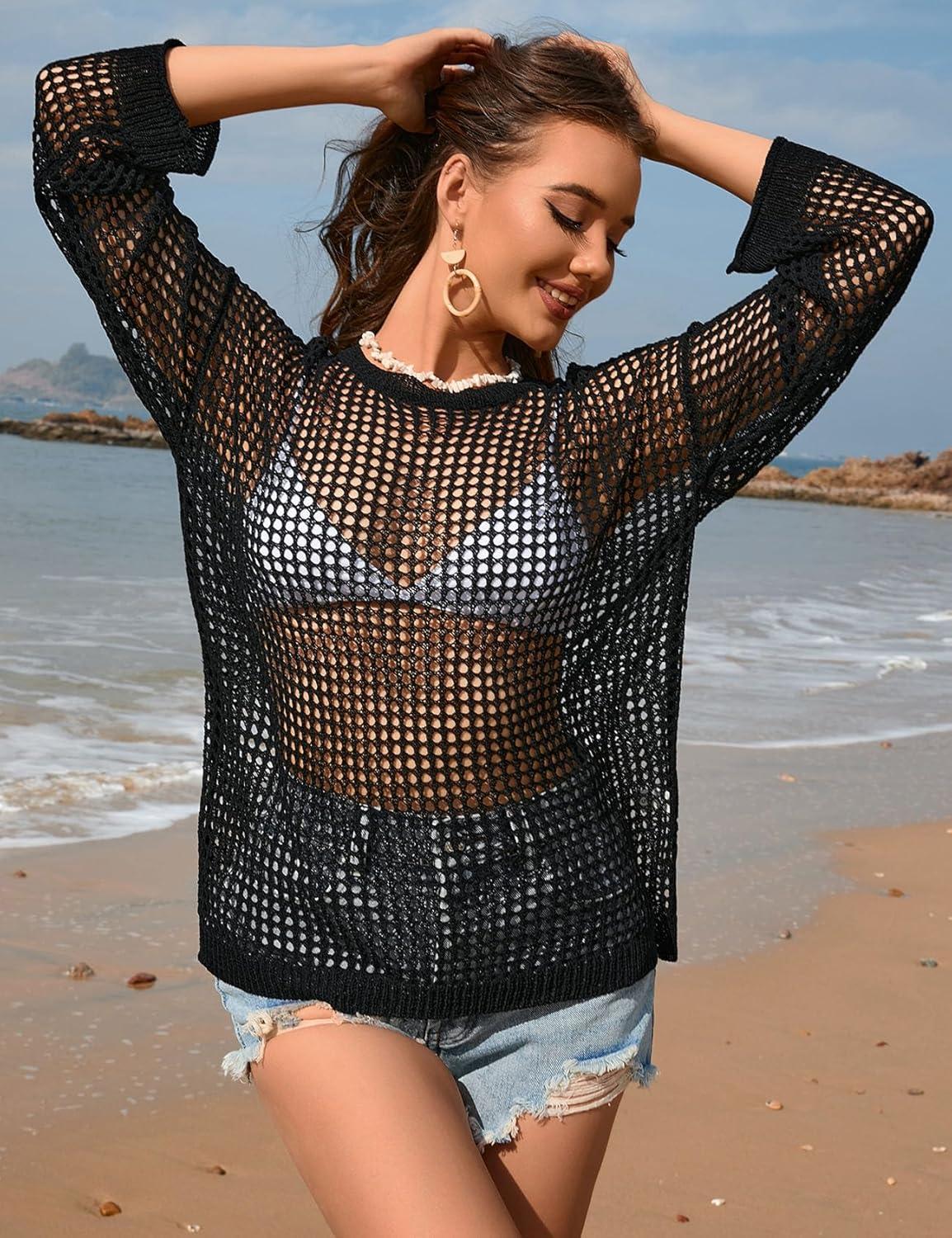 Flygo Swimsuit Coverup for Women Crochet Beach Cover Ups Summer Bathing Suit Cover Up Knit Beach Dress Vacation Outfits(Black)