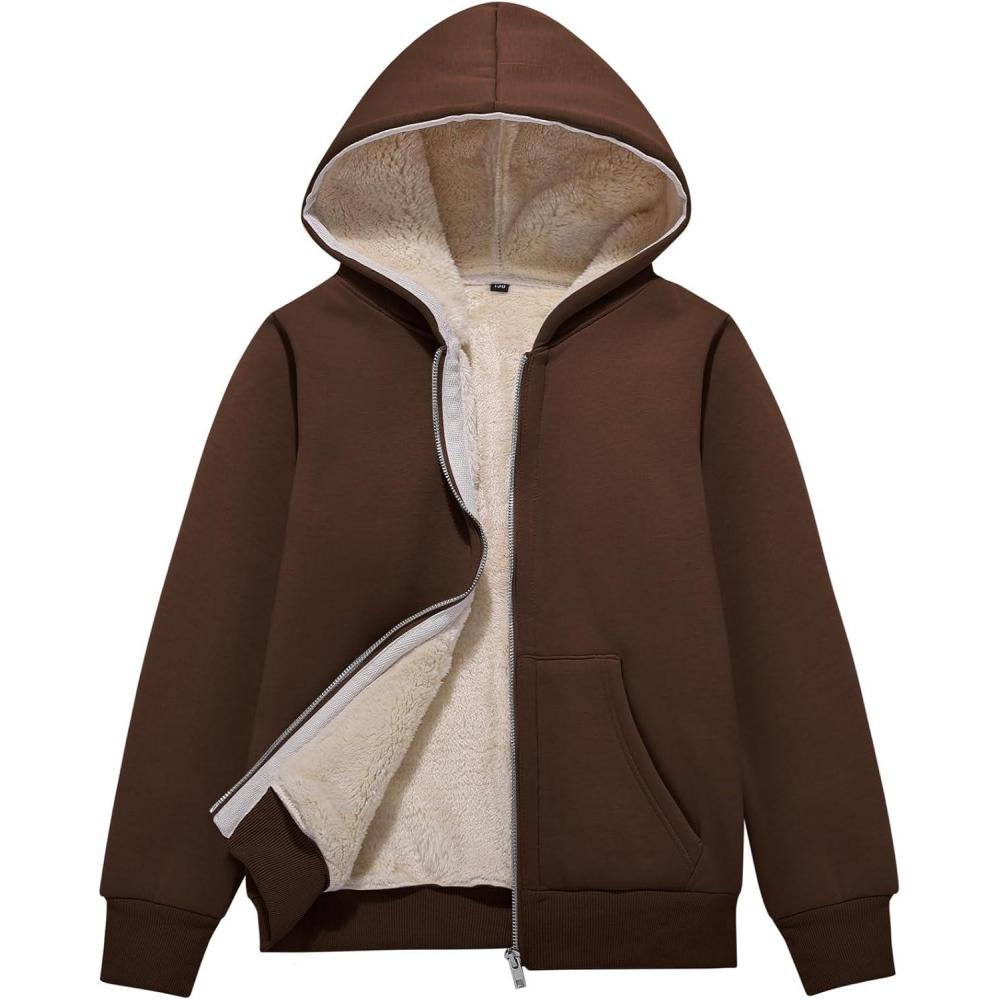 Flygo Unisex Boys Girls Fleece Jacket Hoodie Sherpa Lined Zip Up Hooded Sweatshirt Kids Winter Jackets(Brown)