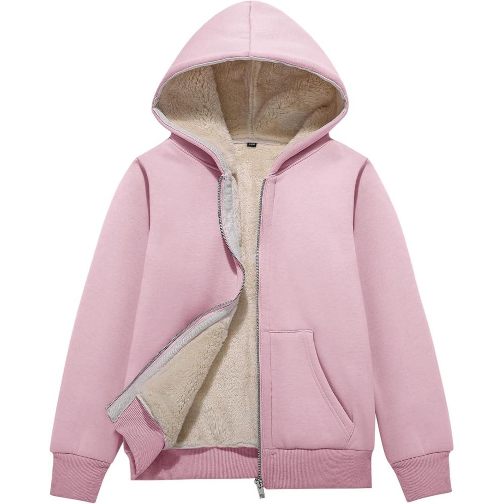 Flygo Unisex Boys Girls Fleece Jacket Hoodie Sherpa Lined Zip Up Hooded Sweatshirt Kids Winter Jackets(Pink)