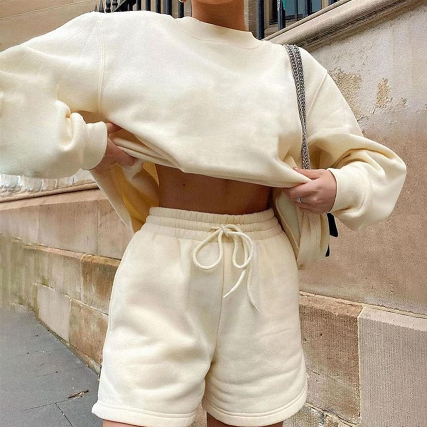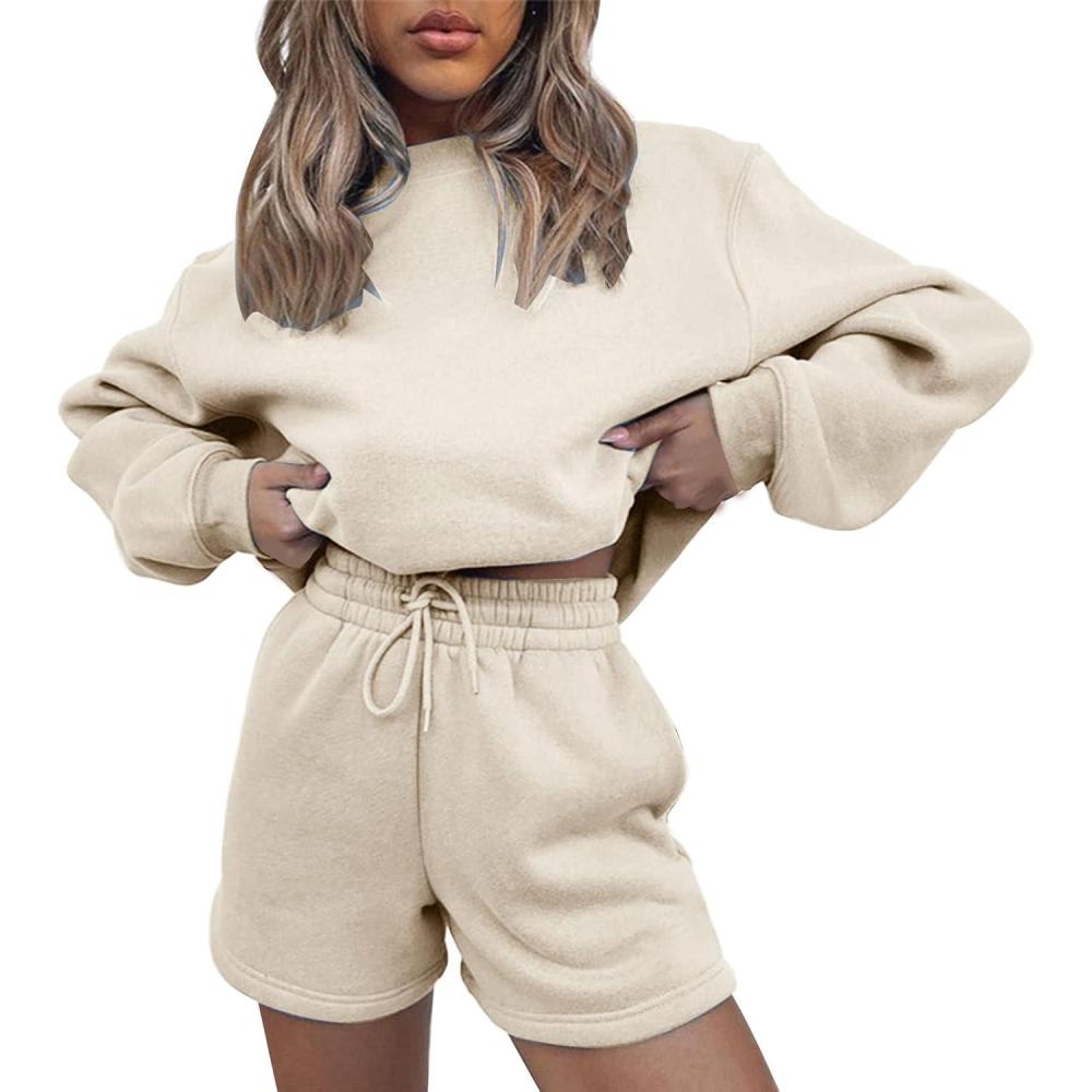 Flygo Women 2 Piece Tracksuits Outfits Fleece Oversized Jogging Suit Cropped Pullover Tops Shorts(Apricot)