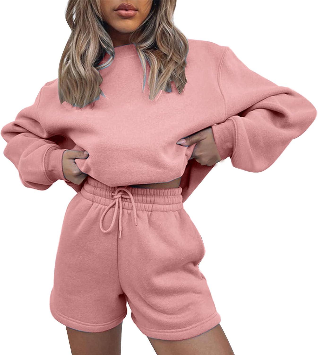 Womens casual sexy 2 two piece fleece outfits loungewear outwear pajama set oversized spring fall tracksuit outfits fitness suits long sleeve matching lounge set crop tops gym jogger jogging suits sweatsuit sweatshirt shorts for women girls。