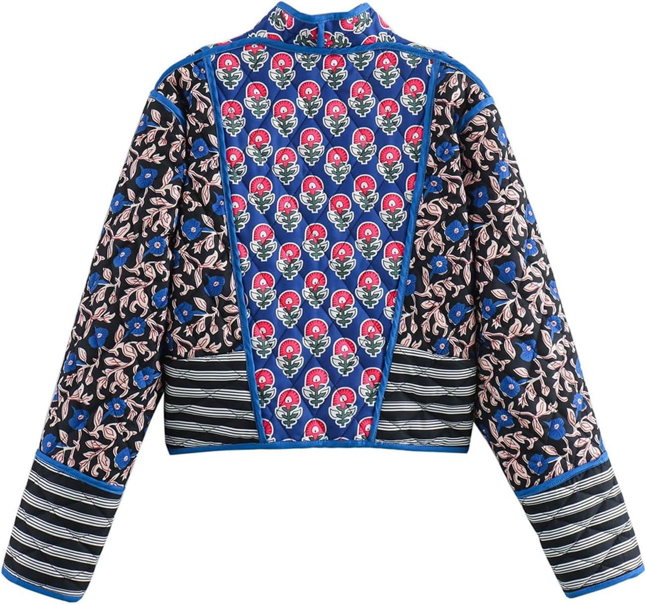 Flygo Women Cropped Puffer Jacket Cardigan Floral Printed Quilted Coats Lightweight Open Front Crop Padded Down Jackets(01 Blue)