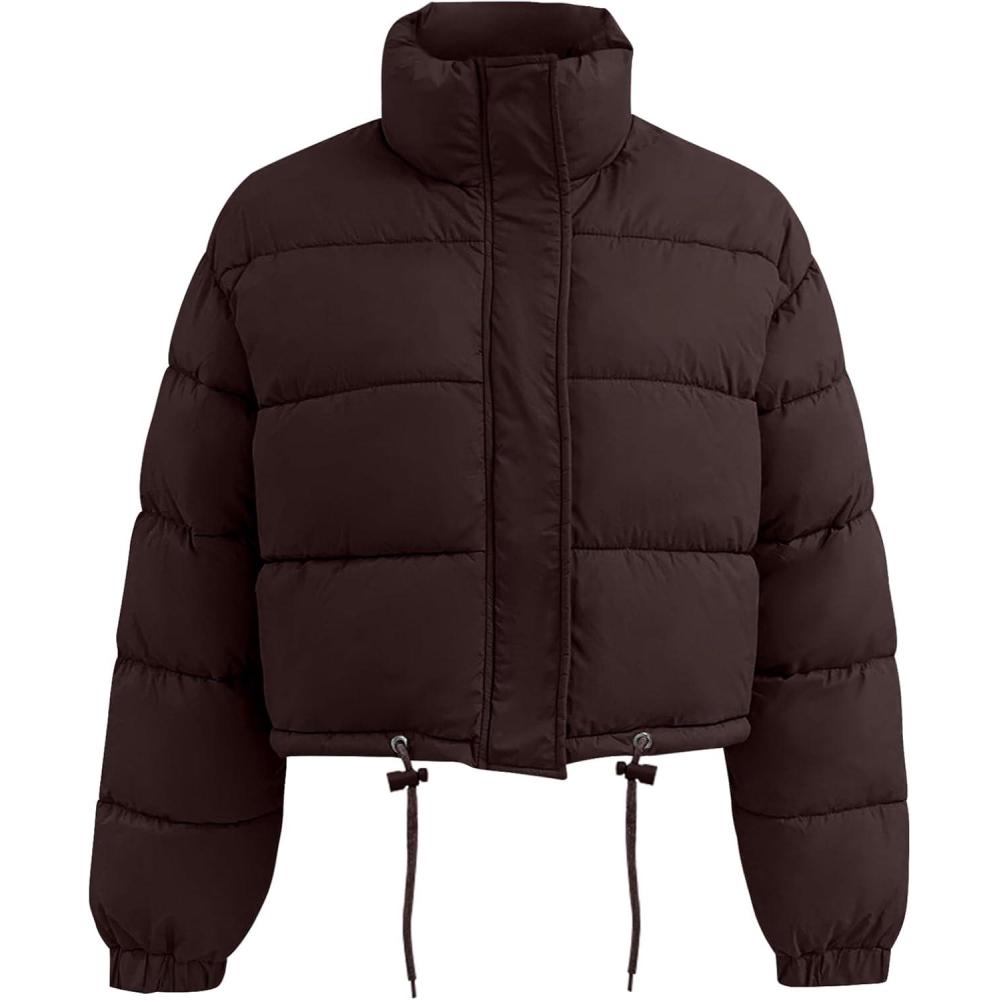 Flygo Women Cropped Puffer Jacket Winter Long Sleeve Quilted Puffy Bubble Padded Short Coats with Drawstring(Coffee)
