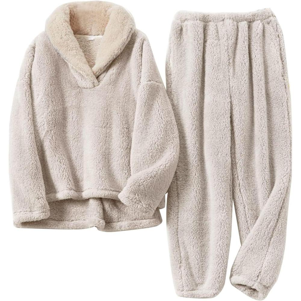 Flygo Women Fuzzy Warm Fleece Pajamas Sets Winter Flannel Sleepwear Fluffy Pajama Pullover Top Lounge Pants Set(Beige)